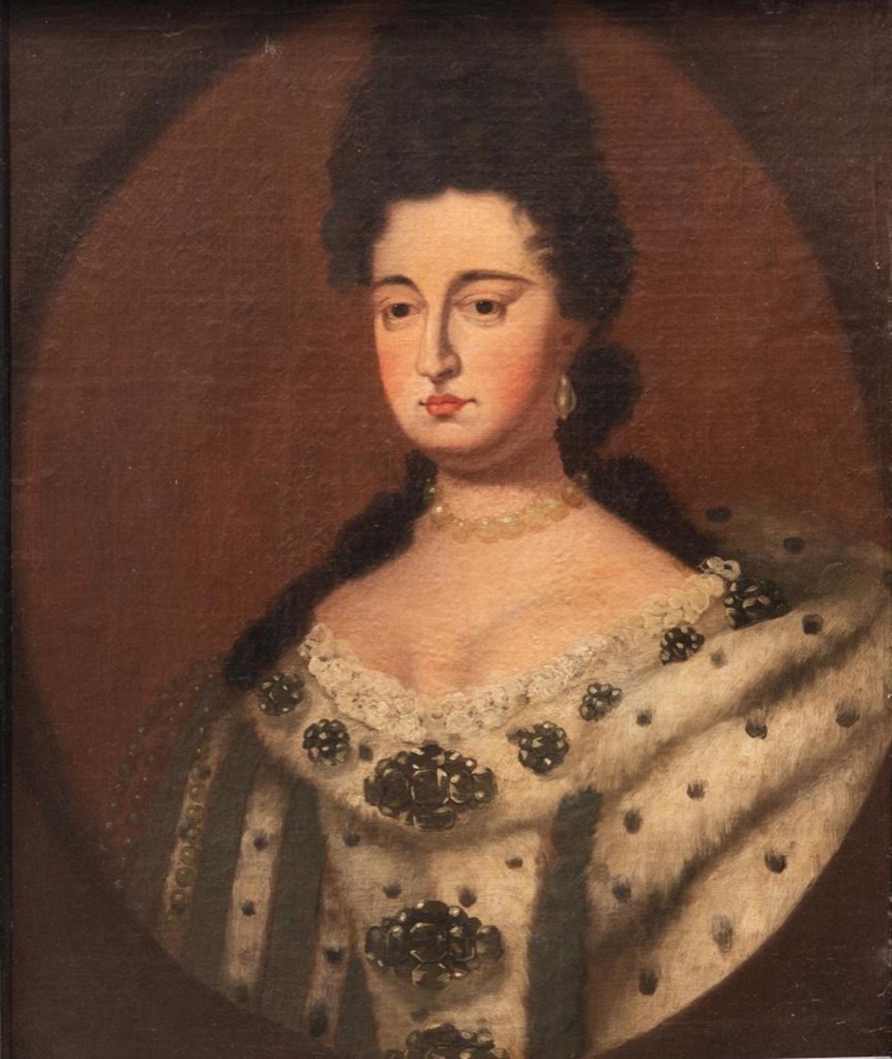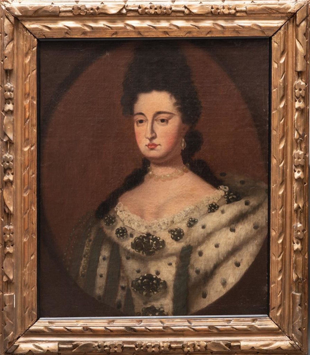 Sir Godfrey Kneller (Attrib) Portrait of Queen Anne. Old Master oil painting on canvas re-mounted to board, Unsigned. 31.5 x 36 Framed Approx