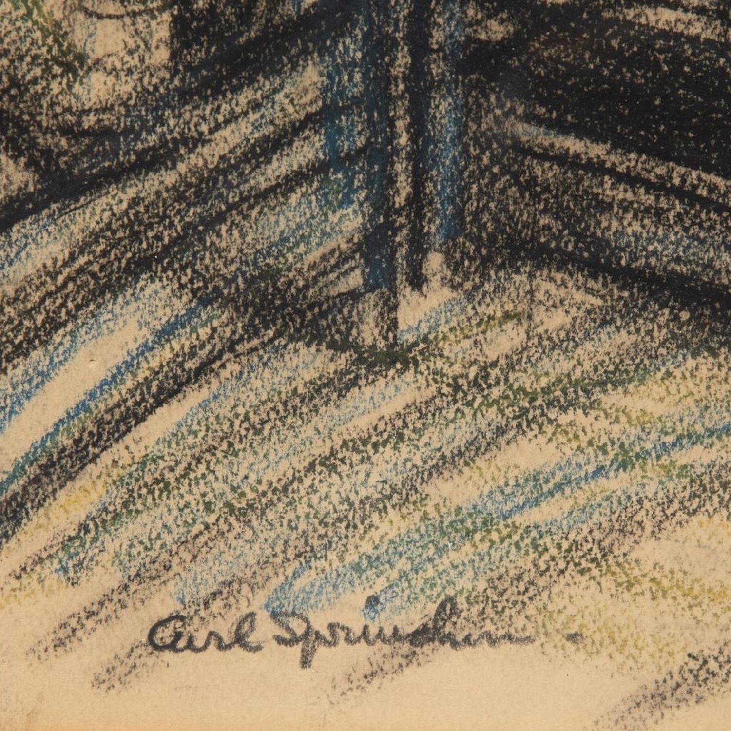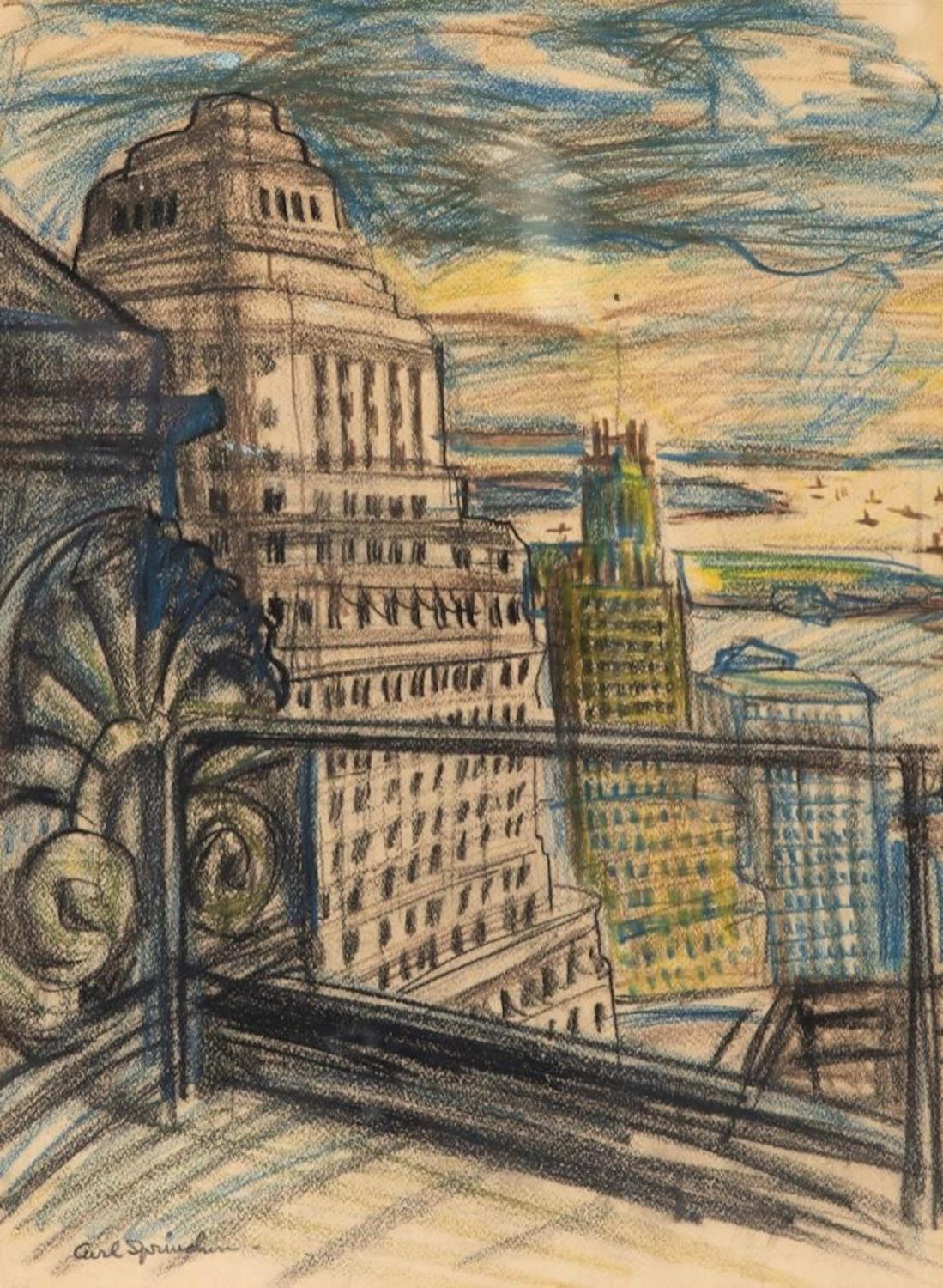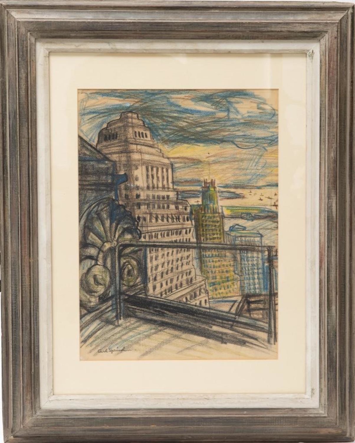 Carl Sprinchorn Mixed Media crayon & pastel on paper depicting view of New York City building, original signature lower left. Image: 19" H x 13.5" W; frame: 30.75" H x 24.5" W x 1.5" D. good condition overall