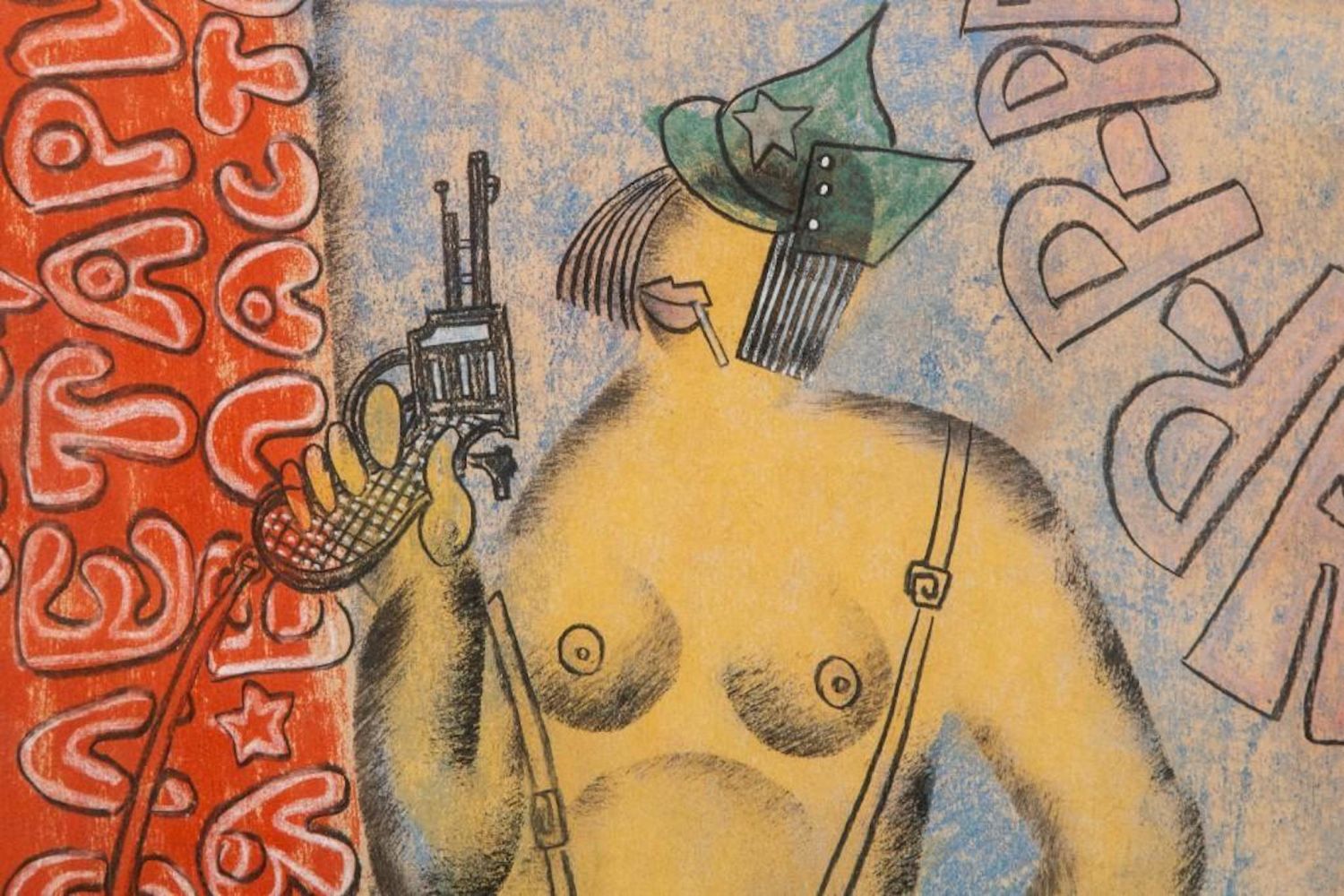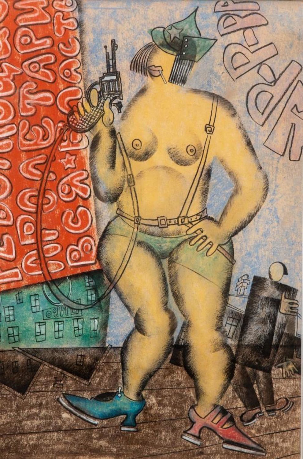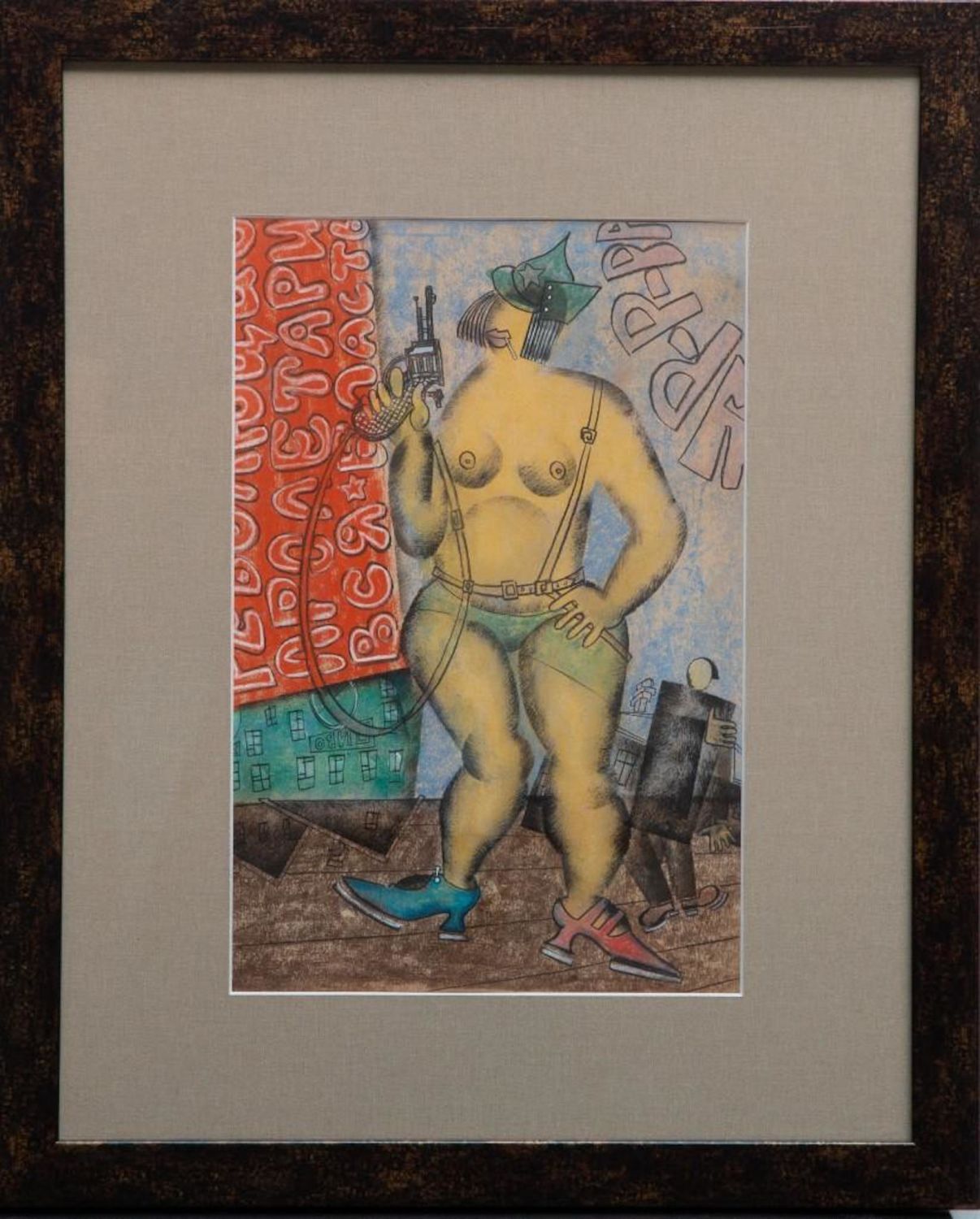 Pastel by Vladimir Lebedev, 1891-1967 lady and gun Unsigned. Measures 10.5"H x 14"W approx. and 16 x 20 framed Vladimir Vasilyevich Lebedev — was a Russian Avant Garde painter and graphic artist. He became famous for his exceptional illustrationsm of street life, political, social , propaganda and illustated poems Exhibited 3 times in the Museum of Modern Art in NY