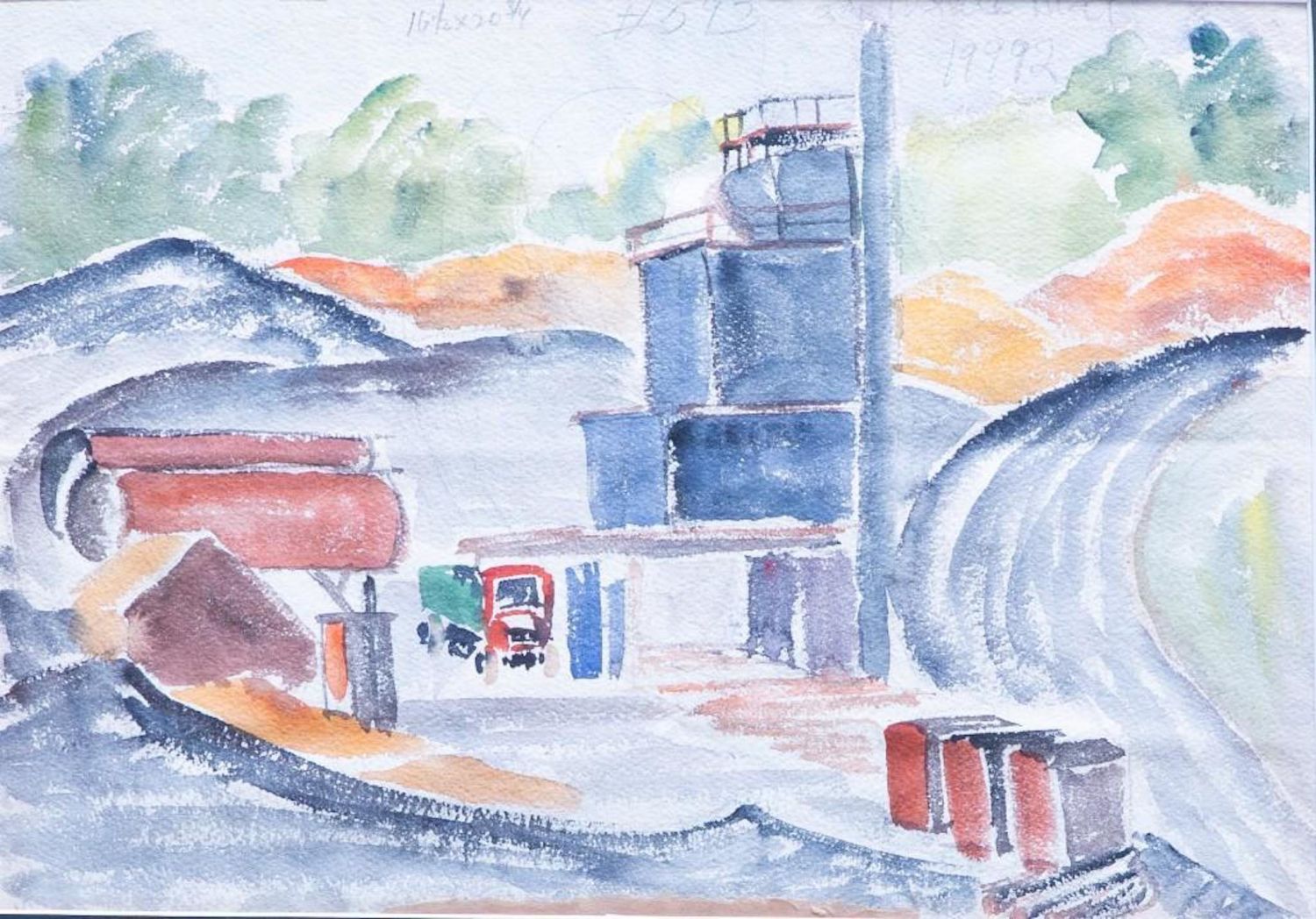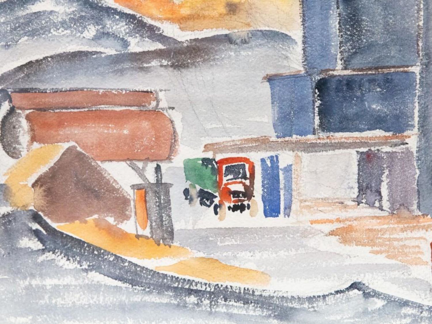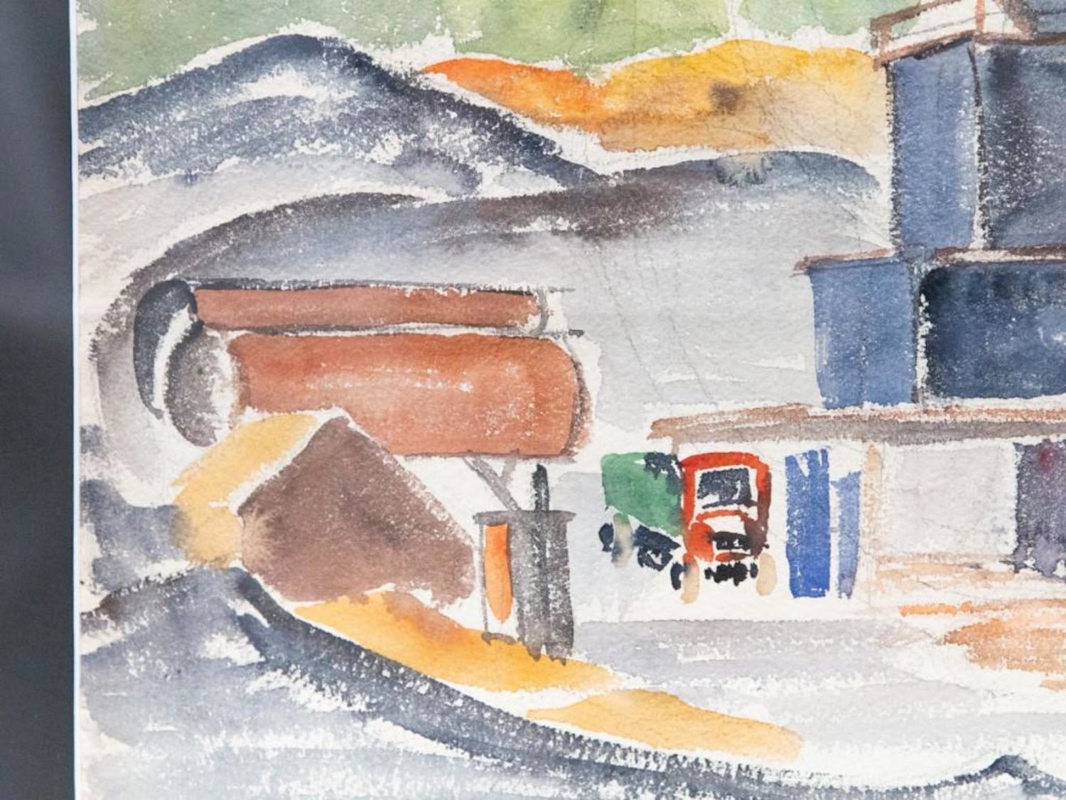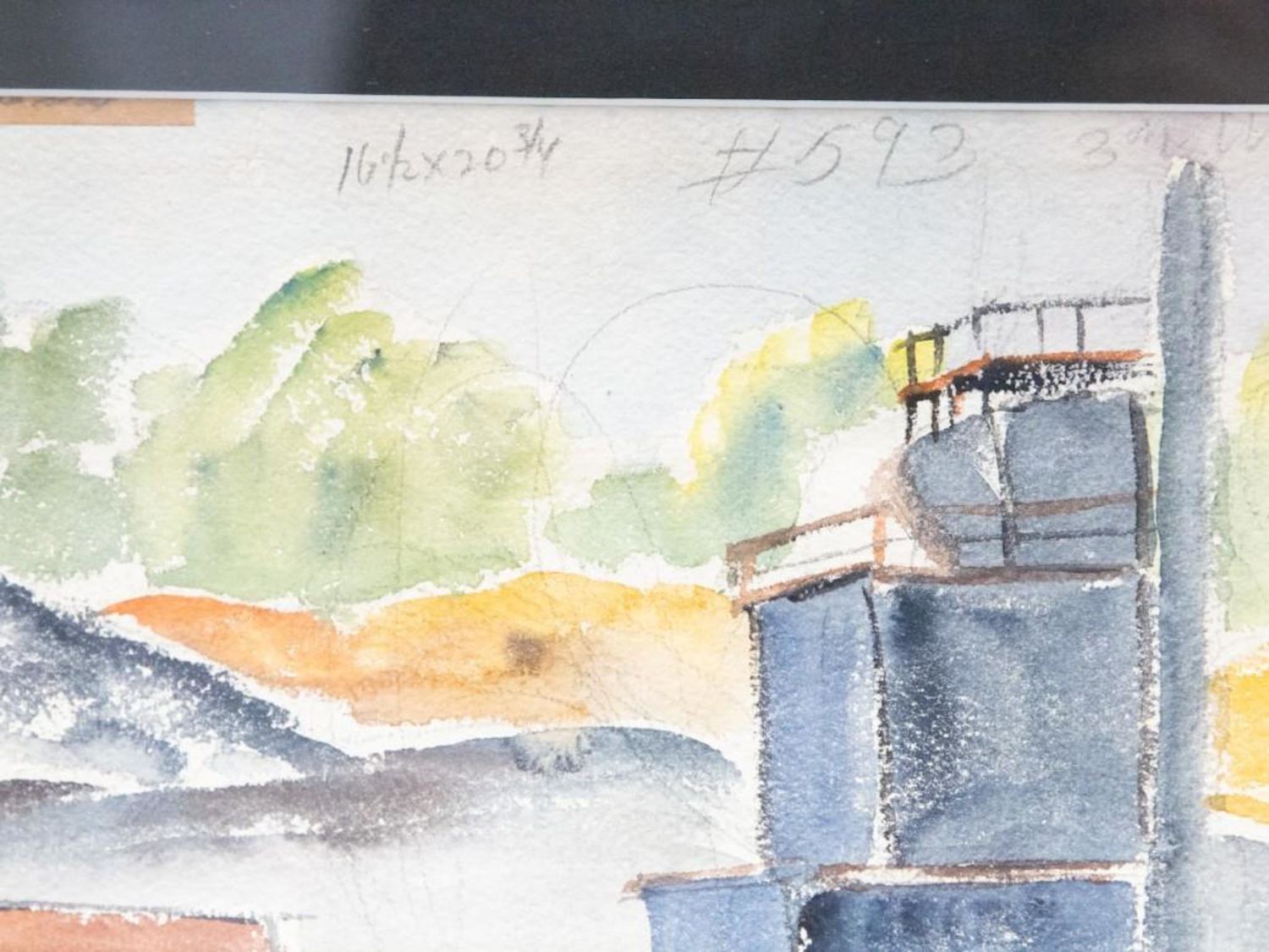 signed Charles Sheeler "Gravel Pit, " watercolor and gouache on paper, with rough sketch painting on verso, signed "Sheeler" lower right, 11.25"h x 14.5"w approx. It is framed ain a manner so works visible on both sides. in good condition. Sheeler traveled often to New York and began developing important relationships with dealers and collectors there and exhibiting in group shows, including the 1913 Armory Show. He was introduced to Alfred Stieglitz (American, 1864 – 1946), who admired his Doylestown photos and encouraged Sheeler to reevaluate his notions about photography and explore it as a valid artistic medium. He also met the art collectors Walter and Louise Arensberg, who introduced him to the artists and intellectuals in their circle, including Marcel Duchamp (American, born France, 1887 – 1968) and Man Ray (American, 1890 – 1976). In 1919 Sheeler moved to New York. The following year he collaborated with the photographer Paul Strand (American, 1890 – 1976) on the short film Manhatta, an avant-garde project that sought to apply techniques of still photography to a motion picture. Throughout the 1920s, Sheeler achieved both critical and financial success as a commercial photographer. In 1926 he was hired by Edward Steichen (American, 1879 – 1973) to work for Condé Nast publications, producing fashion and celebrity photographs for the magazines Vogue and Vanity Fair. One of the turning points in Sheeler’s career came the following year, when the Ford Motor Company hired him to photograph the company’s River Rouge Plant in Detroit, Michigan. Sheeler’s stark, stylized images of the factory complex won him critical acclaim and were widely reproduced as icons of American industry. That same year Sheeler and his wife Katharine moved to South Salem, a small town outside of New York. In 1931, the dealer Edith Halpert offered Sheeler exclusive representation at her Downtown Gallery in New York. She encouraged him to curtail his work in photography and focus his artistic energies on painting instead. Following a solo show at the Downtown Gallery, Sheeler promptly resigned from Condé Nast and turned his artistic attention toward oil, conté crayon, and tempera. Beginning in the late 1920s, Sheeler’s paintings and drawings appeared in important exhibitions at the Museum of Modern Art, the Arts Club of Chicago, and the Whitney Museum of American Art, among others. His work entered the collections of many of these institutions, as well as those of important collectors of American modernism, including the Arensbergs, Duncan Phillips, and Ferdinand Howland.