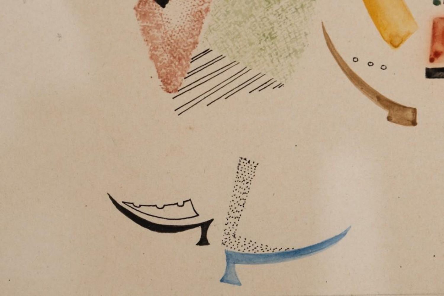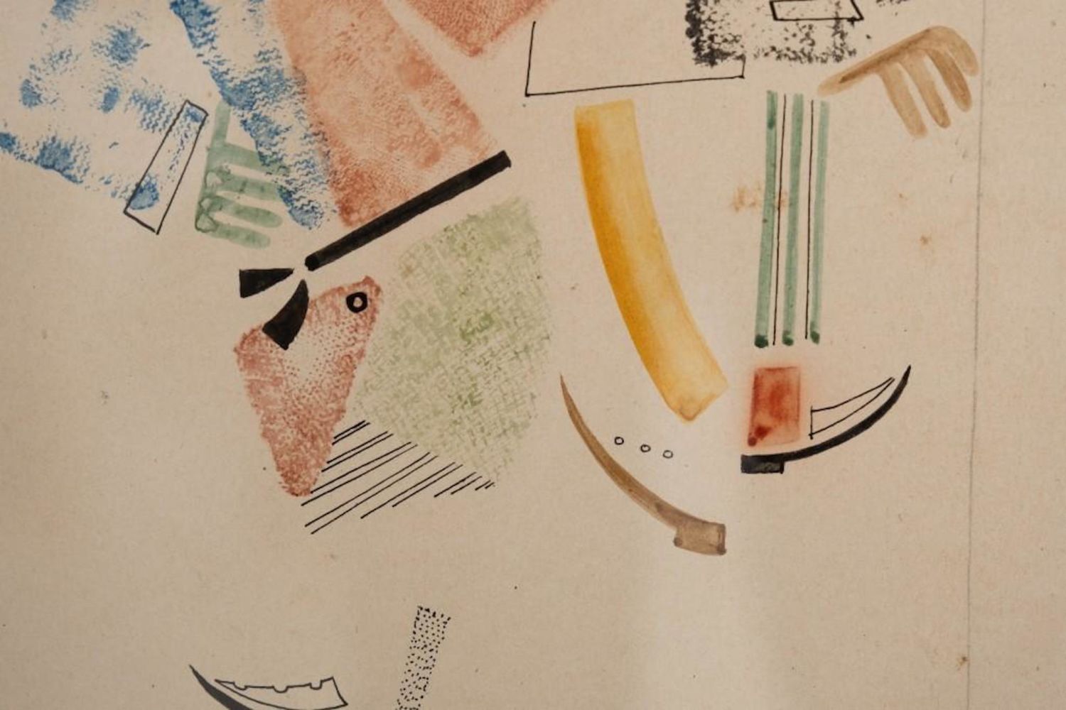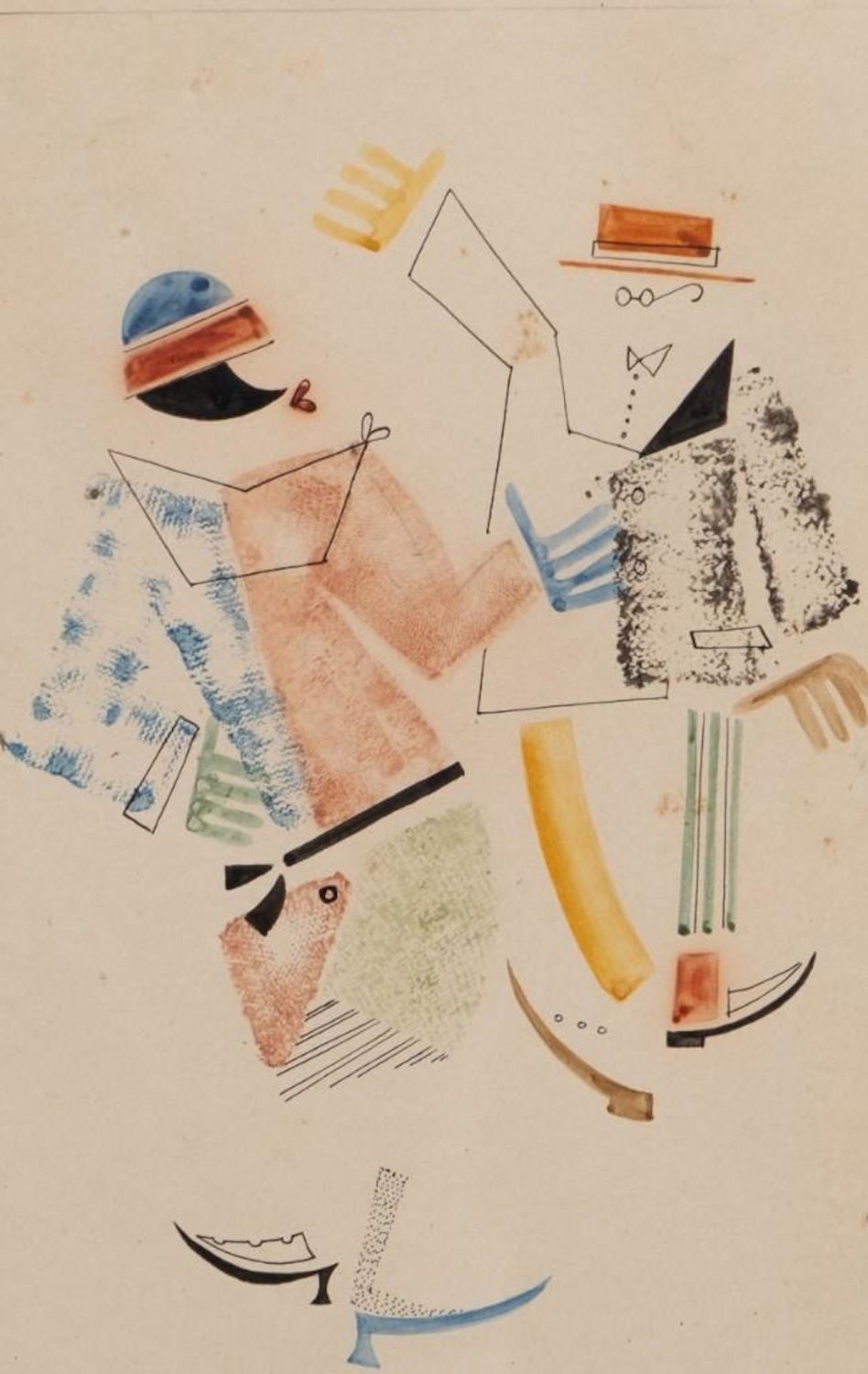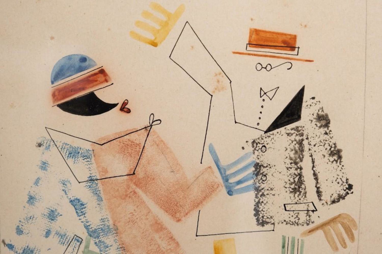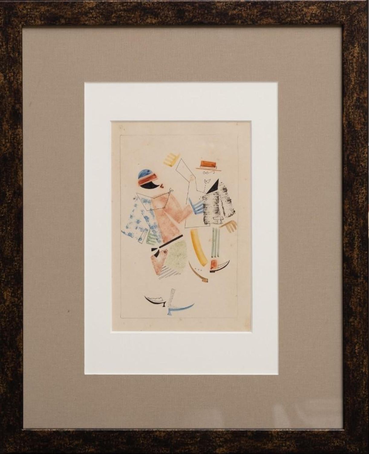 Vladimir Vasilievich Lebedev watercolor and ink on paper painting depicting a meeting of a woman and a man with round glasses. Unsigned. Vladimir Vasilyevich Lebedev (1891 – 1967) – Russian and Soviet avant-garde painter, poster and graphic artist, book and magazine illustrator, founder of the Leningrad school of book graphics. People’s Artist of the RSFSR (1966), Corresponding Member of the USSR Academy of Arts (1967). Dimensions: Matte size: 16 x 12 3/4 in.Image size: 10 1/8 x 6 3/4 in. Exhibited 3 times in the Museum of Modern Art in NY