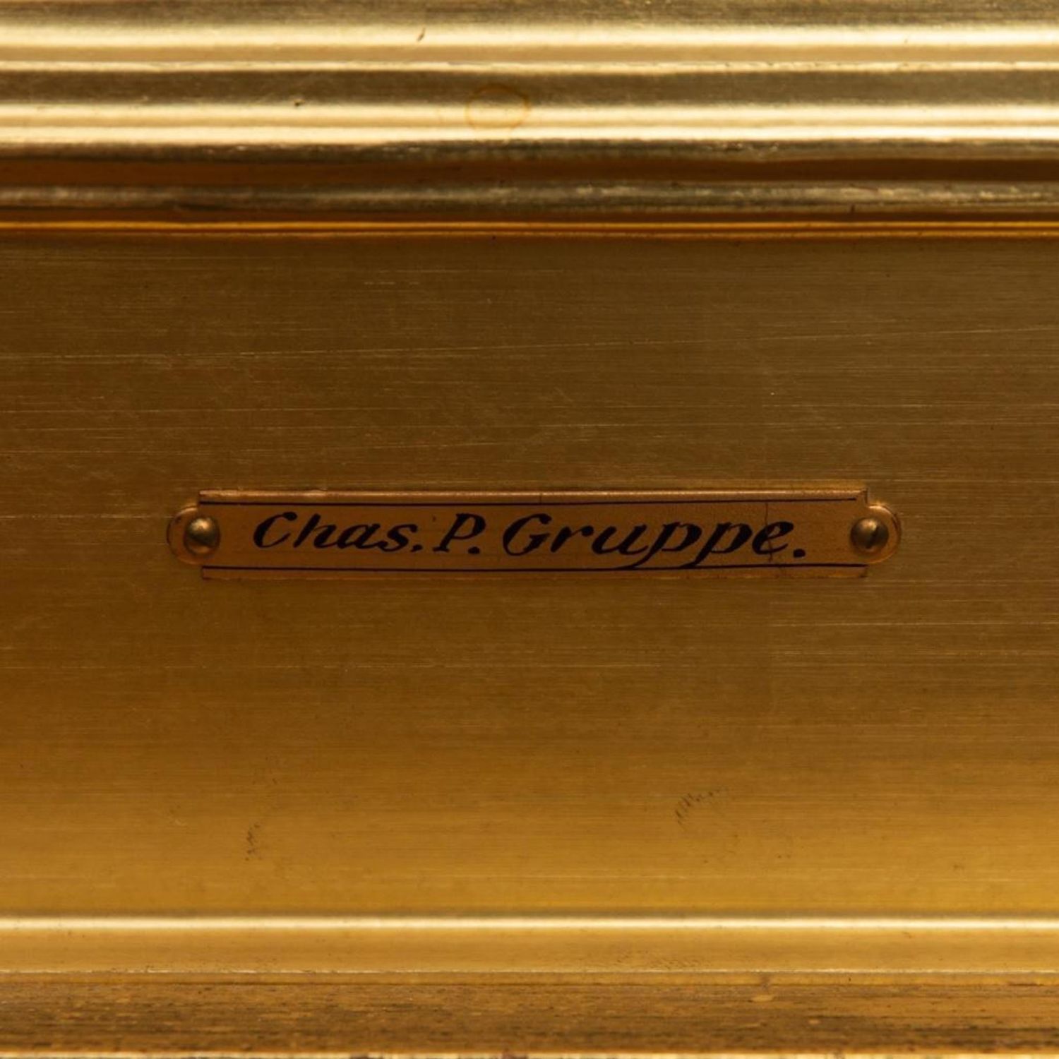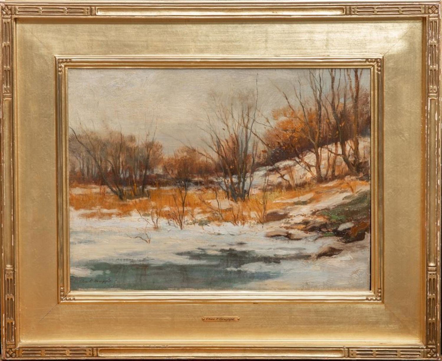 Charles Gruppe Antique American impressionist oil painting of a winter landscape by Charles Paul Gruppe (1860 – 1940). Oil on board, circa 1900. Housed in a great period giltwood arts and crafts frame. Image size, 16L x 12H art approx. 19 x 23 x 2 in" frame Approx