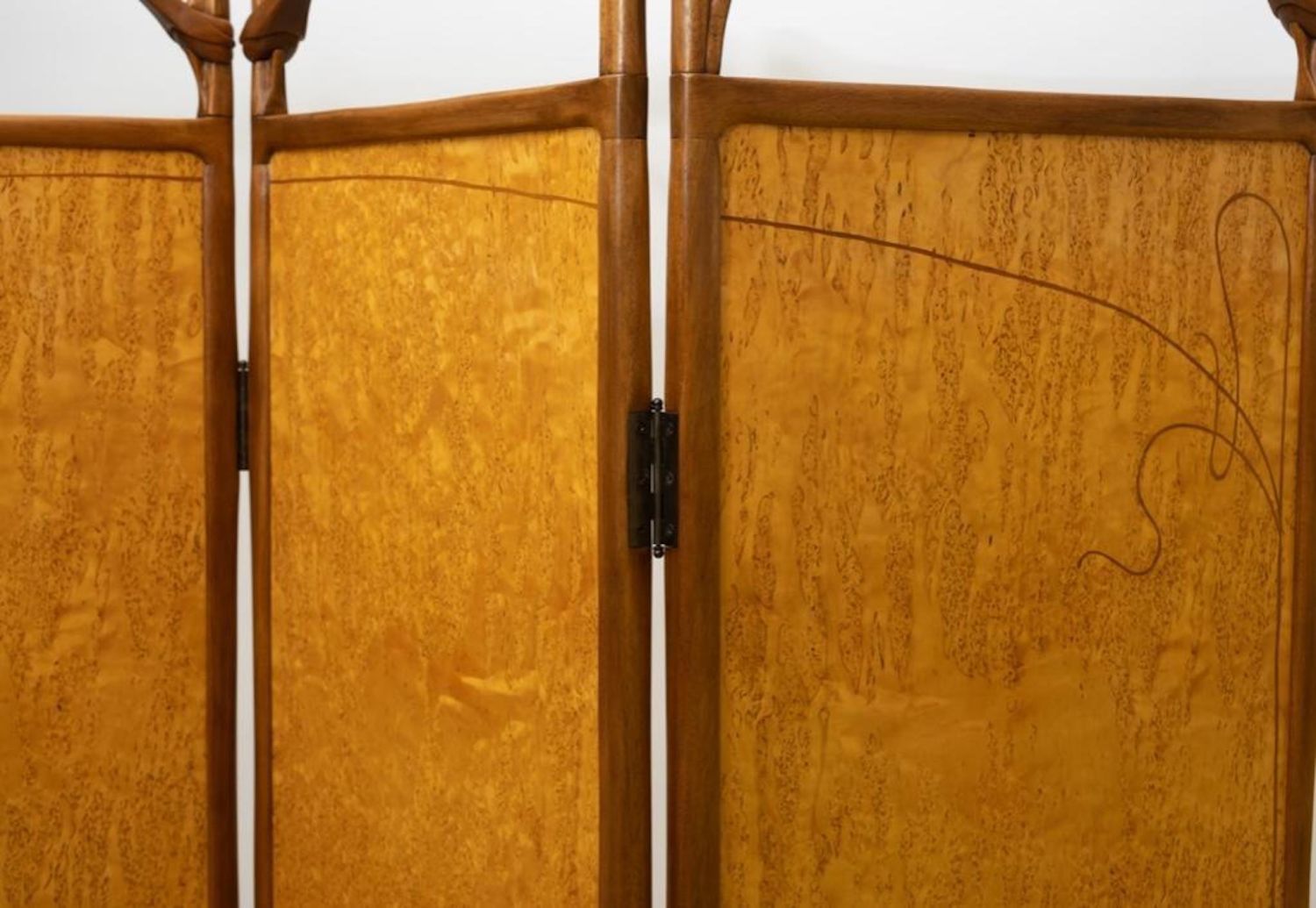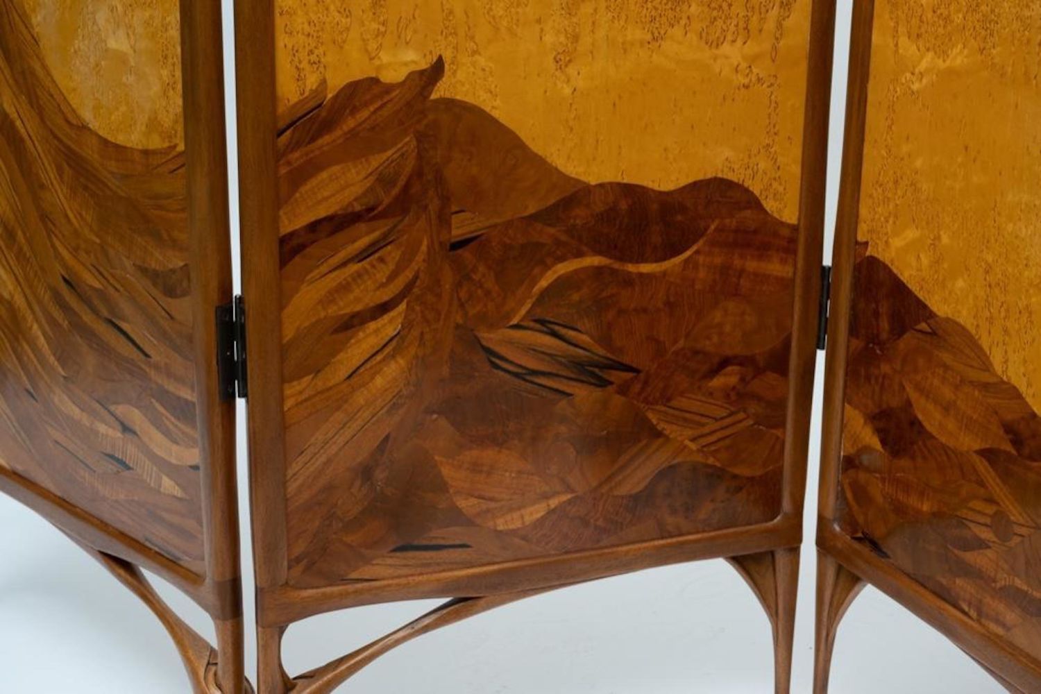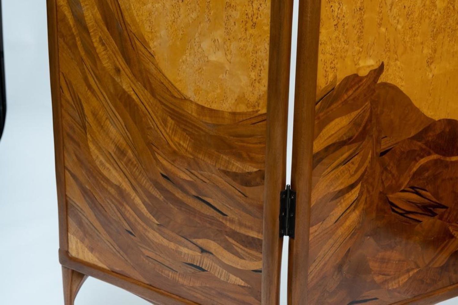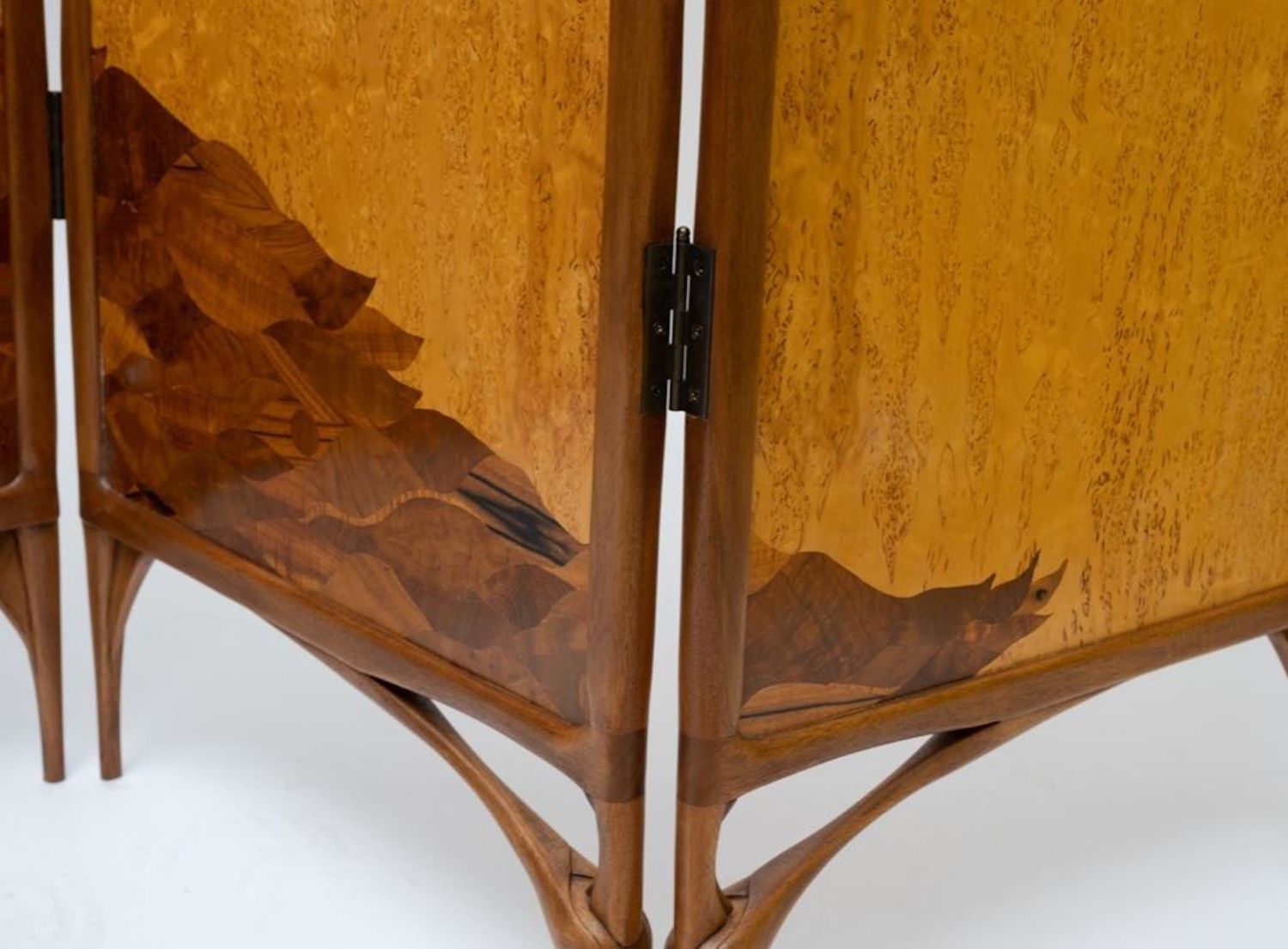 Virginia "Ginny" Blanchard Art Nouveau-inspired Four-panel Peacock Screen, Rockport, Maine, late 20th century, mahogany and Karelian birch with various veneers. Measures 74"H 78"W. After earning a bachelor’s degree from New York University several years ago, she’d never done any woodworking and decided to try a two-week course at the Center for Furniture Craftsmanship in Rockport. That path led to more courses and a fellowship through the Center. She now makes a living by making furniture on commission and is working on doing the trade show route. Just recently she made the transition to stay permanently in Maine. She picked three pieces in her portfolio that she found to be the most fun to make. One of them being a non-commissioned piece. She created a privacy screen made from framed mahogany with birch veneer with a haughty peacock motif. “This was the first piece I did after my fellowship ended, ” she said.