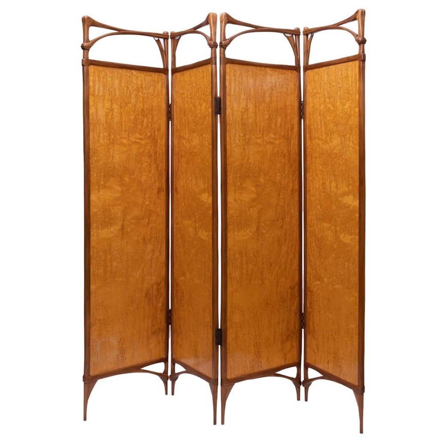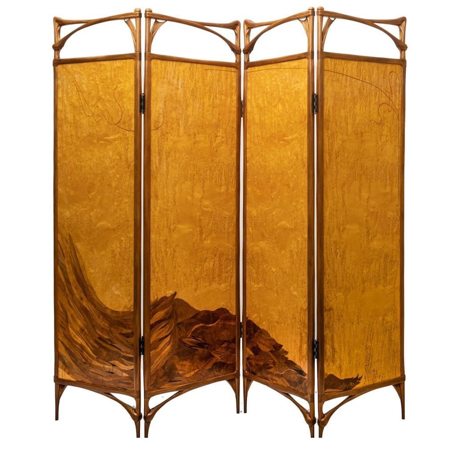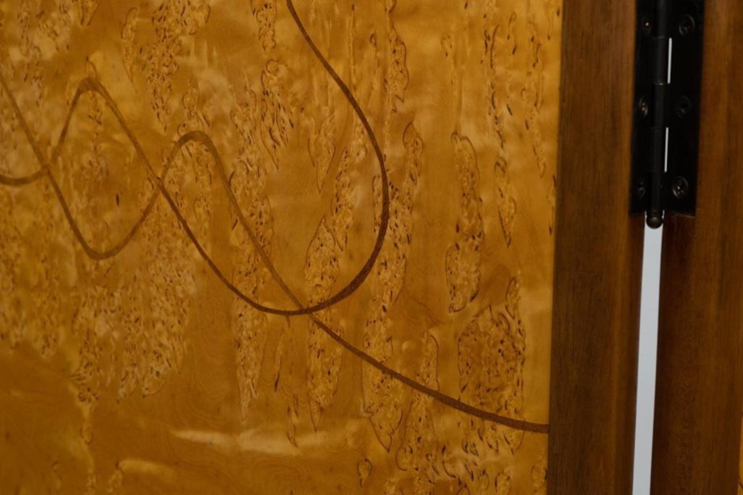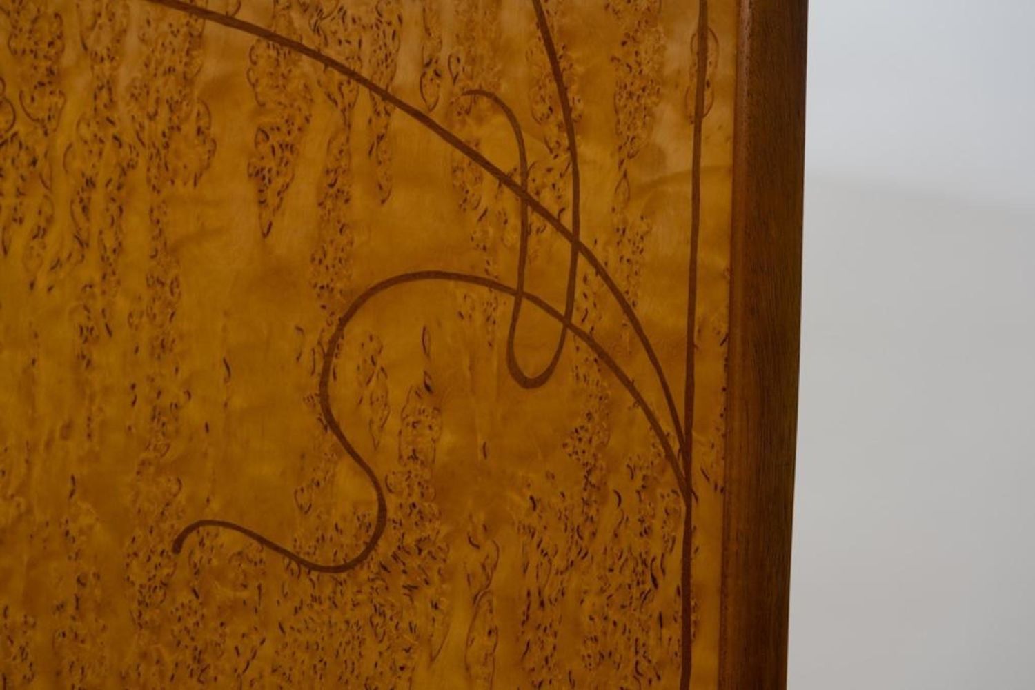 Virginia "Ginny" Blanchard Art Nouveau-inspired Four-panel Peacock Screen, Rockport, Maine, late 20th century, mahogany and Karelian birch with various veneers. Measures 74"H 78"W. After earning a bachelor’s degree from New York University several years ago, she’d never done any woodworking and decided to try a two-week course at the Center for Furniture Craftsmanship in Rockport. That path led to more courses and a fellowship through the Center. She now makes a living by making furniture on commission and is working on doing the trade show route. Just recently she made the transition to stay permanently in Maine. She picked three pieces in her portfolio that she found to be the most fun to make. One of them being a non-commissioned piece. She created a privacy screen made from framed mahogany with birch veneer with a haughty peacock motif. “This was the first piece I did after my fellowship ended, ” she said.