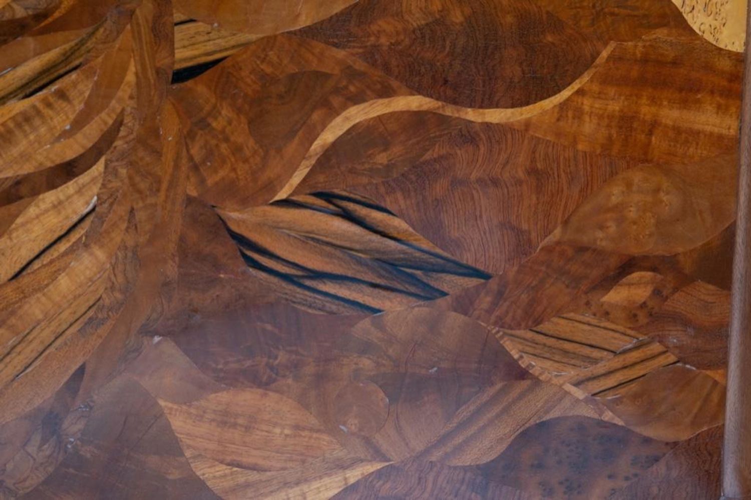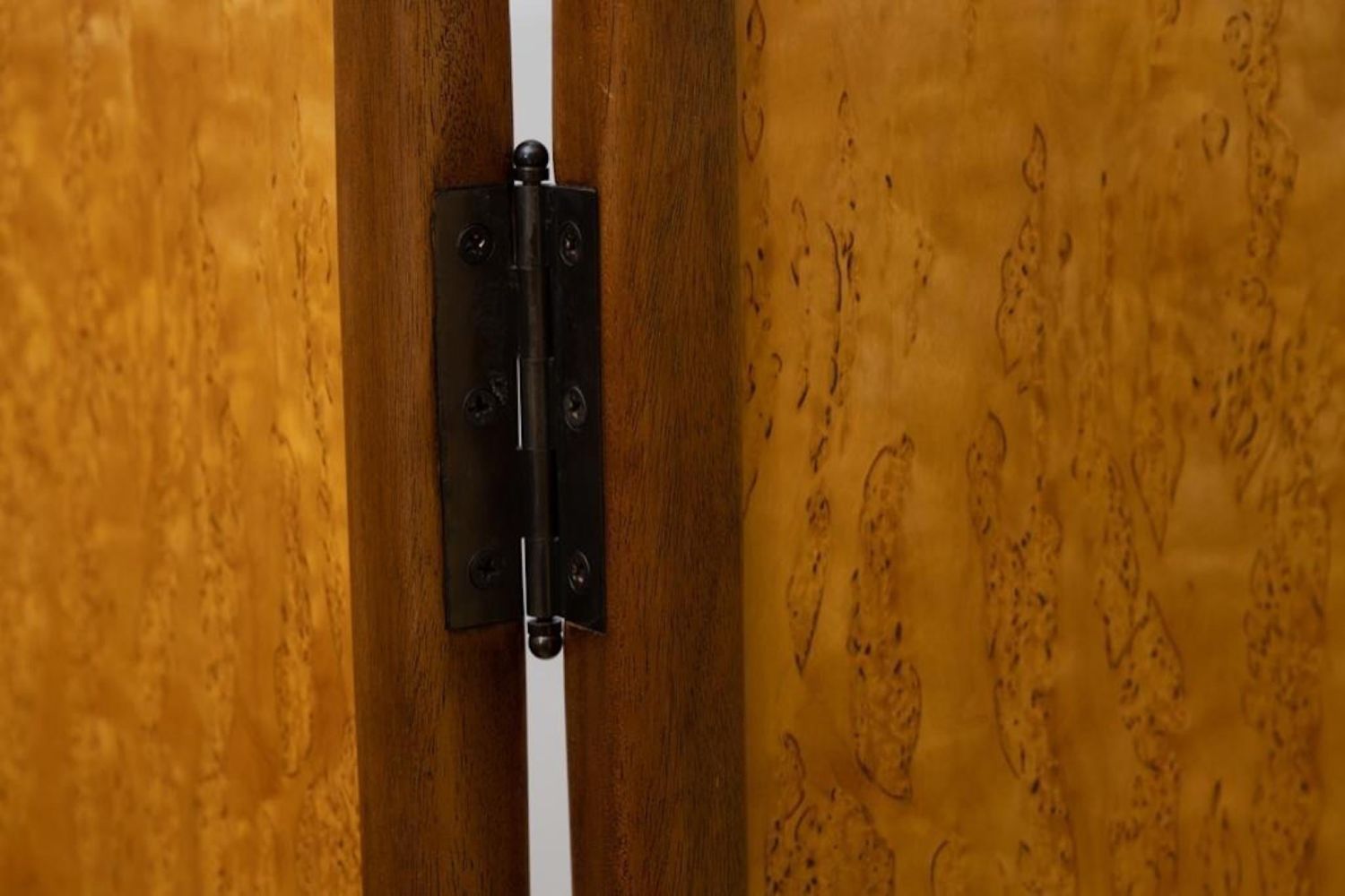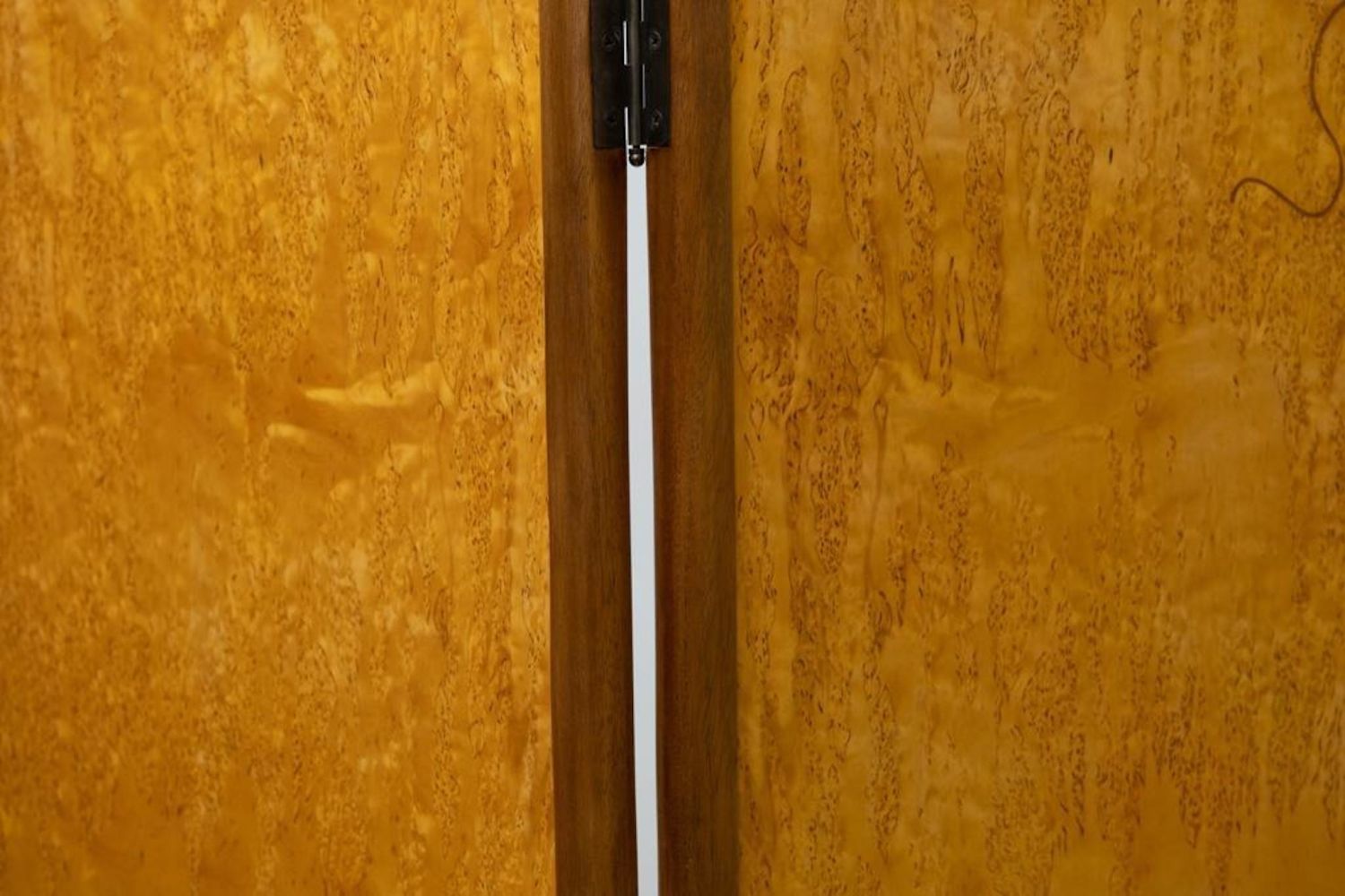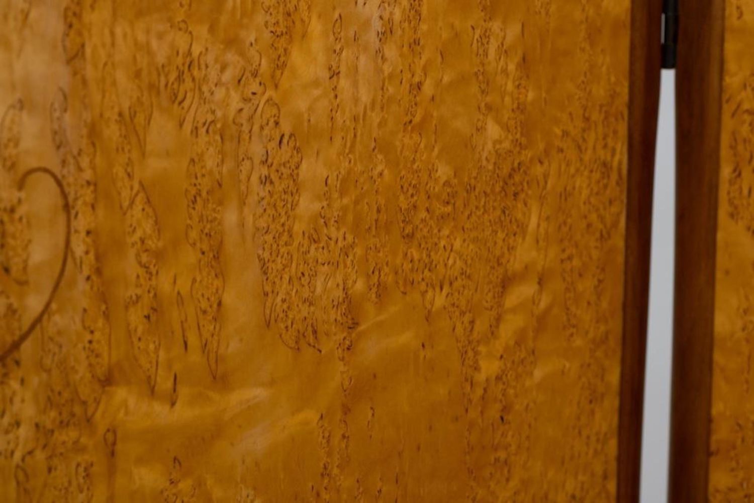 Virginia "Ginny" Blanchard Art Nouveau-inspired Four-panel Peacock Screen, Rockport, Maine, late 20th century, mahogany and Karelian birch with various veneers. Measures 74"H 78"W. After earning a bachelor’s degree from New York University several years ago, she’d never done any woodworking and decided to try a two-week course at the Center for Furniture Craftsmanship in Rockport. That path led to more courses and a fellowship through the Center. She now makes a living by making furniture on commission and is working on doing the trade show route. Just recently she made the transition to stay permanently in Maine. She picked three pieces in her portfolio that she found to be the most fun to make. One of them being a non-commissioned piece. She created a privacy screen made from framed mahogany with birch veneer with a haughty peacock motif. “This was the first piece I did after my fellowship ended, ” she said.