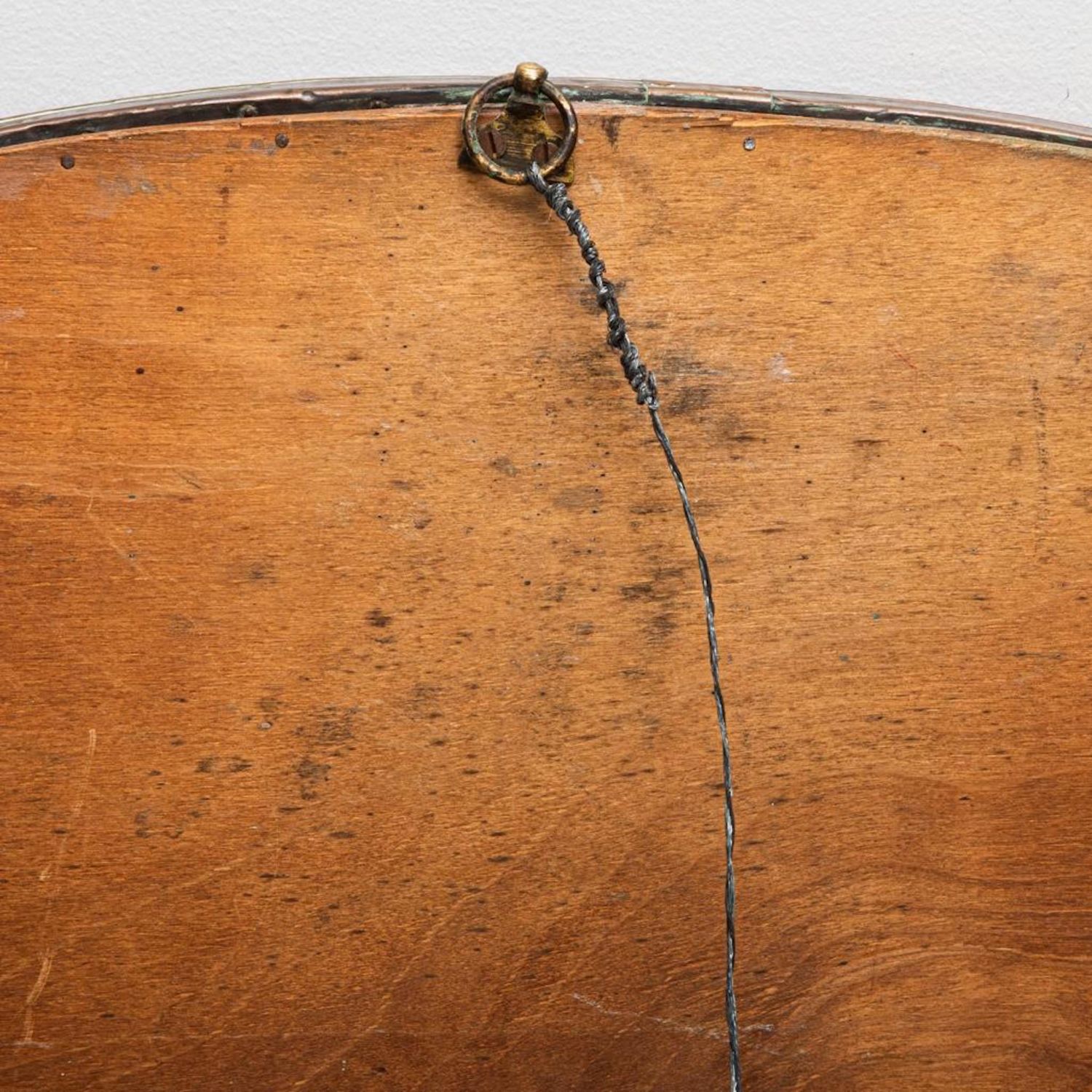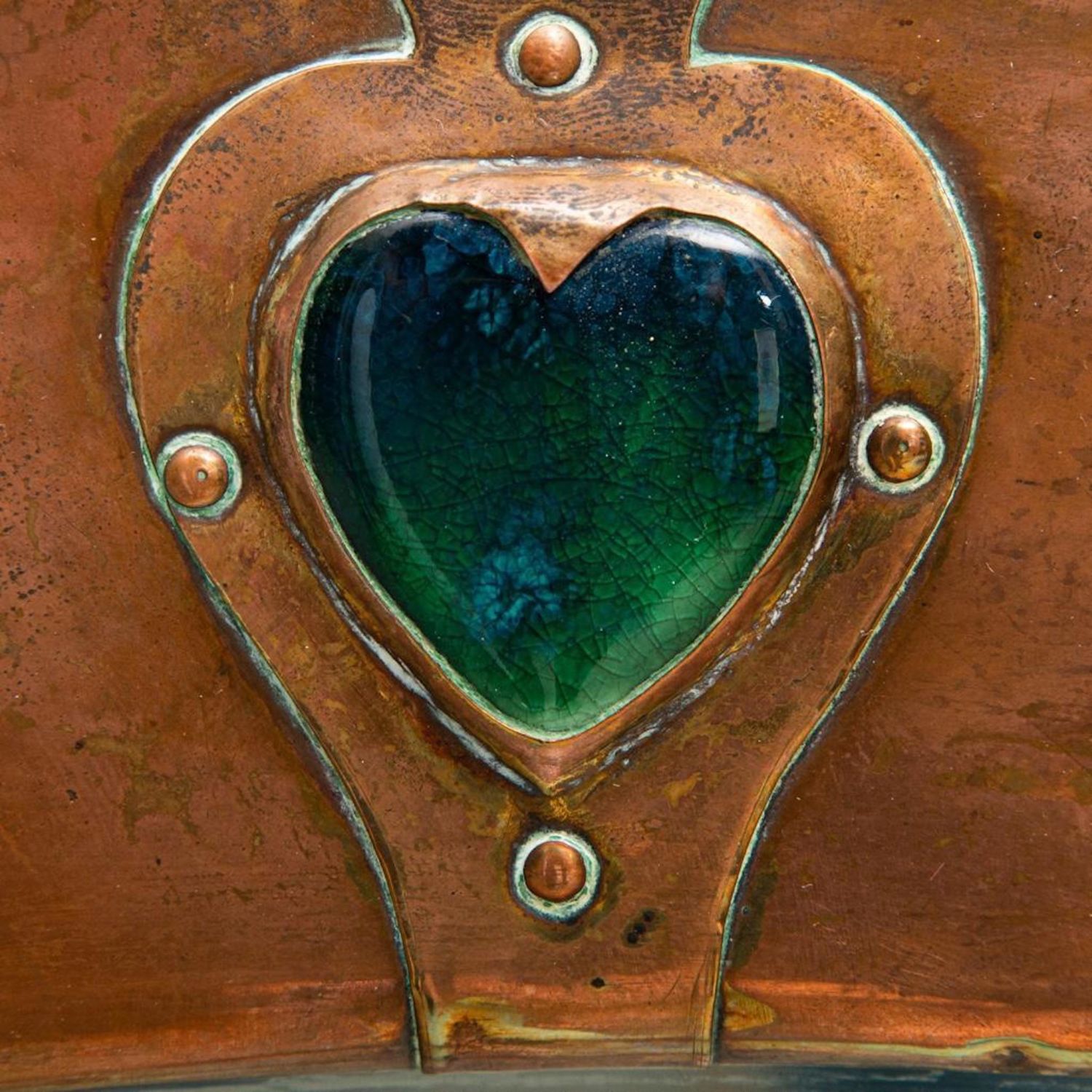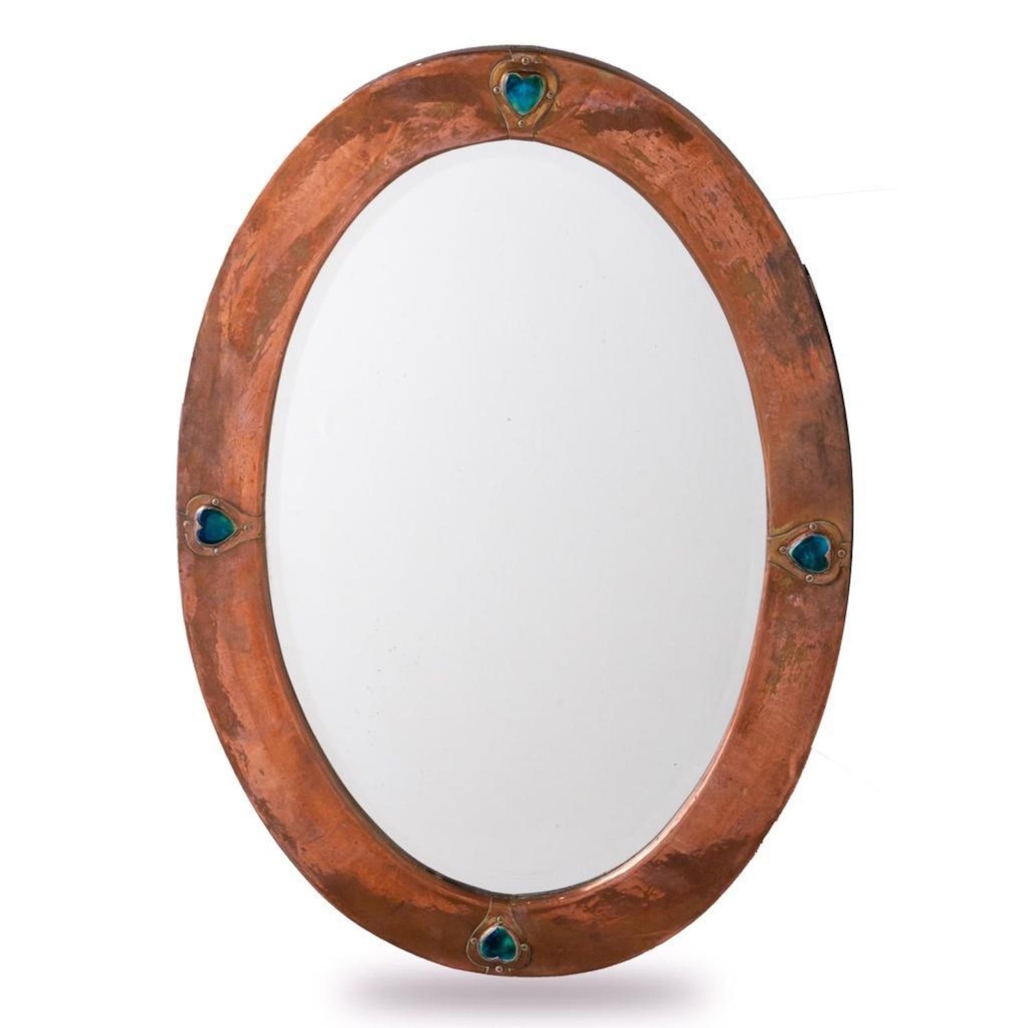 Liberty Archibald Knox Arts and Crafts mirror, for Liberty and Co., having an oval beveled looking glass surrounded by turqoise cabochan enamel inserts, 34"h x 23.5"wA large round hand-hammered patinated copper frame over wood wall mirror with its original silver mirror glass by liberty & Co., London, England, Circa 1905