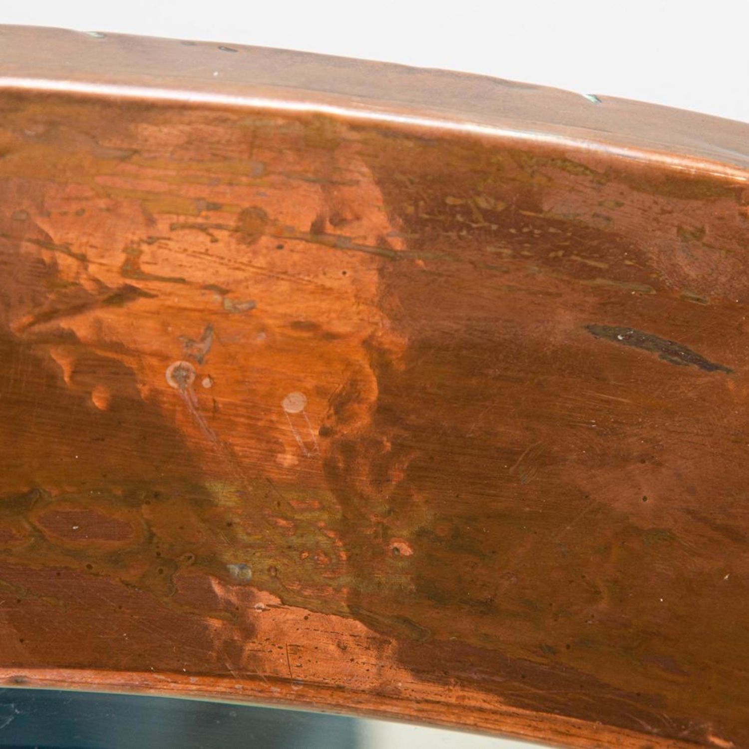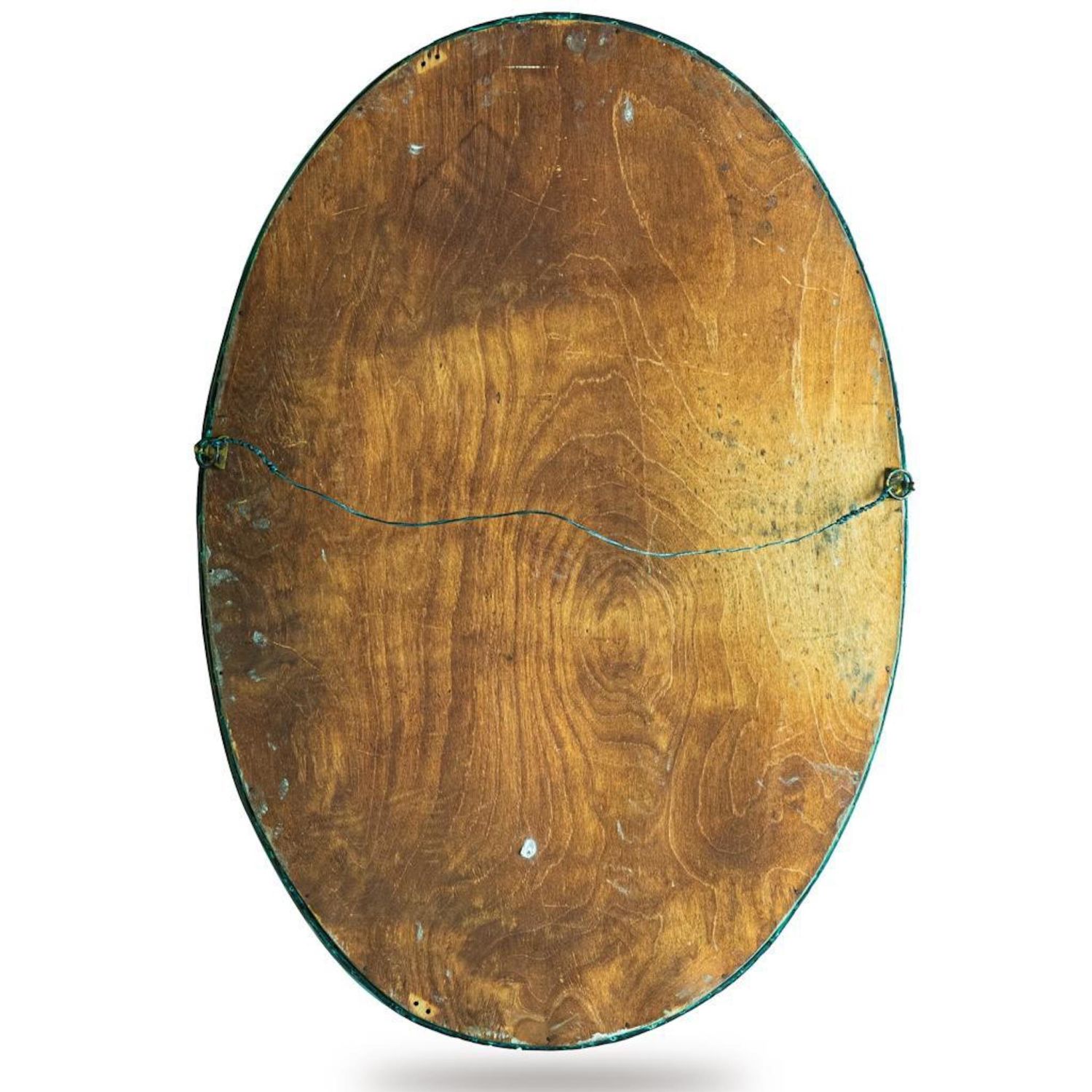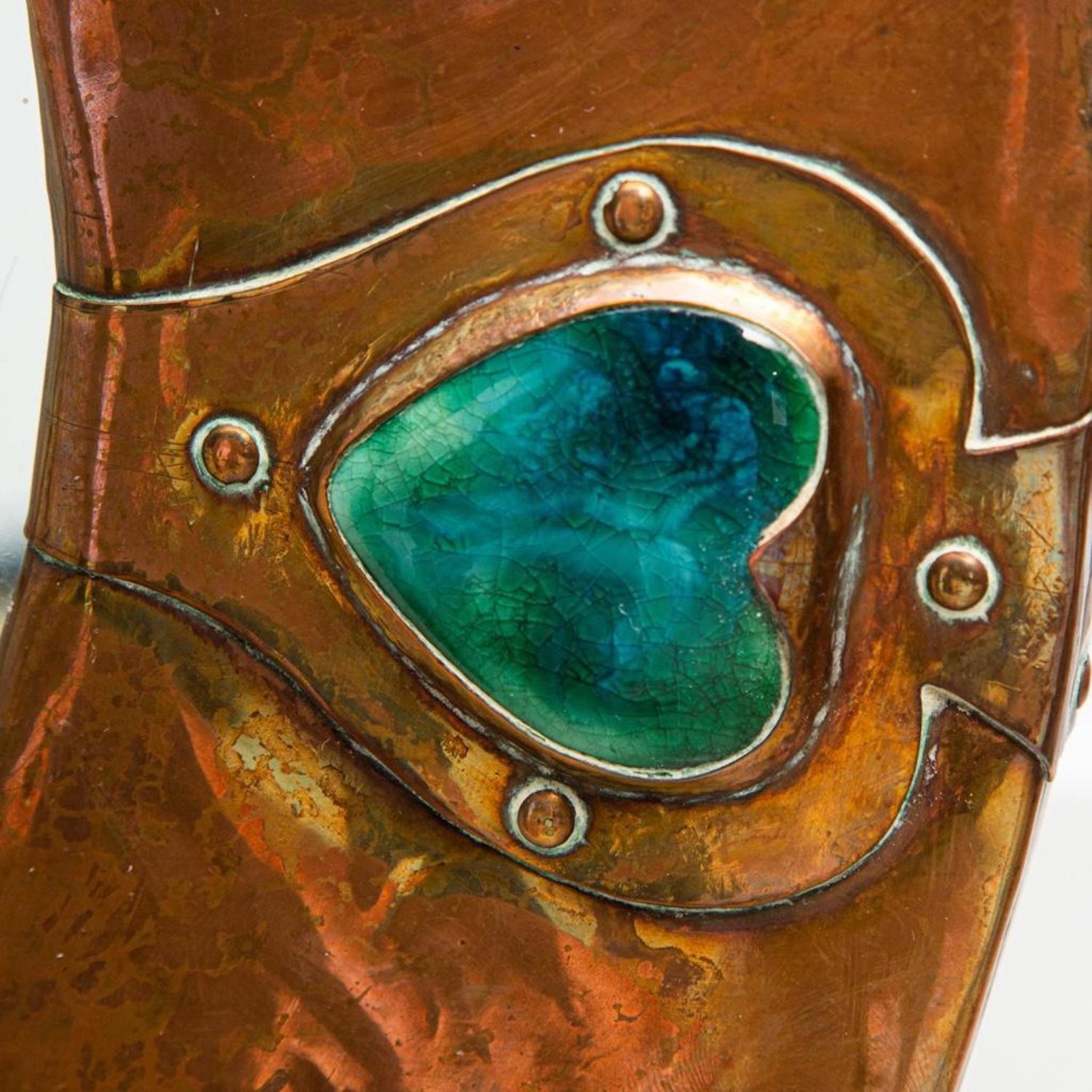 Liberty Archibald Knox Arts and Crafts mirror, for Liberty and Co., having an oval beveled looking glass surrounded by turqoise cabochan enamel inserts, 34"h x 23.5"wA large round hand-hammered patinated copper frame over wood wall mirror with its original silver mirror glass by liberty & Co., London, England, Circa 1905