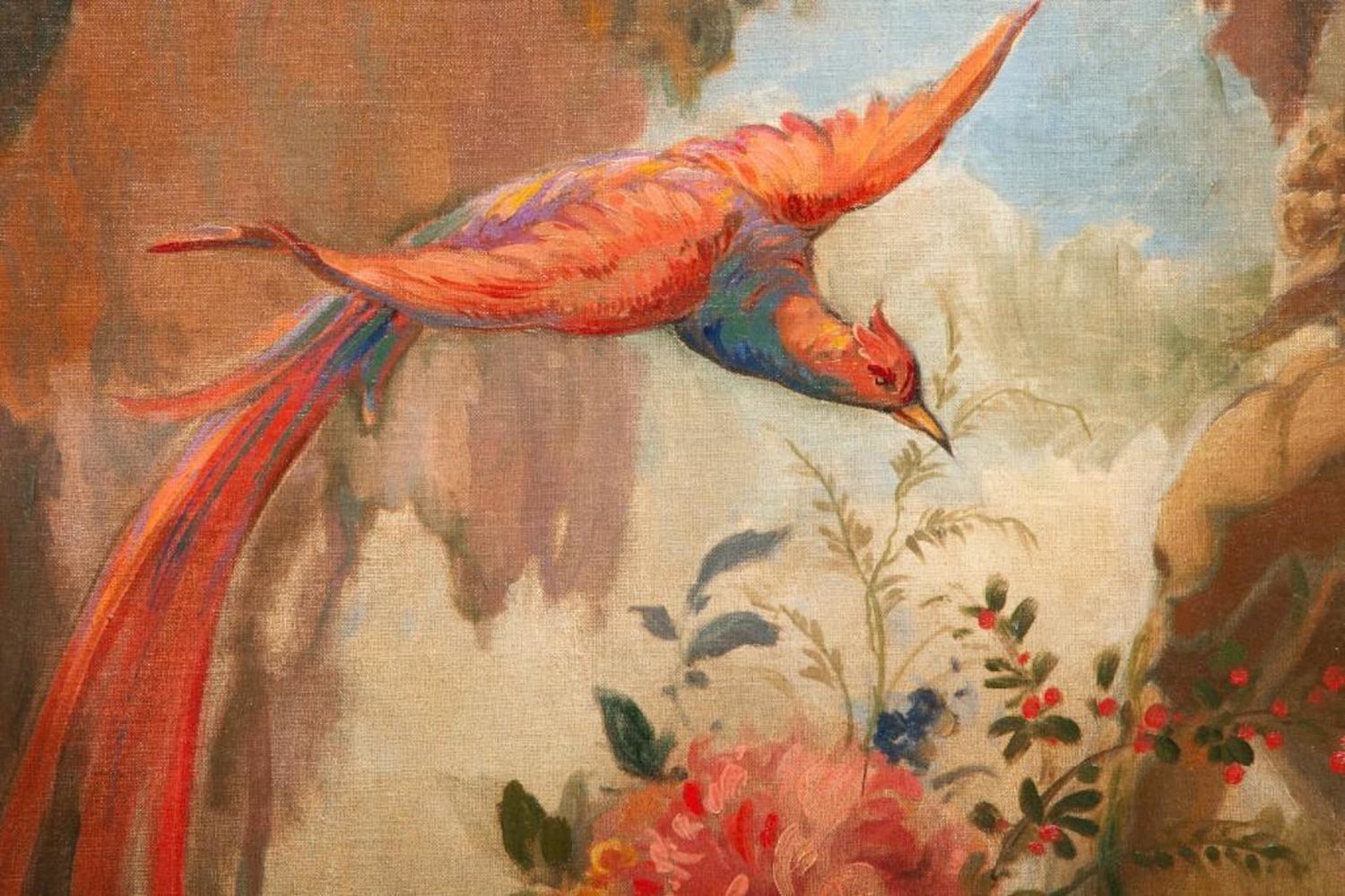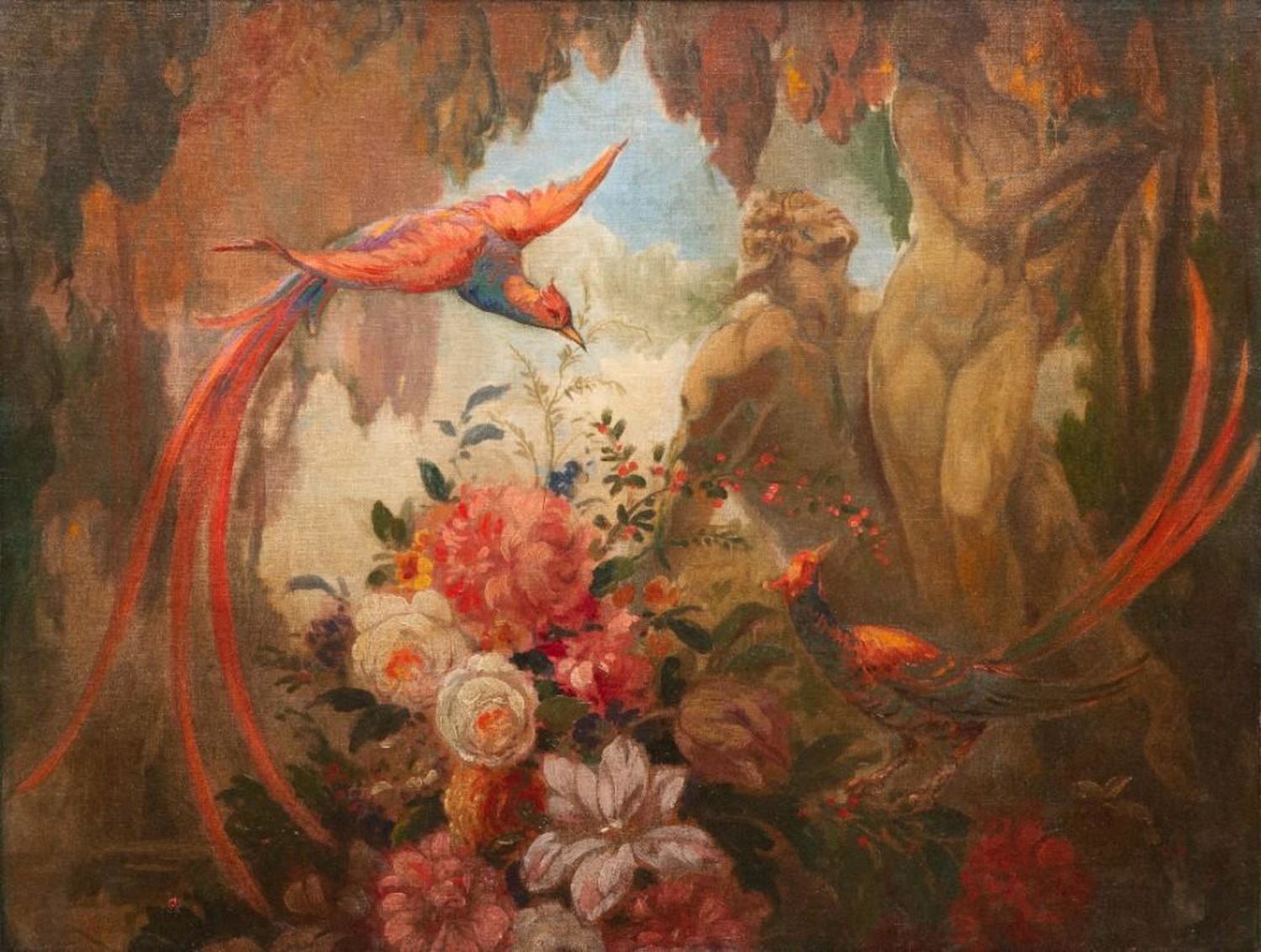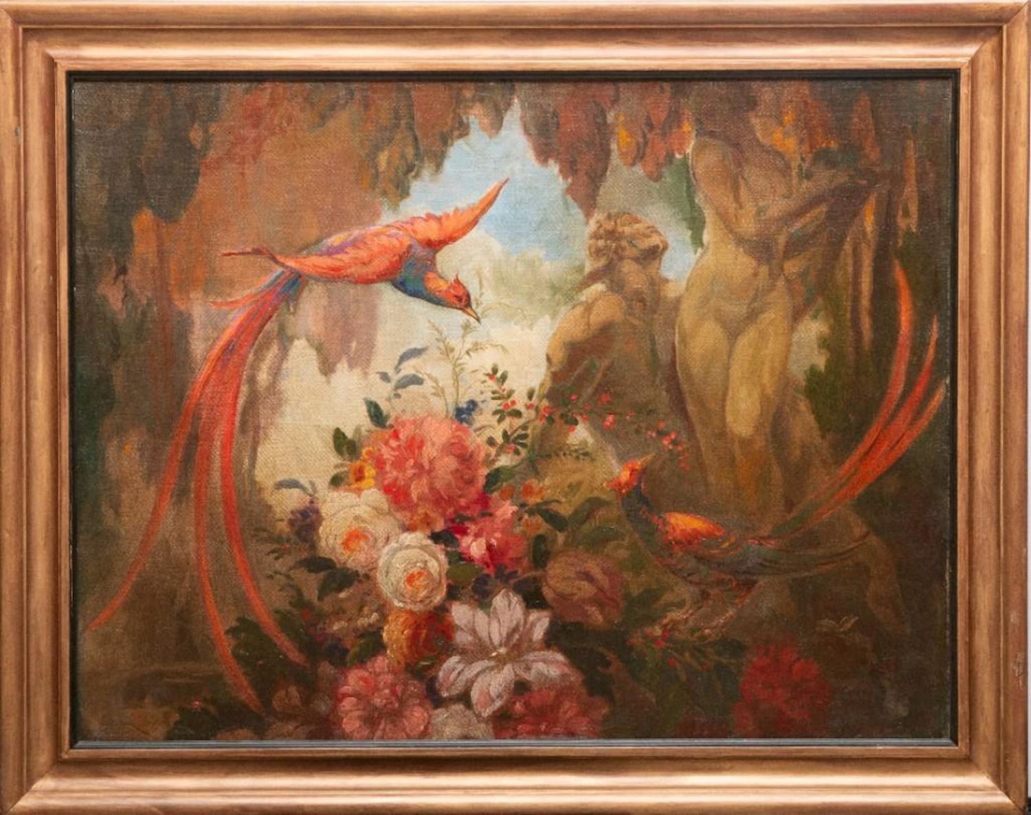 Art Deco Art Nouveau Oil on canvas laid onto masonite depicting Birds, Male and Female Figures in tropical foliate surrounded paradise . From a Long Island, NY collection. Dimensions: 32" high x 42" wide very good and in very good condition