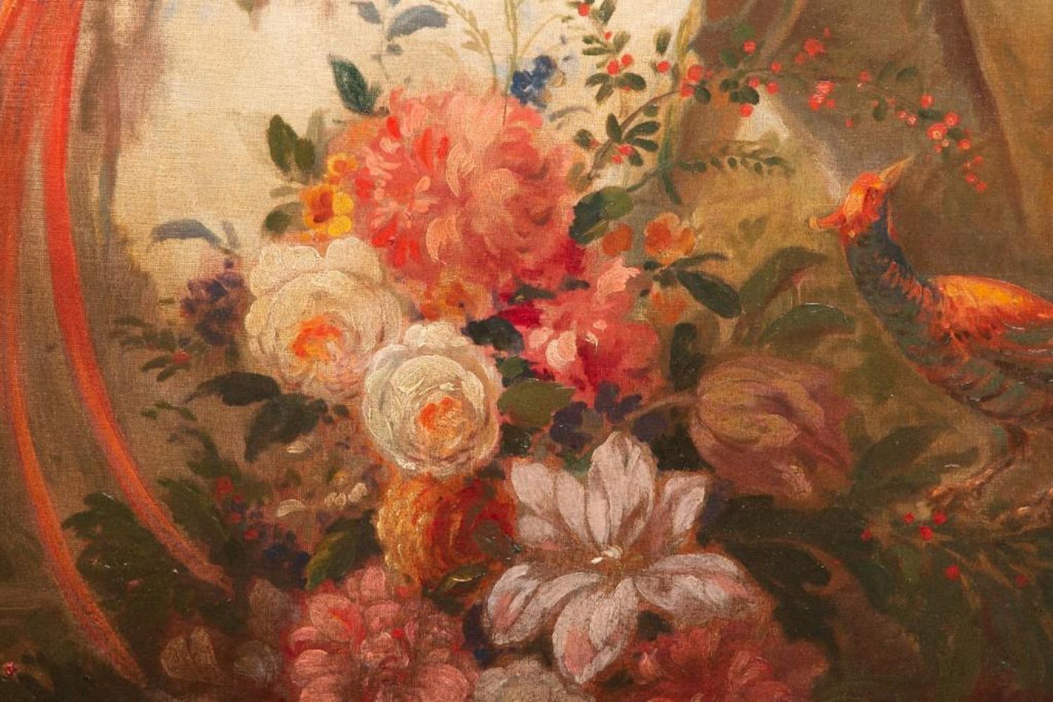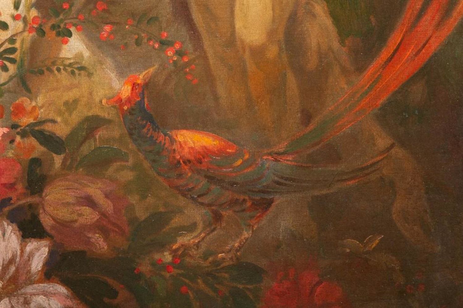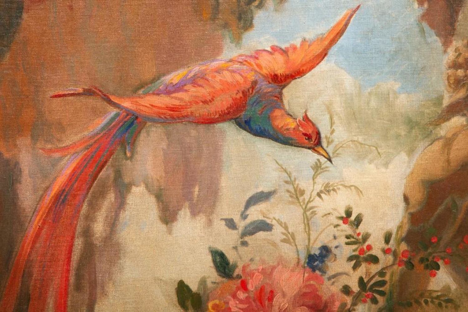 Art Deco Art Nouveau Oil on canvas laid onto masonite depicting Birds, Male and Female Figures in tropical foliate surrounded paradise . From a Long Island, NY collection. Dimensions: 32" high x 42" wide very good and in very good condition