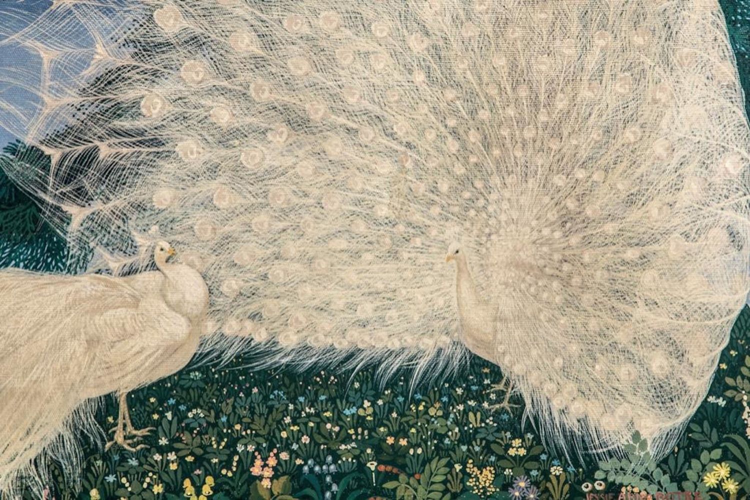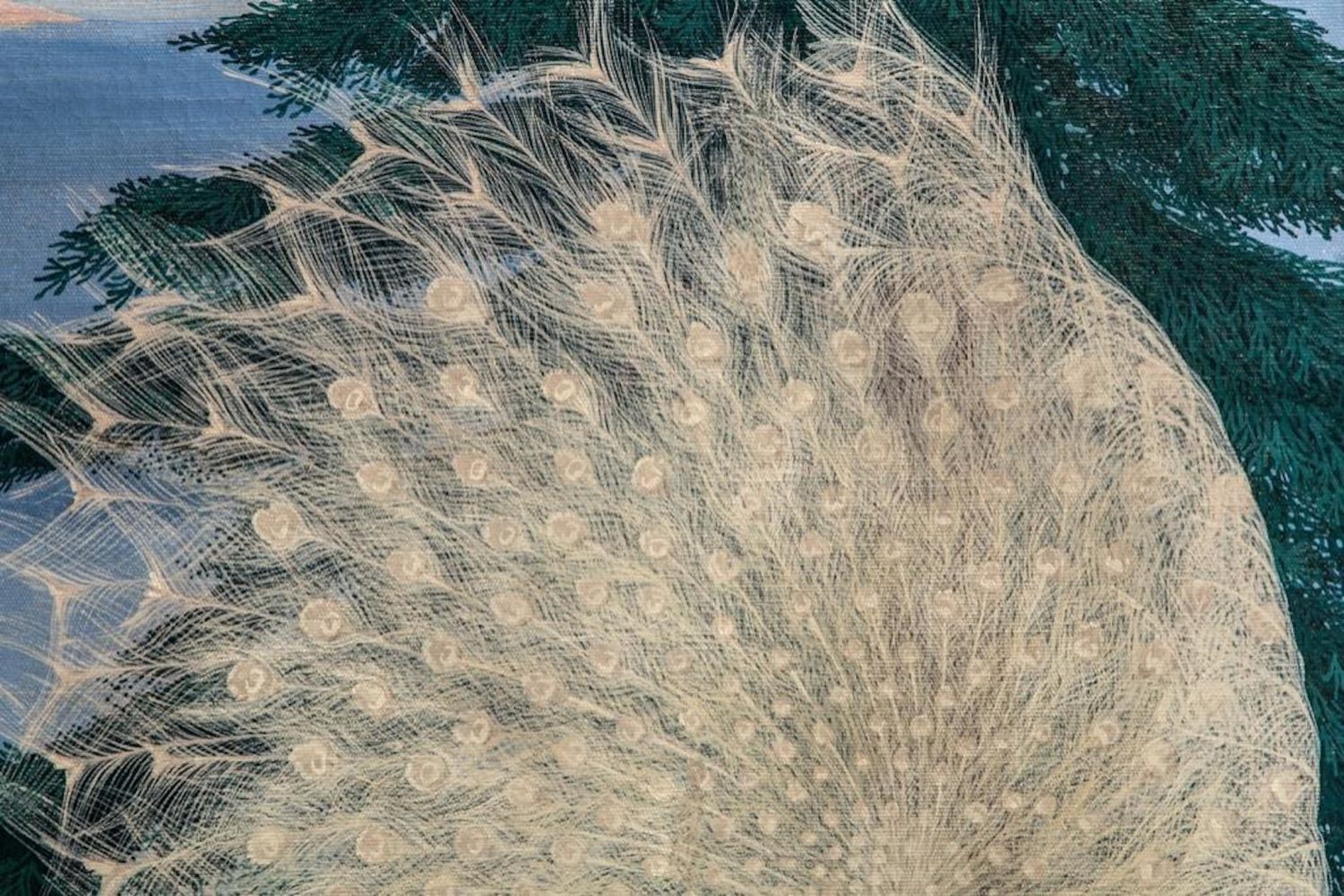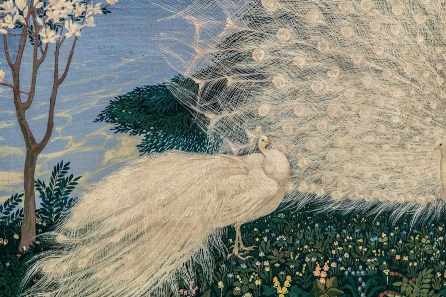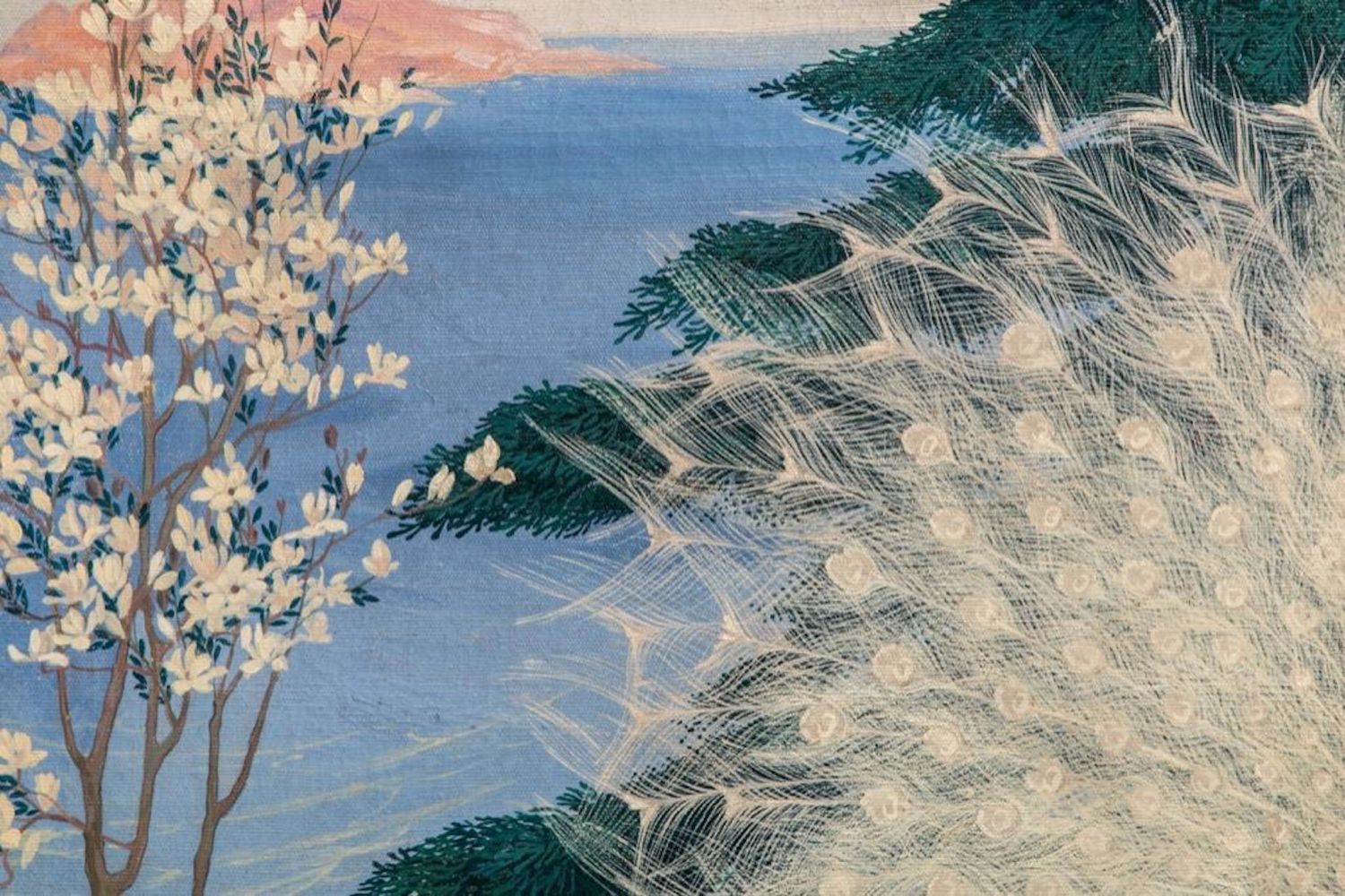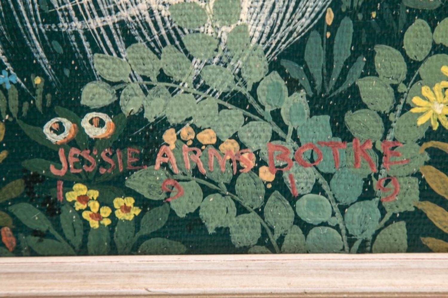 Jessie Hazel Arms Botke (1883-1971), pair of white peacocks, oil on canvas. Signed LR .. 24" x 30 1/2". Botke was an Illinois and California painter noted for her bird images. She worked with and was heavily influenced by Charles Herter . inspired by early work as a designer of woven tapestries, Botke’s art often featured birds, particularly white peacocks, geese and cockatoos.Later in her career, she moved from oils to watercolors, and also focused on still lives.Botke exhibited regularly throughout the United States during her lifetime.A retrospecive exhibition of her work has also been exhibited posthumously at the Irvine Museum[ and the Museum of Ventura County.