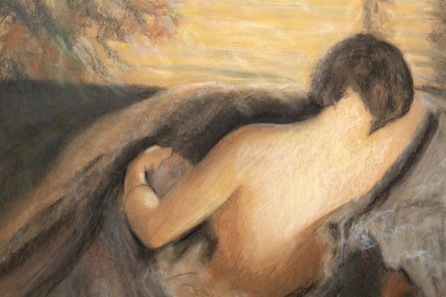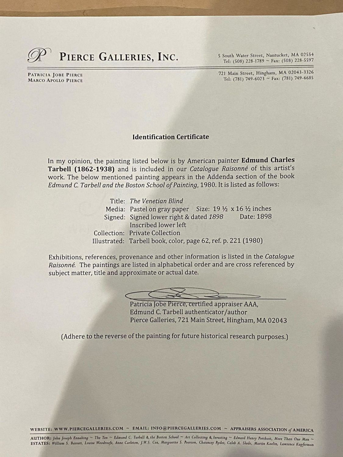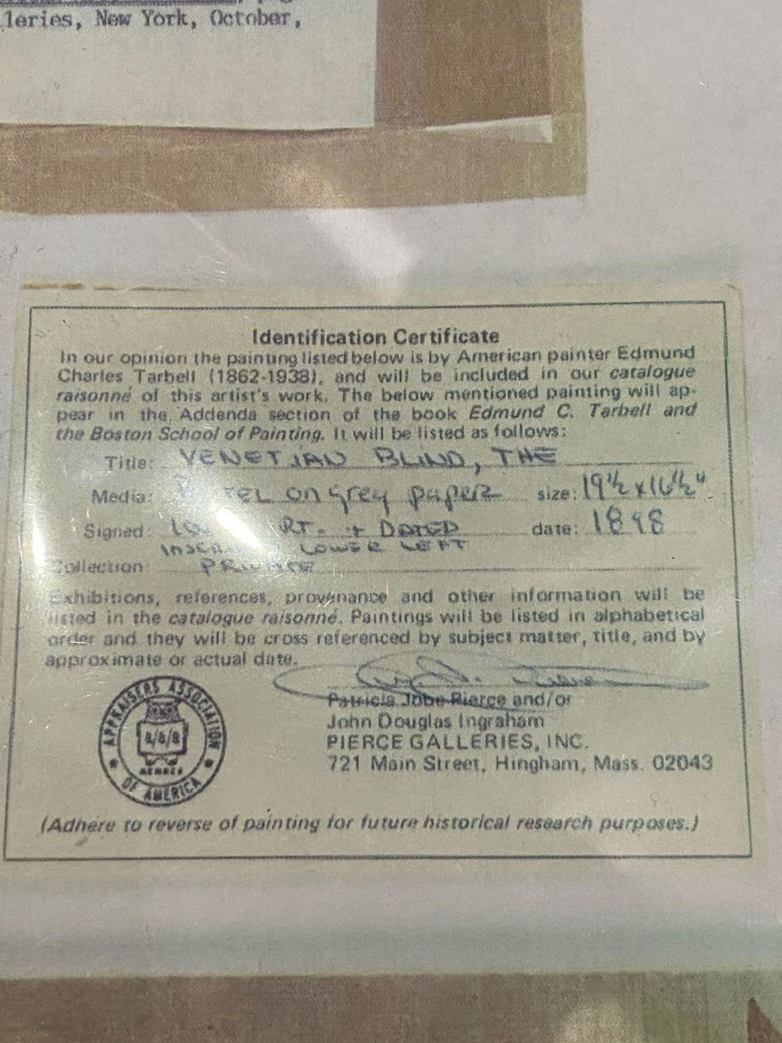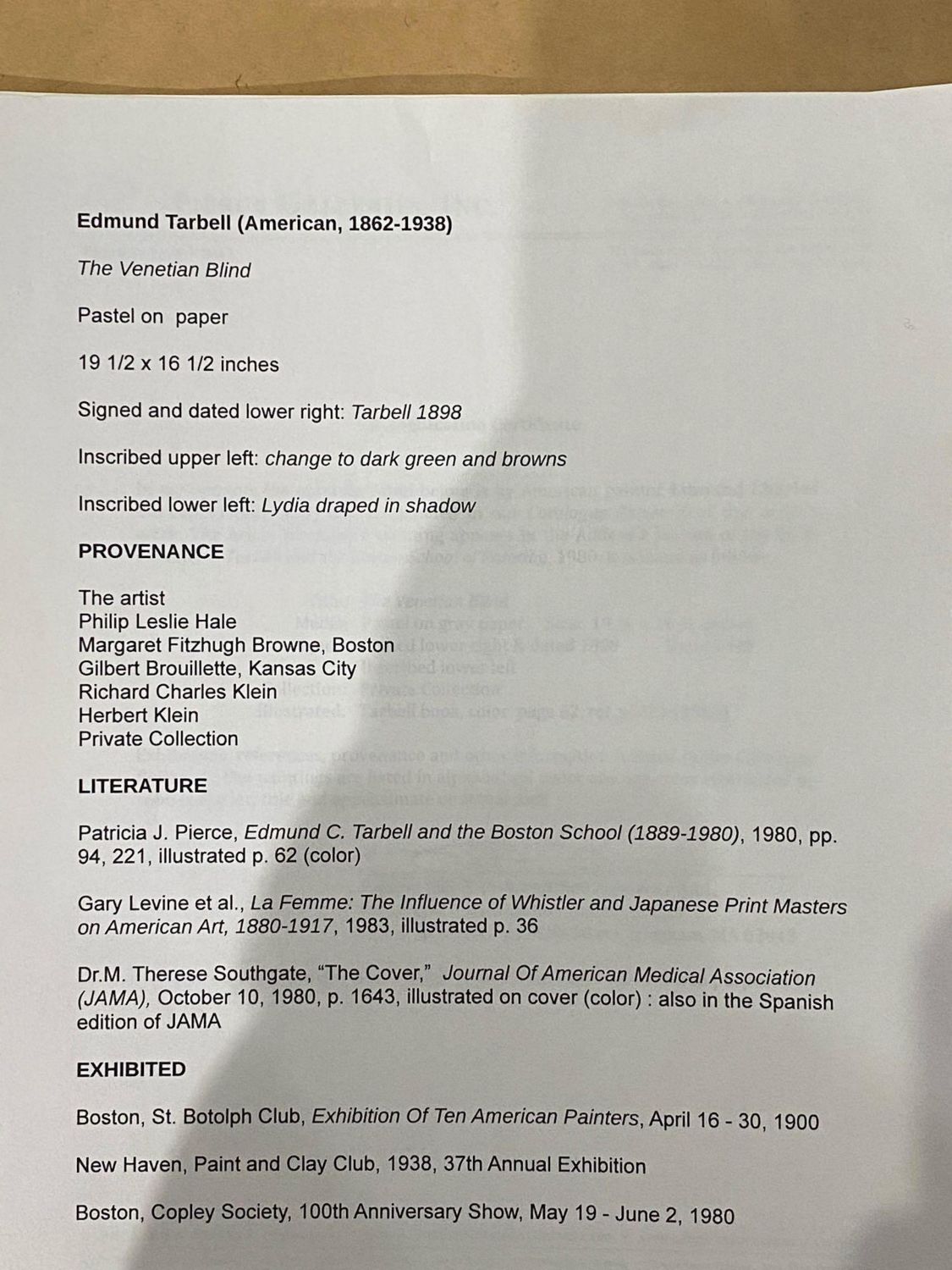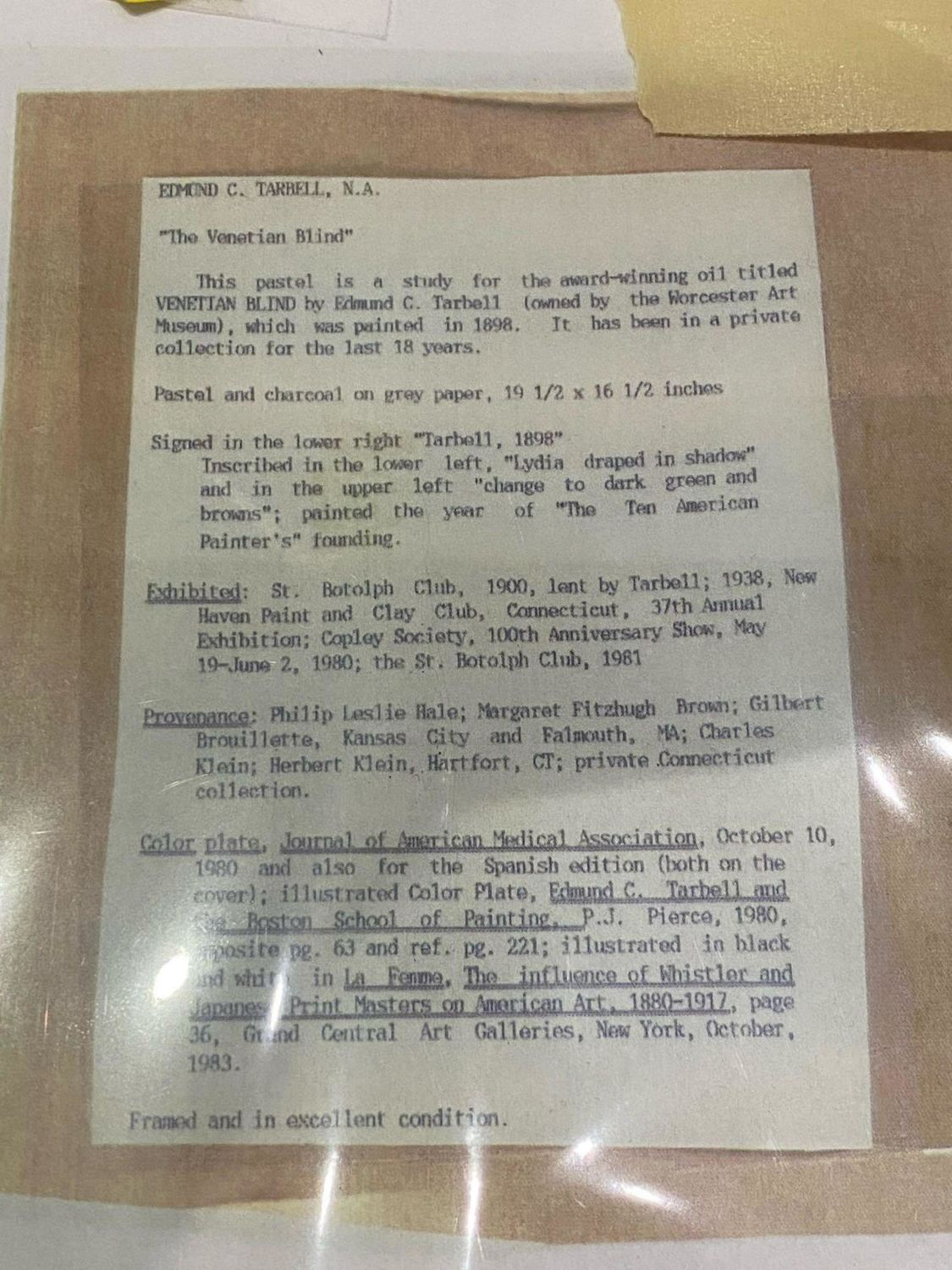 Signed Edmund C Tarbell*(LR) pastel study for the "The Venetian Blind".Signed and dated "Tarbell/1898" We strongly believe this is a study by Tarbell for the well known oil painting which resides in the Worcester Art Museum. NOTE: While examining the work under high powered lighting it was discovered what appear to be artist notes / pencil notations that seemingly had gone unnoticed or at least unmentioned, one of which reads .. "Lydia draped in Shadow" (Written Lower Left) the other is "Change to dark Green and Brown" (Which is written within the background upper left border). The piece is accompanied by a substantial amount of documentation including original letter of Authentication from Pierce Galleries. its publication and exhibition history and its history of ownership/provenance. Originally from from the artist to Phliip Leslie Hale to Marageret Fitzhugh Browne, Boston to Gibert Brouillette, Kansas City to Richard Charles Klein to Herbert Klein then to a private collection. sight size 19 x 16 1/4 in., Framed 22"W x 25.5"H. *We are listing this piece as a strong attribution because several works in the previously well established Catalog Raissone had been questioned (not this one). An article was published relating to the issue (we will provide). This work is listed in the Catalog Raissone and comes with substantial history dating back to the artist as well has having been published an exhibited. A copy of the book about Tarbell by a well known Tarbell expert gives this work a full color page illustration as being by Tarbell. Note: Once an Artists’ work begin to appreciation substantially it is inevitable that "experts" begin to challenge as works as being authentic. For this reason we have attributed the work even though it is well documented. Thomas Hoving former director of the Metropolitan Museum has written extensively on these issues and controversies. ..