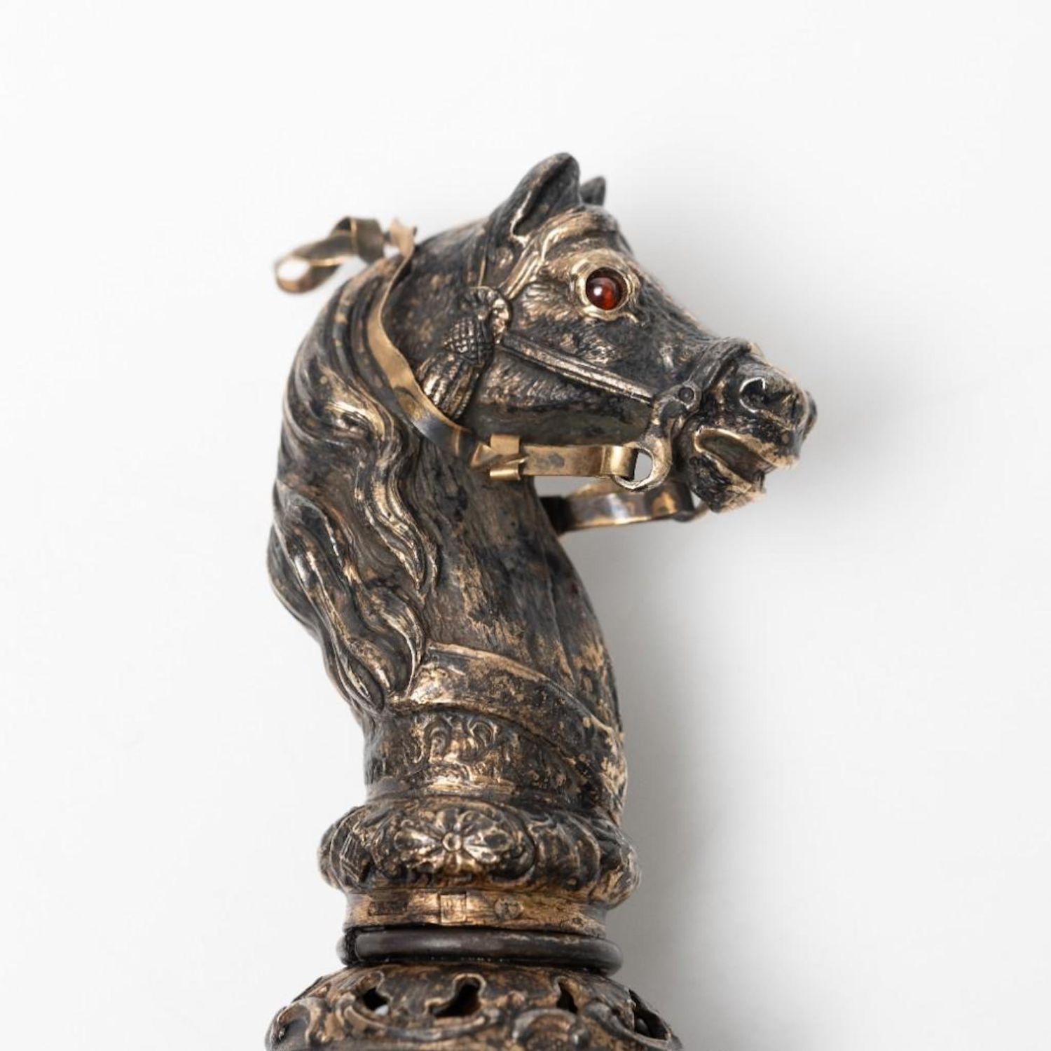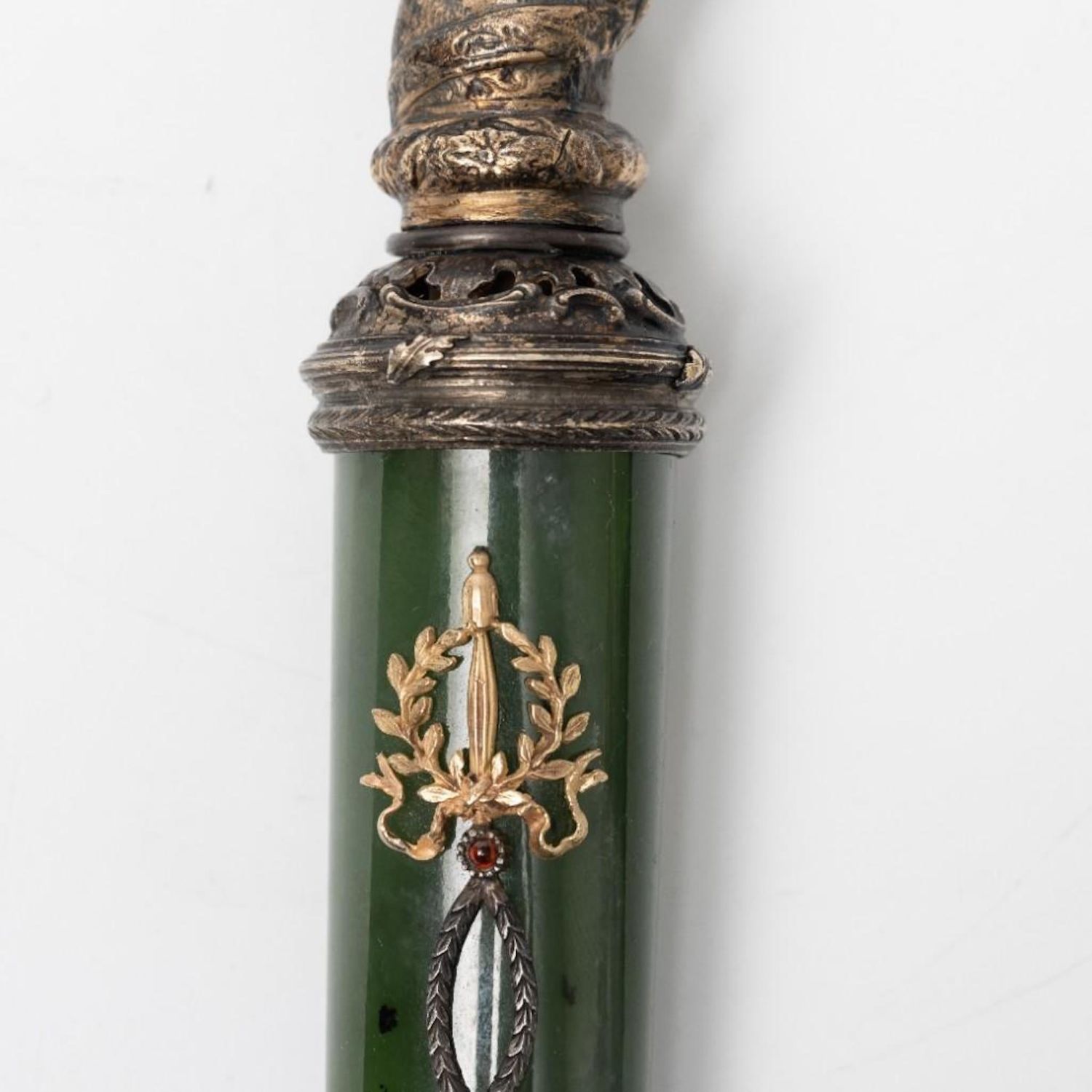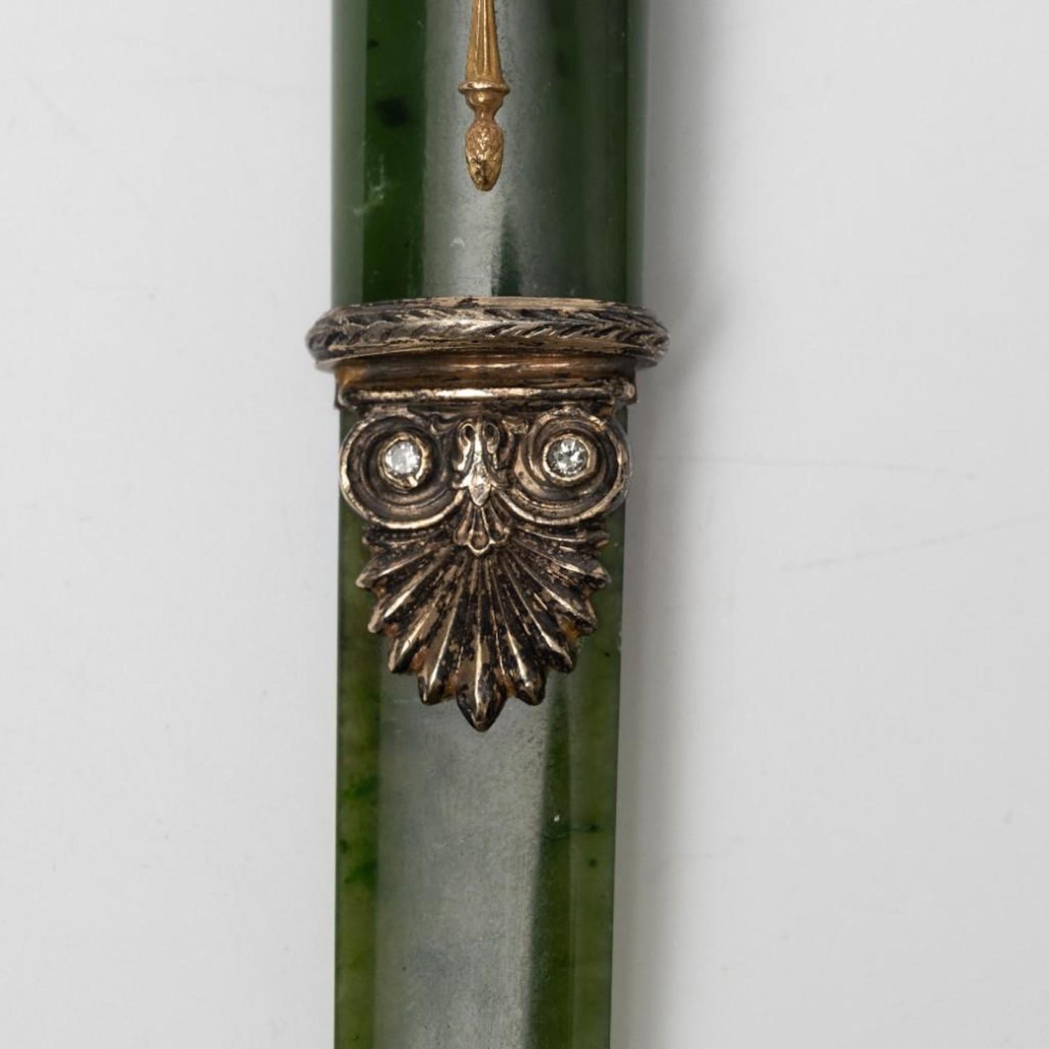 Faberge Antique Jeweled Letter Opener Jade features a horse head handle in 84 silver with gold accents. Circa 1900. The letter opener is nephrite jade and features round diamond and orange garnet accents. Russian hallmarks and makers marks. It measures 9 1/2" long, weighs 5.64ozt, has four round brilliant diamonds at approximately 0.24twt, and four round cabochon orange garnets from 2mm to 2.5mm.