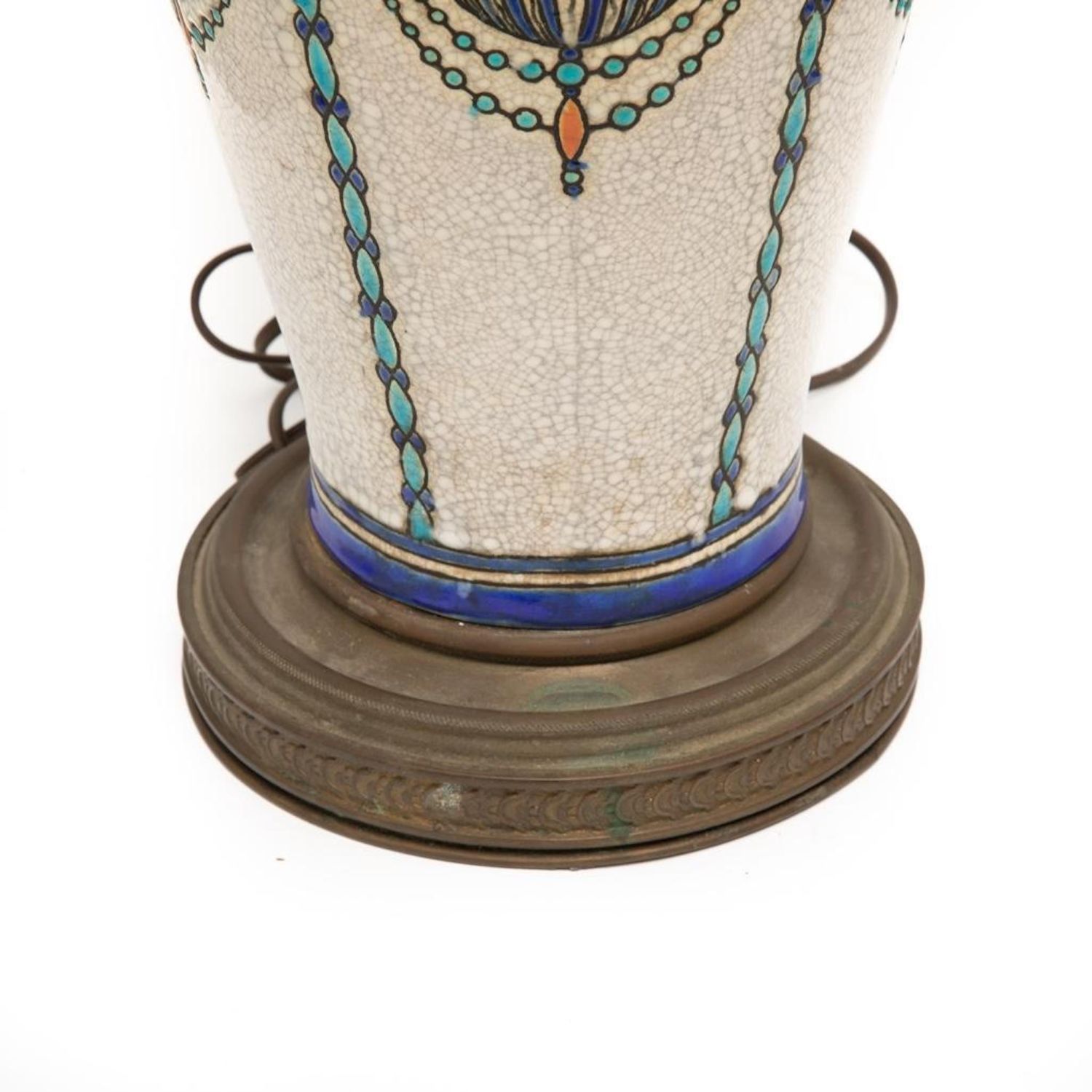 Catteau Boch Freres signed Keramis art deco enameled ceramic tall table lamp. Lamp measures 17.5"H from base to top 28"H from base to very Top good condition