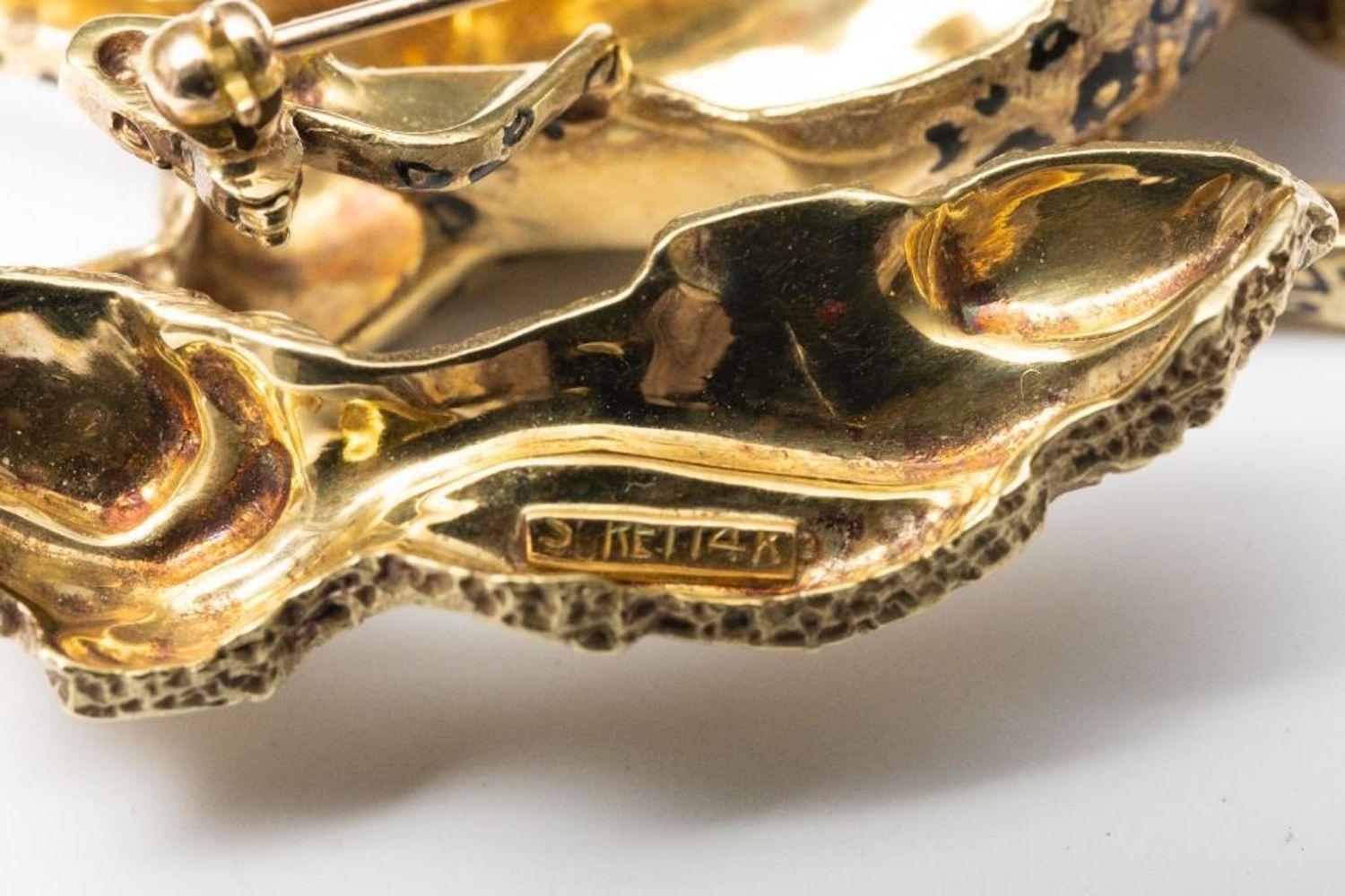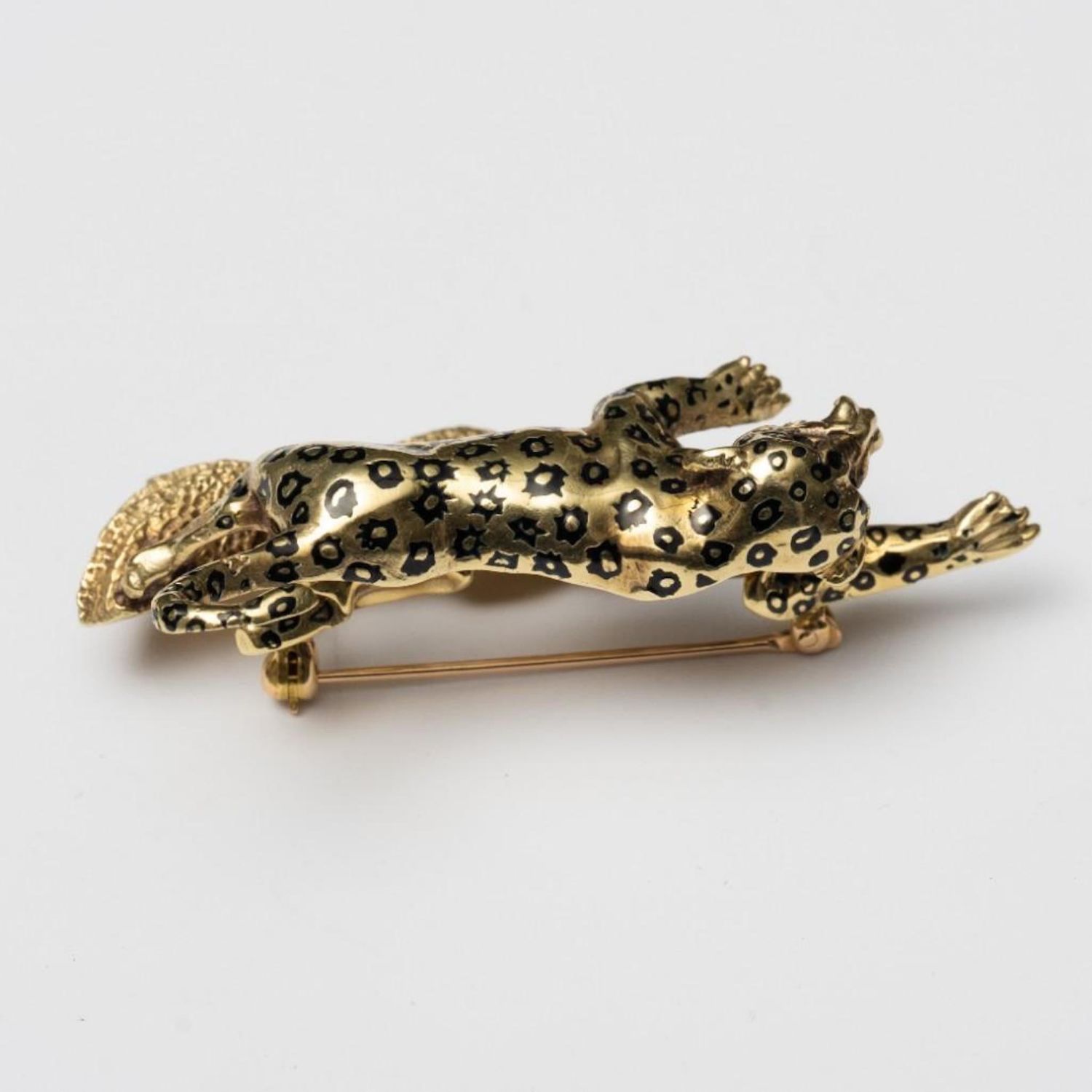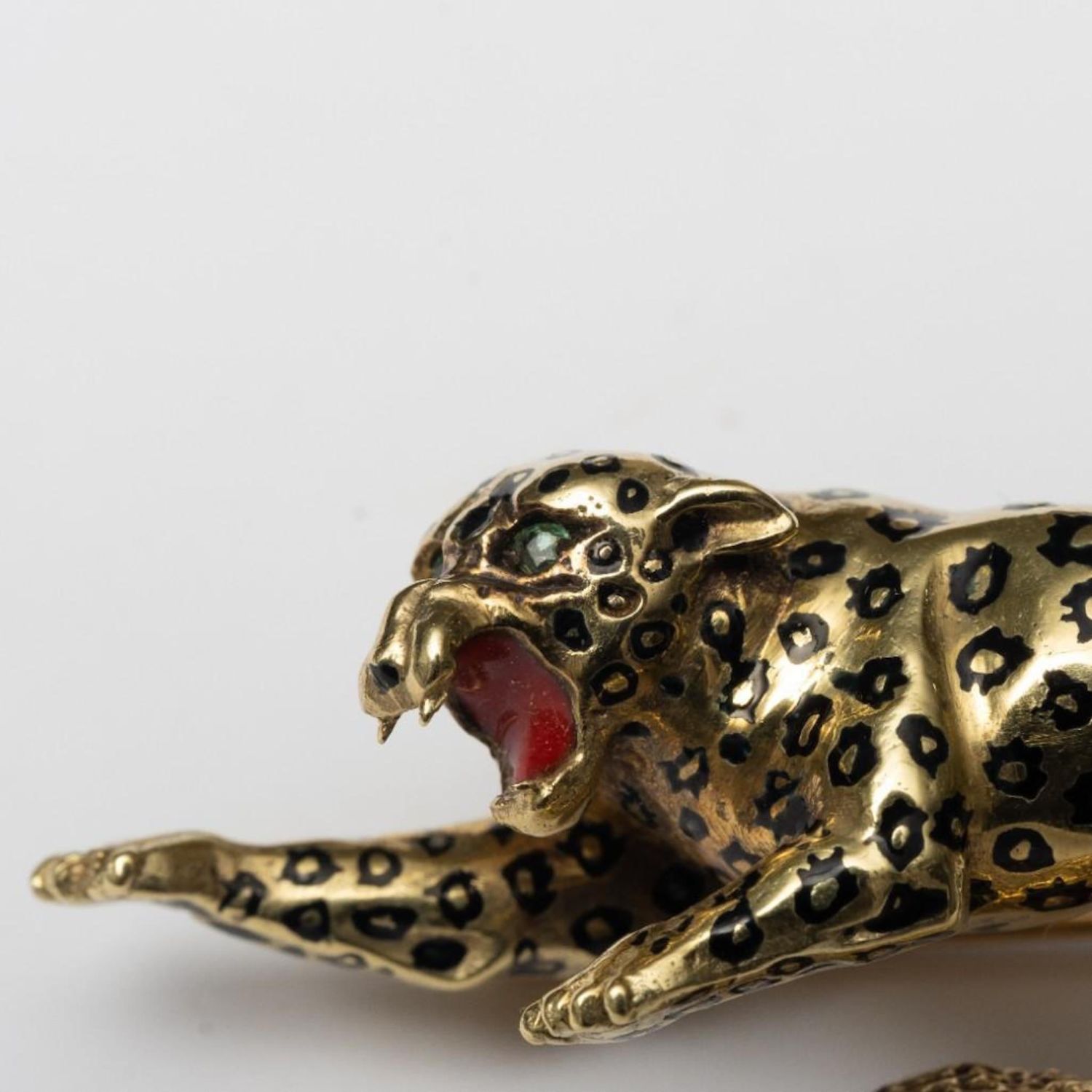 Vintage 14K Signed Gold Brooch Depicting a leaping leopard with emerald eyes. This item measures 2 1/4" x 1 1/8". It weighs 18.2 grams.
