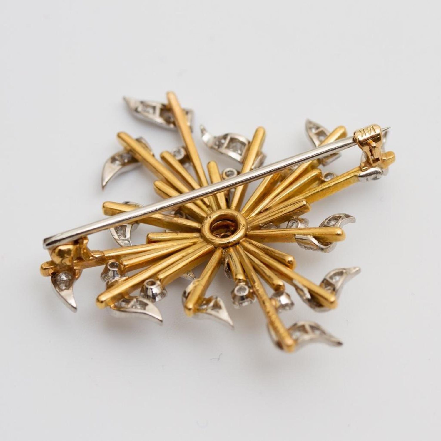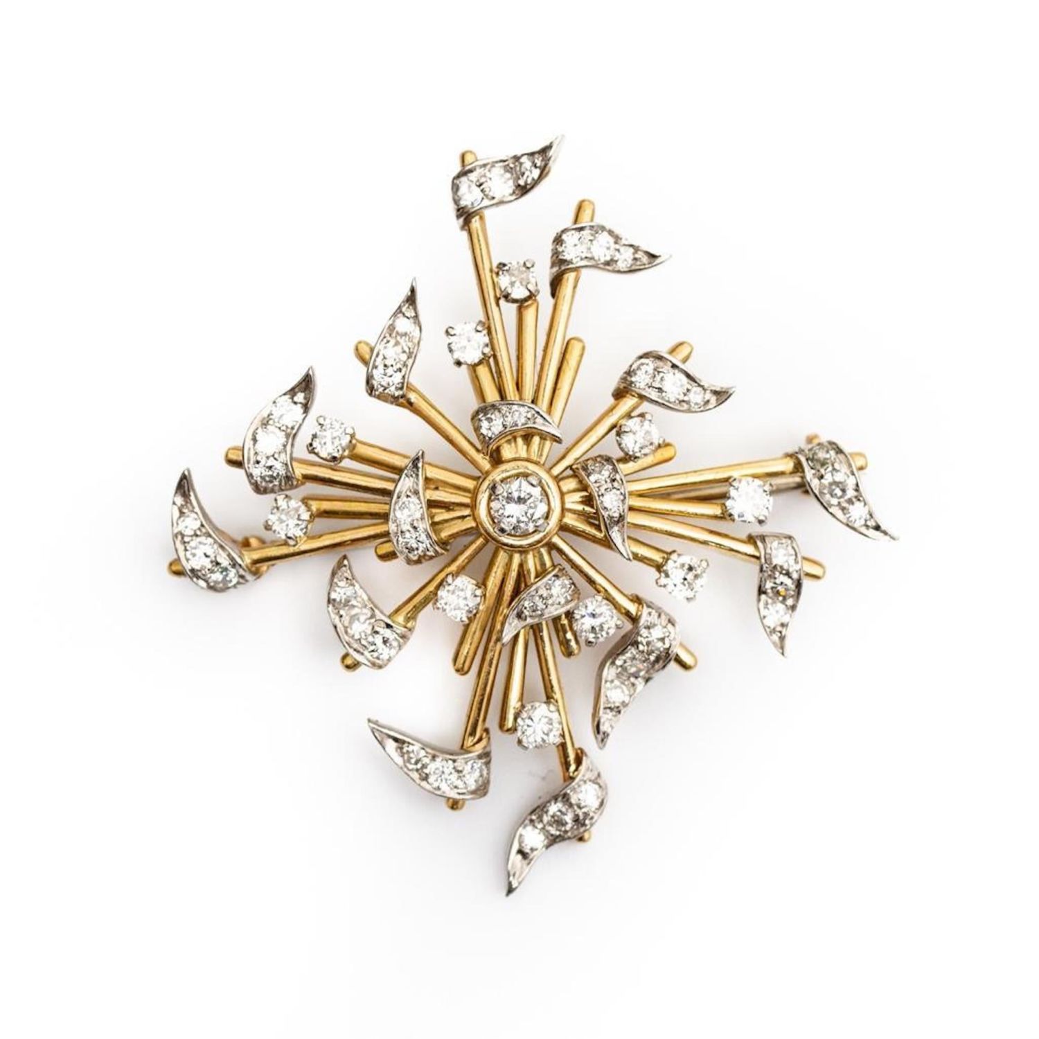 14k gold and Paltinum diamond starburst brooch circa 1950. Weighs 7.2dwt. This item is accompanied by a GIA appraisers letter from a well respected independent firm that has been in business for over 75 years. Measures 1.5