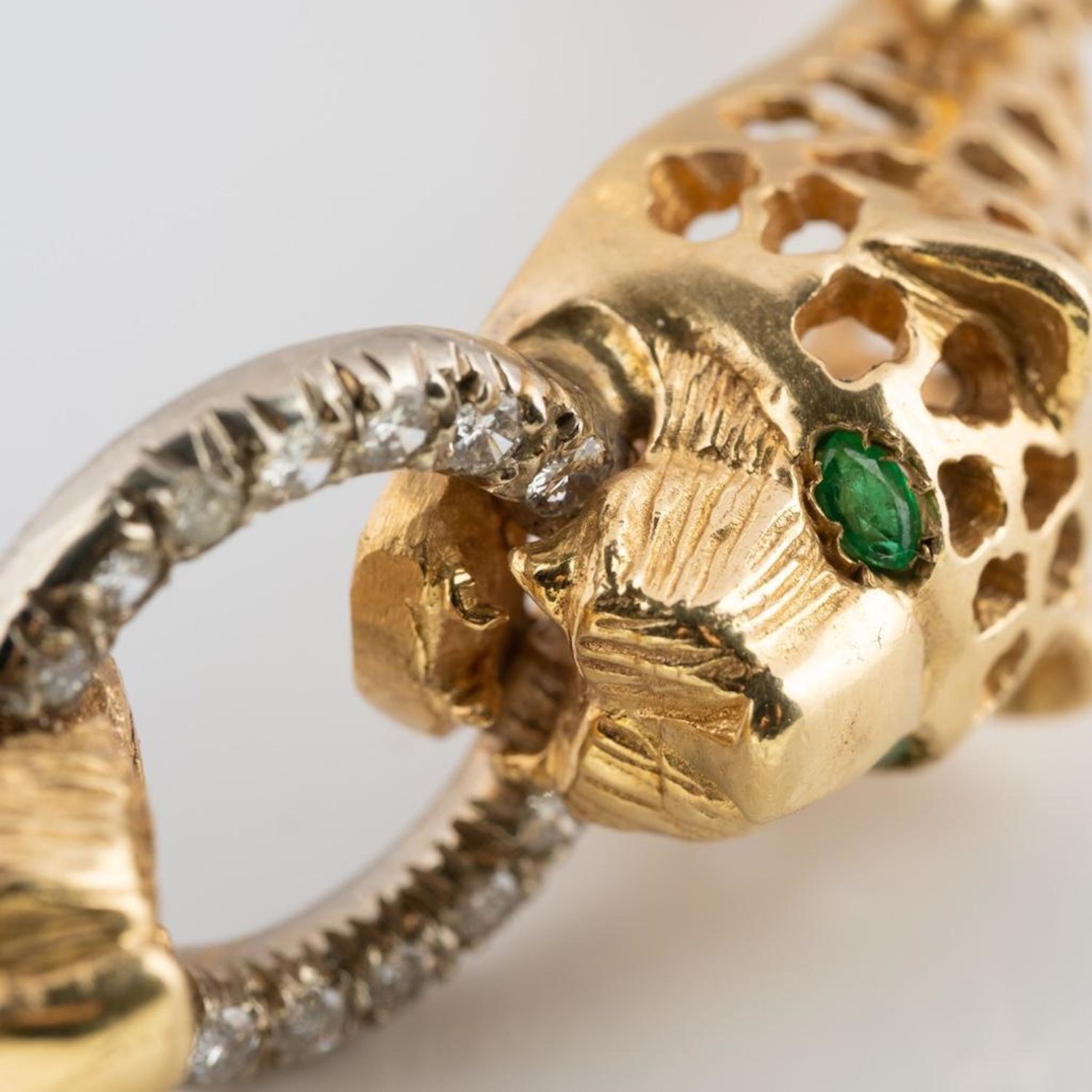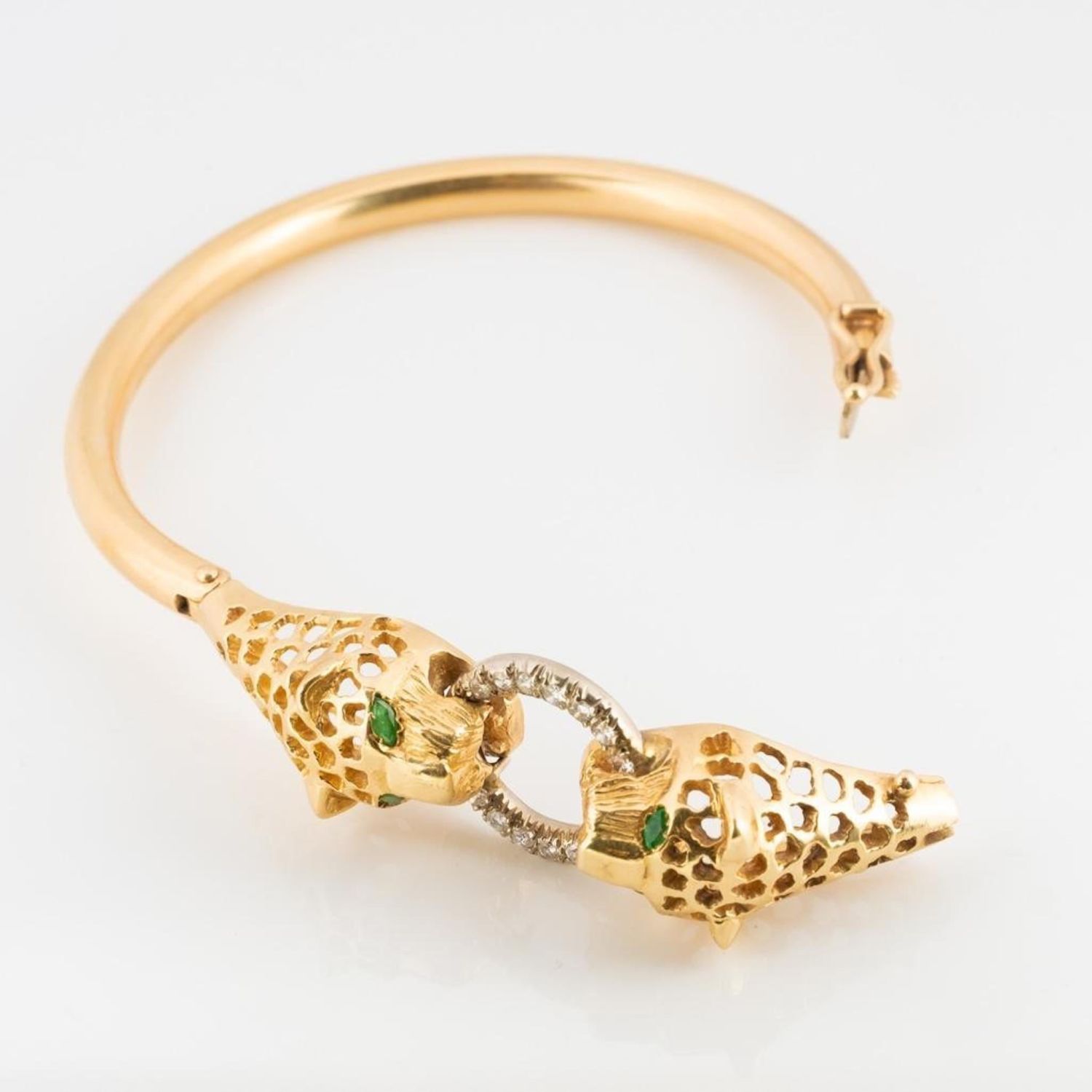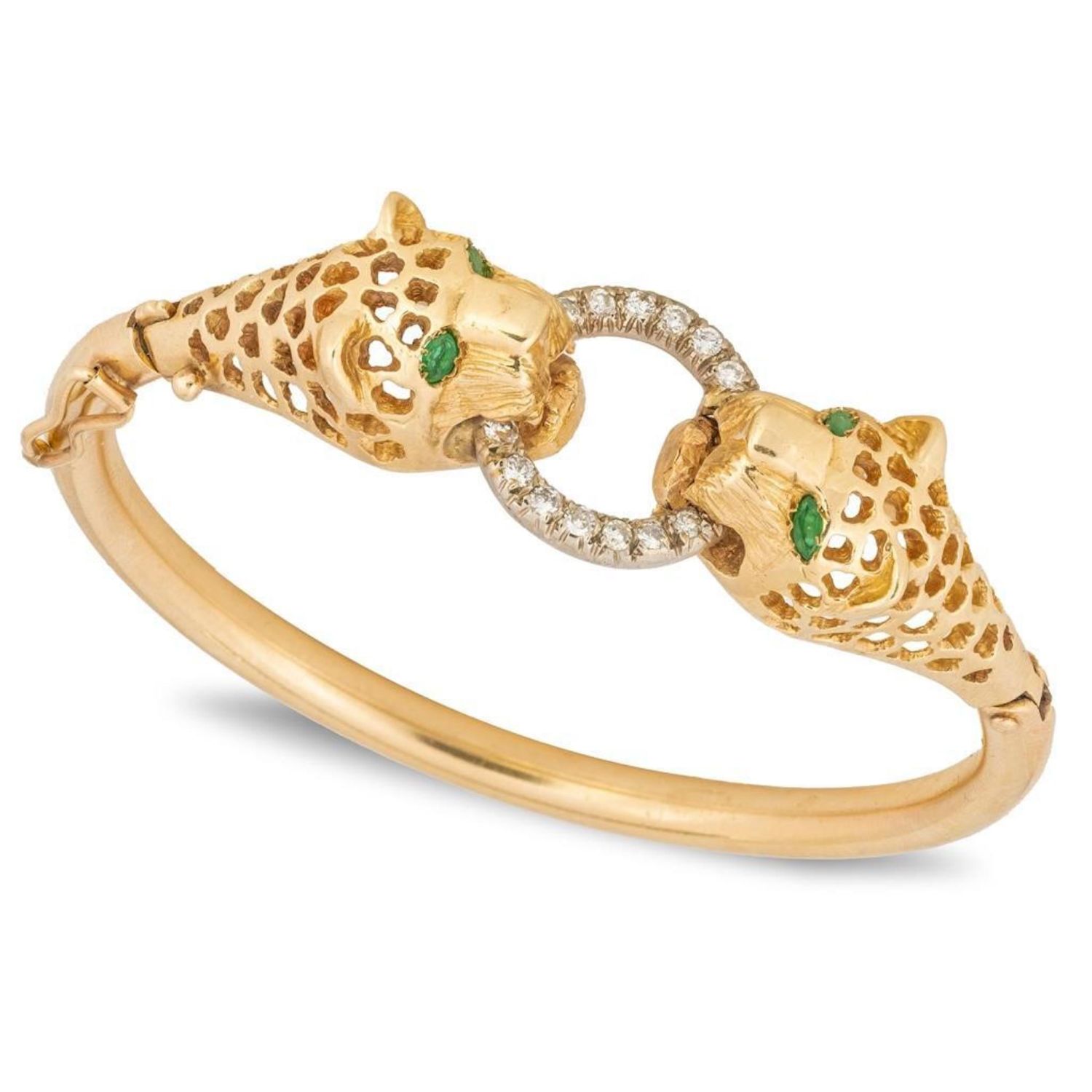 Cartier Panther style 14kt yellow gold hinged bracelet comprised of two panther heads with marquis cut emerald eyes suspending a diamond inlaid 14kt white gold ring in their mouths. Well executed. Stamped, "14K". Total approx. weight is 22.0 dwt (gross). From a Darien, CT estate. Dimensions: interior diameter of bracelet is approx. 6 1/2".in good condition