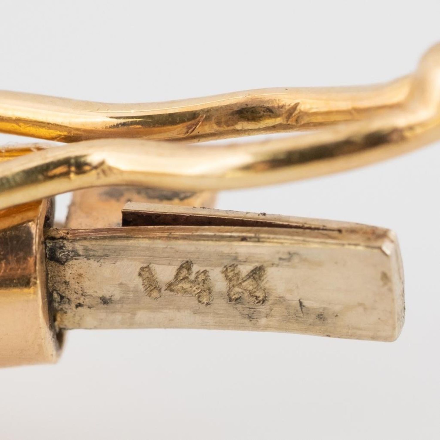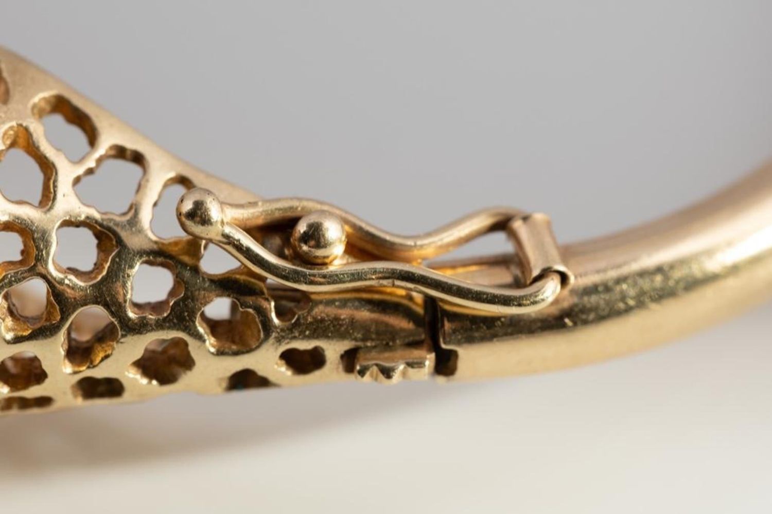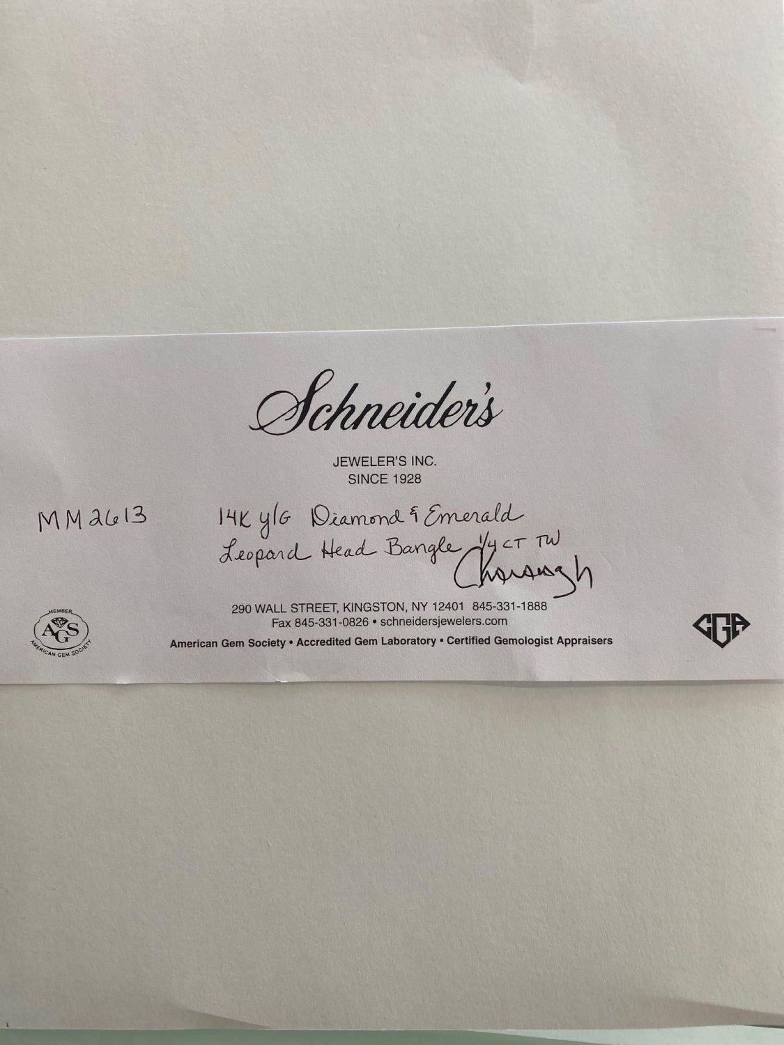 Cartier Panther style 14kt yellow gold hinged bracelet comprised of two panther heads with marquis cut emerald eyes suspending a diamond inlaid 14kt white gold ring in their mouths. Well executed. Stamped, "14K". Total approx. weight is 22.0 dwt (gross). From a Darien, CT estate. Dimensions: interior diameter of bracelet is approx. 6 1/2".in good condition