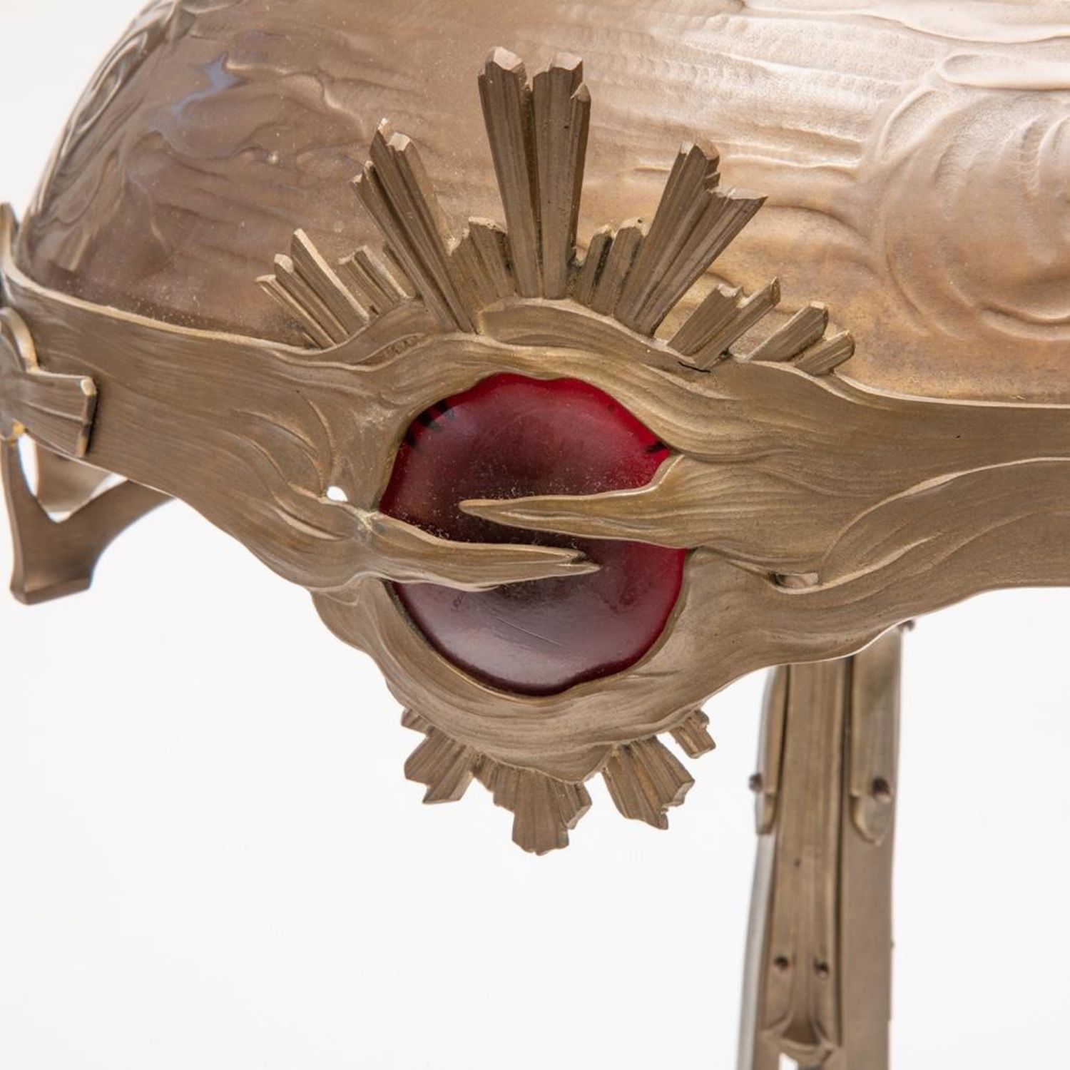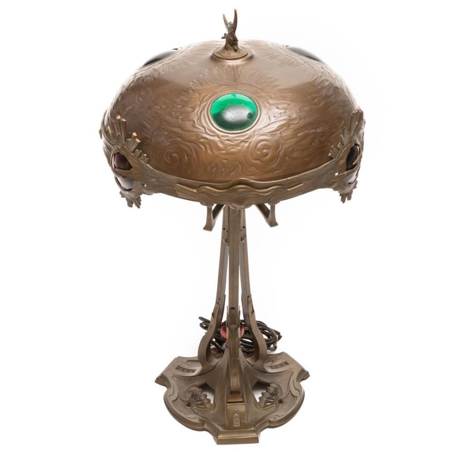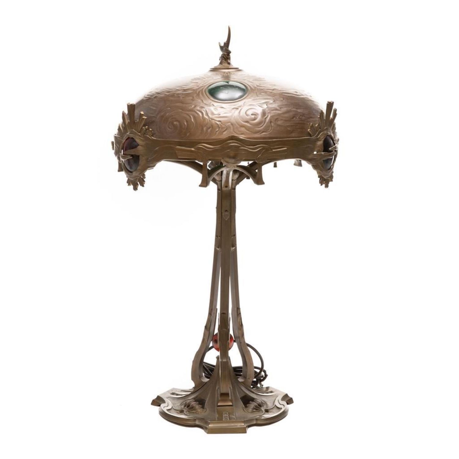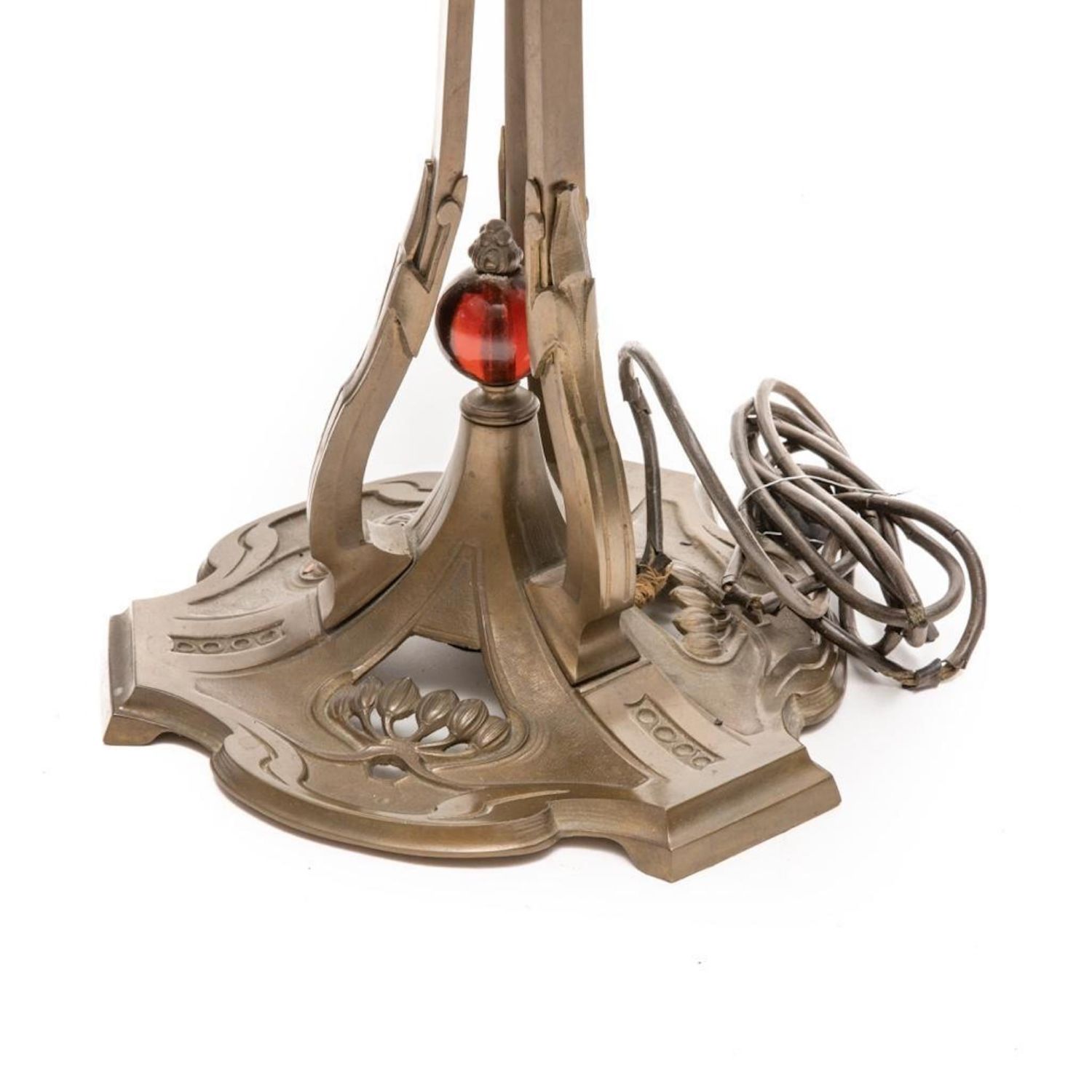 Art Nouveau bronze Table Lamp, early 20th century, in the style of Georges Leleu, patinated metal and glass, unmarked, ht. approx. 27, dia. 14 in. One glass shade jewel with chip. Lights but we recommend rewiring. all else in good condition
