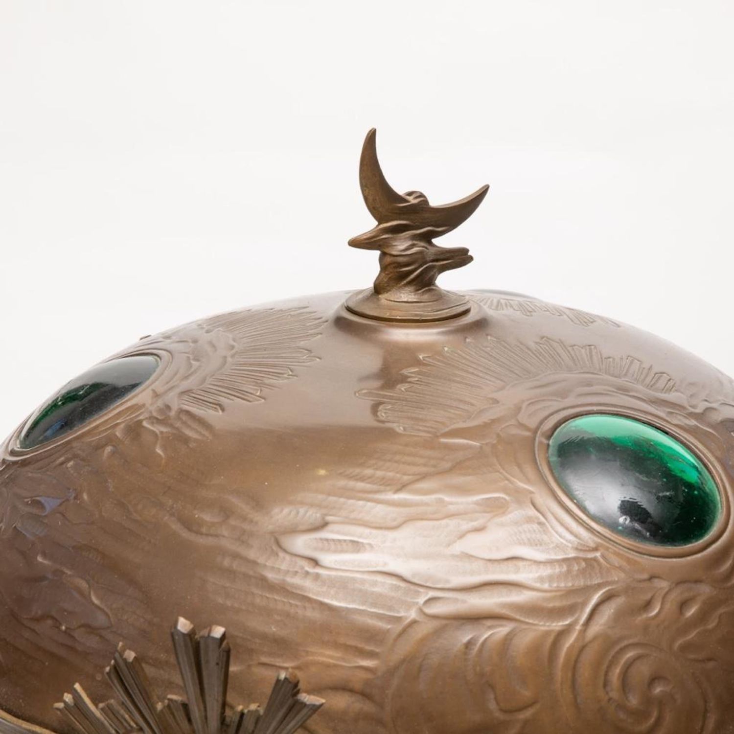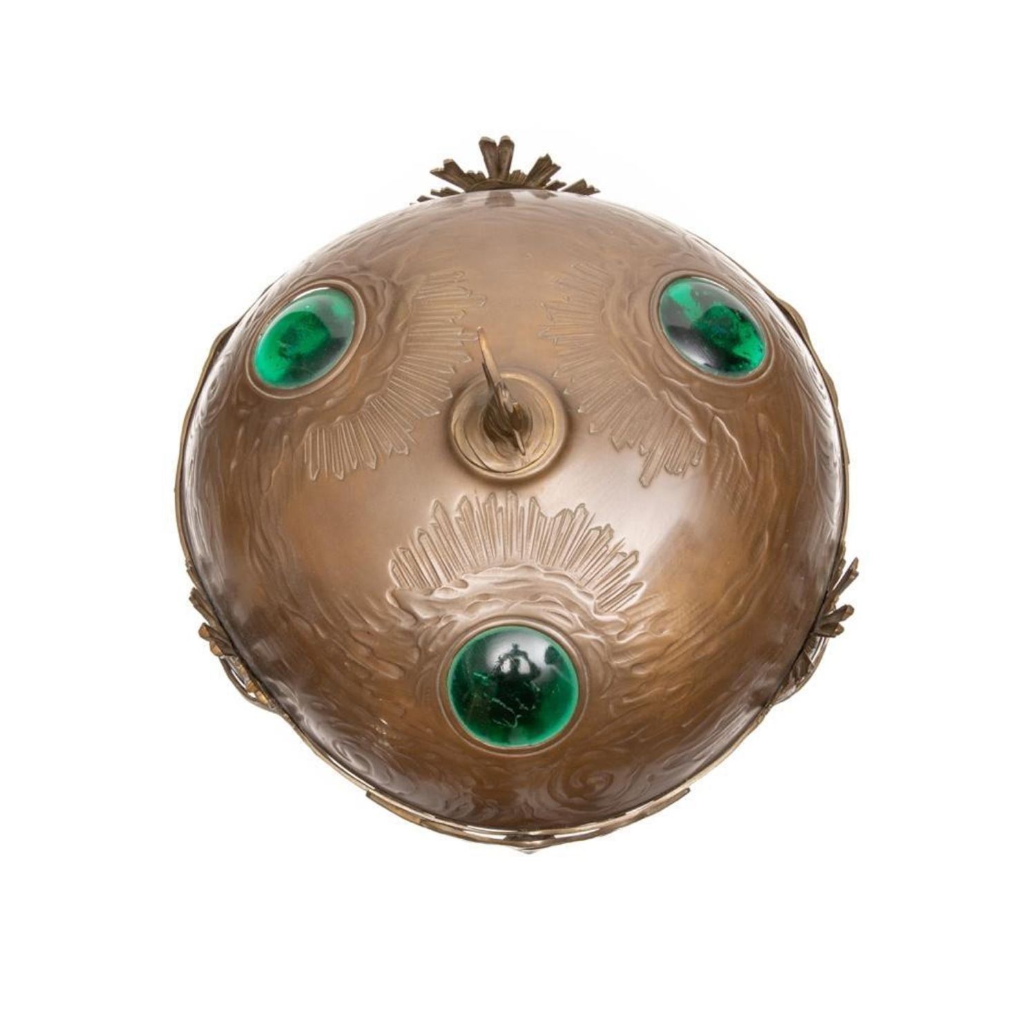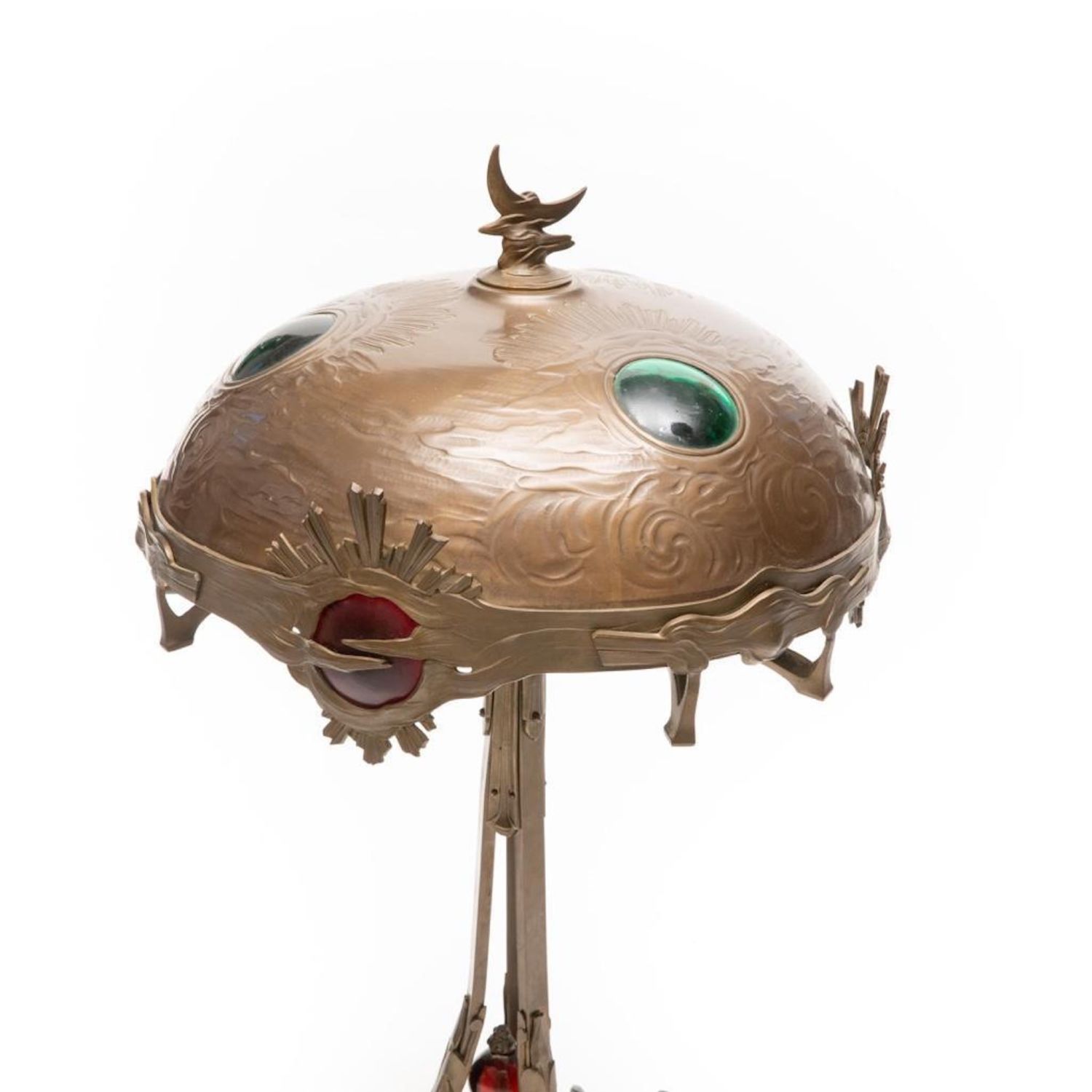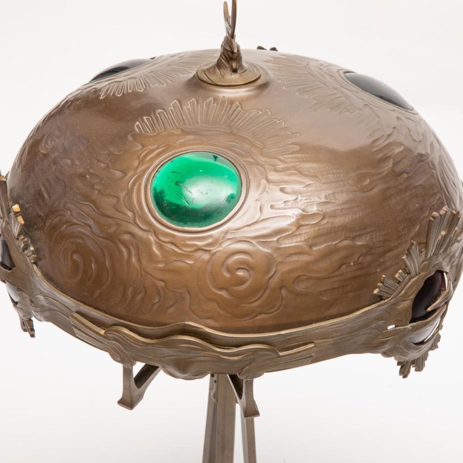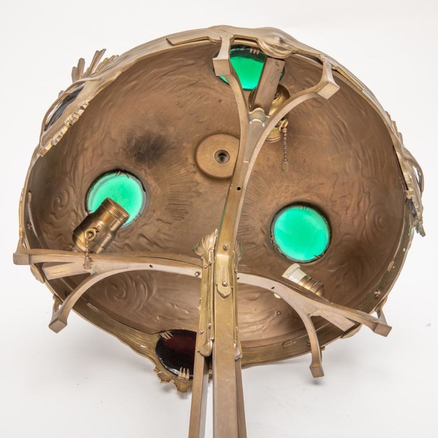 Art Nouveau bronze Table Lamp, early 20th century, in the style of Georges Leleu, patinated metal and glass, unmarked, ht. approx. 27, dia. 14 in. One glass shade jewel with chip. Lights but we recommend rewiring. all else in good condition