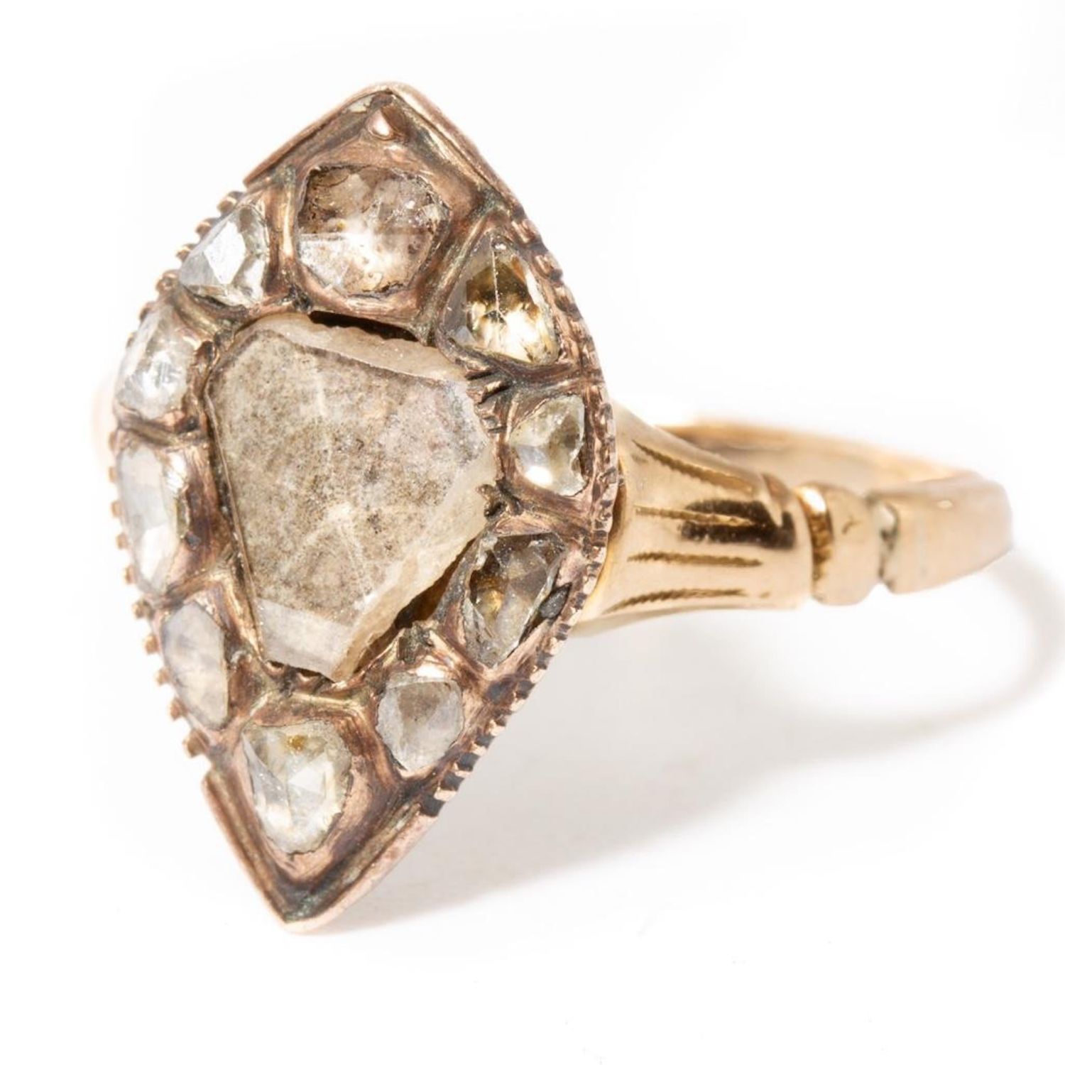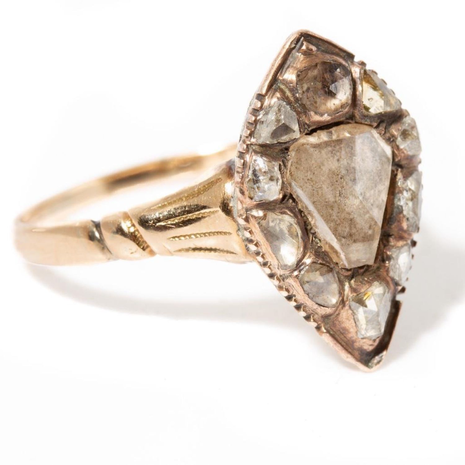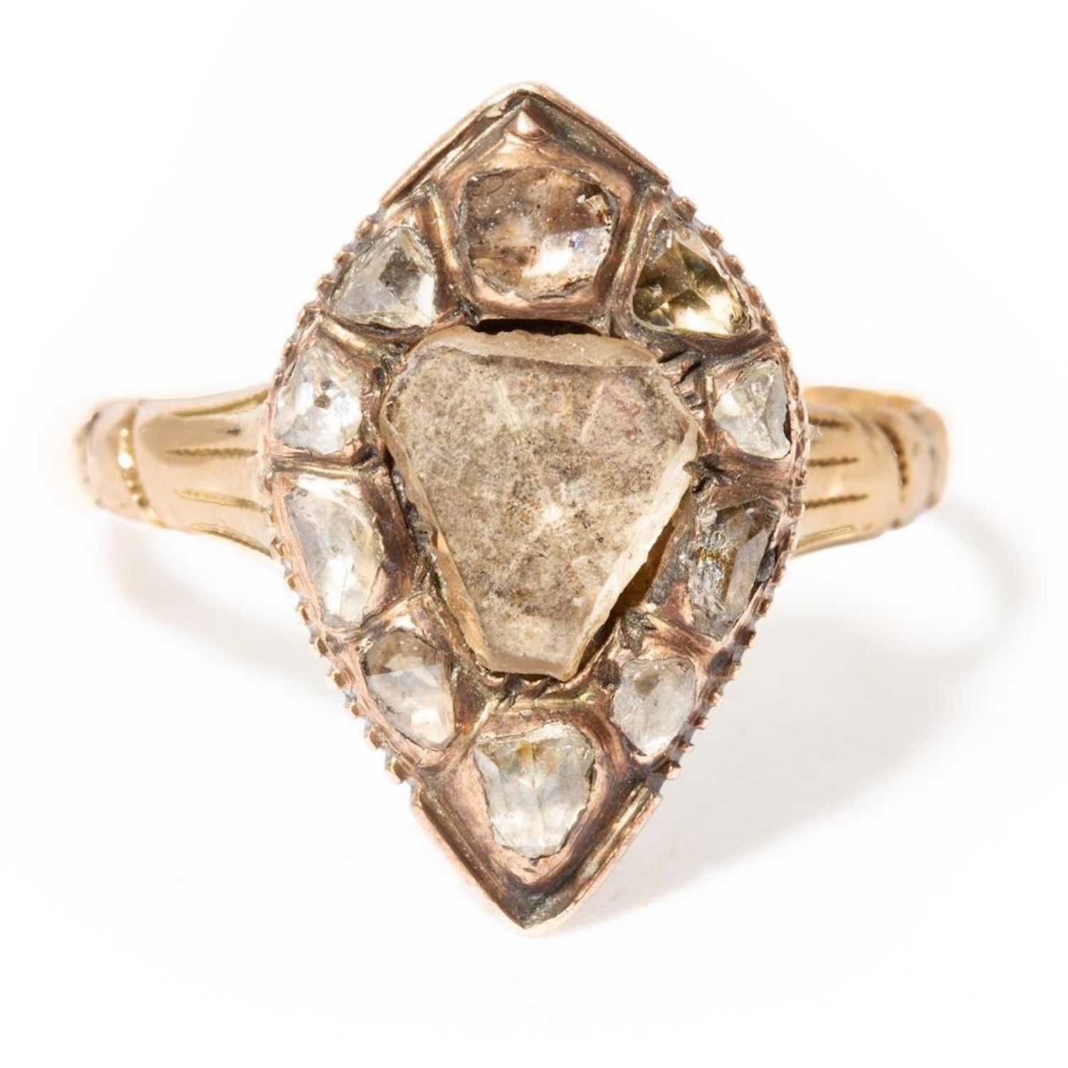 18th Century Diamond setting remounted on a Edwardian 14k gold ring band. The 11 rose cut diamonds are set in silver mounting that dates to the 18th century and has been remounted to a Edwardian ring band. Size 8 approx. 2.3dwt antique and in good condition but needs cleaning to sparkle