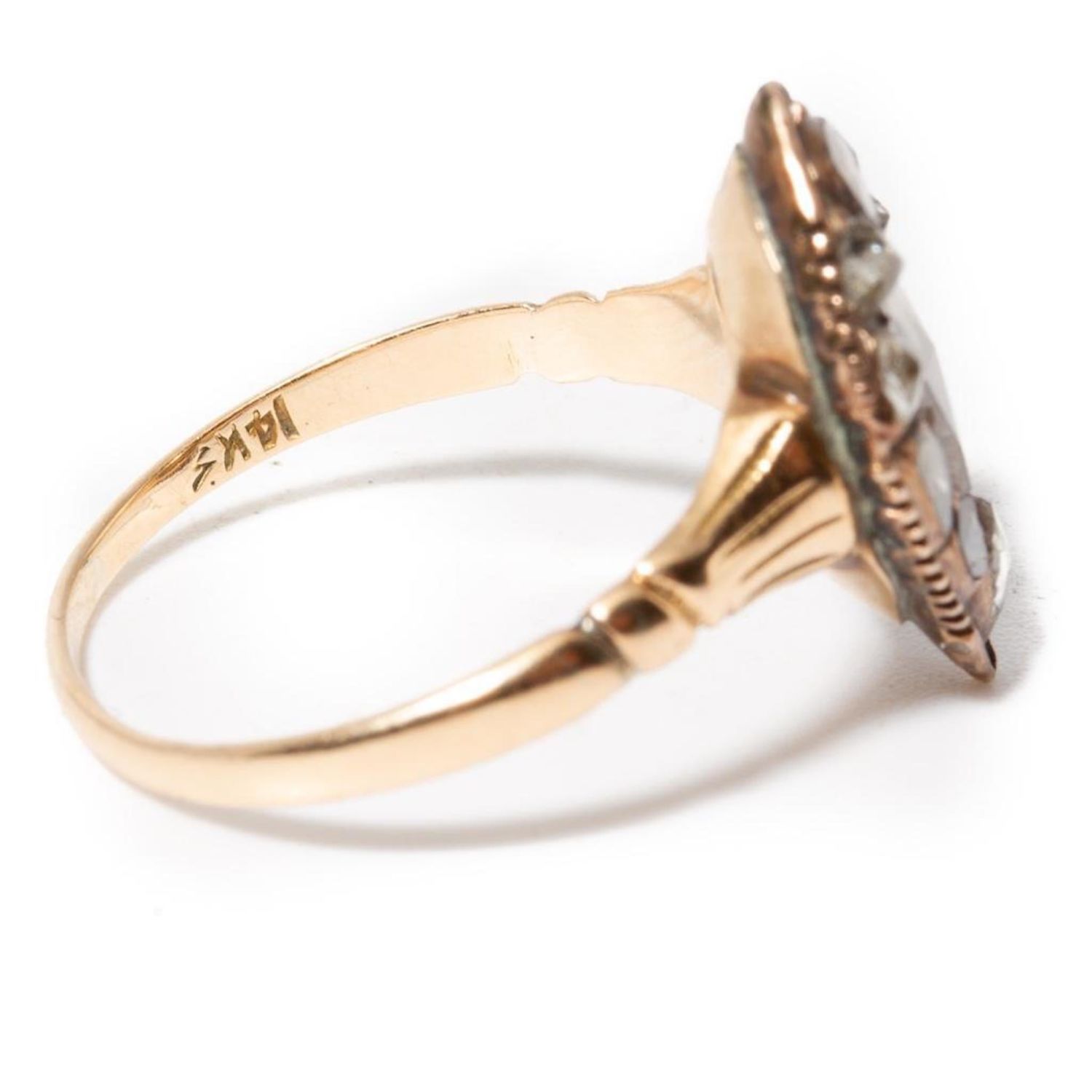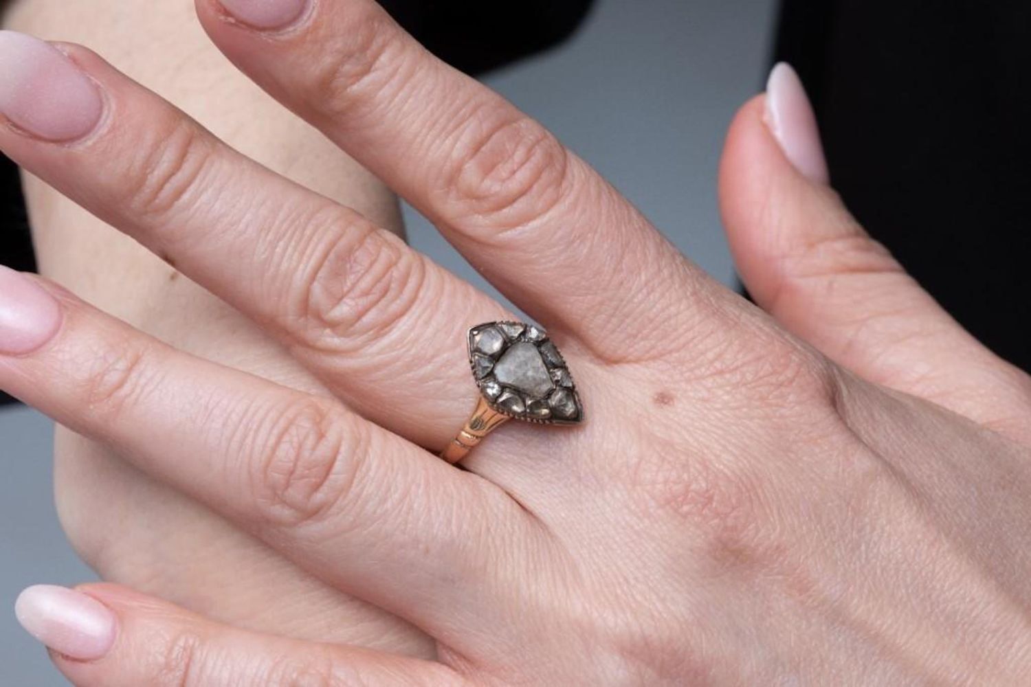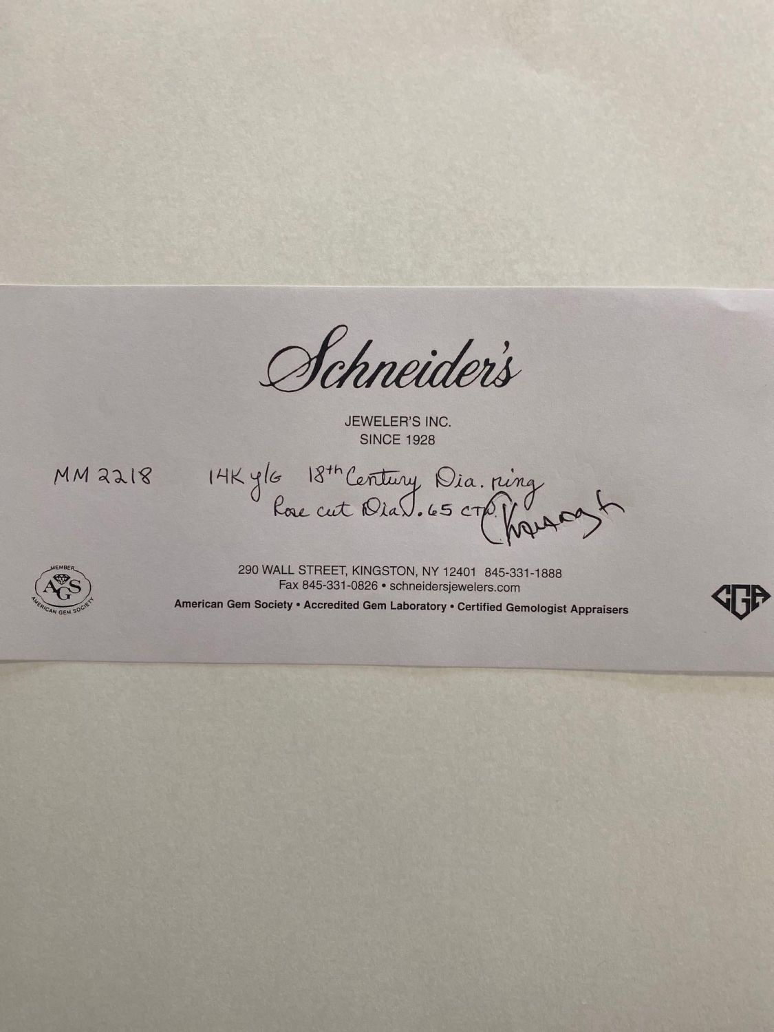 18th Century Diamond setting remounted on a Edwardian 14k gold ring band. The 11 rose cut diamonds are set in silver mounting that dates to the 18th century and has been remounted to a Edwardian ring band. Size 8 approx. 2.3dwt antique and in good condition but needs cleaning to sparkle