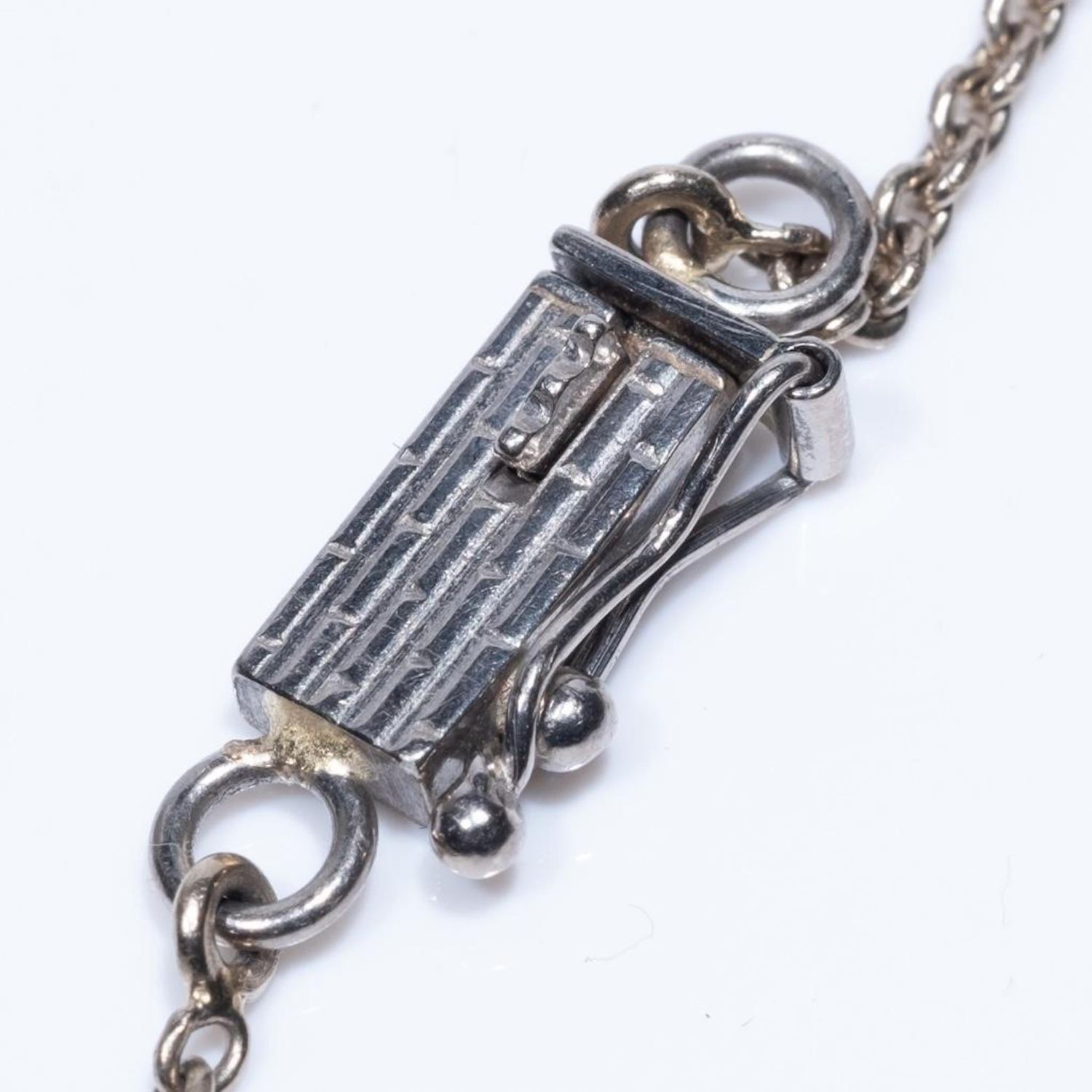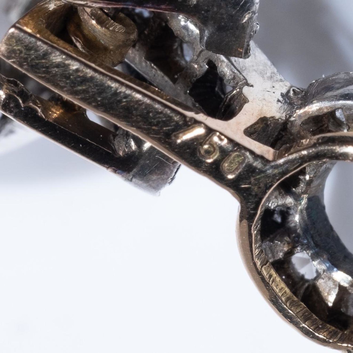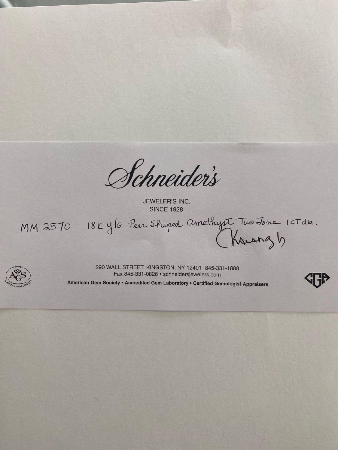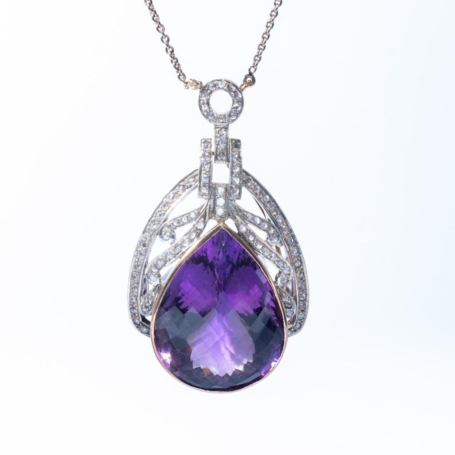 Impressive Large amethyst & rose cut diamond 18K two tone articulated necklace showcasing an approx. 65ct. fantasy cut pear shaped amethyst in a yellow gold bezel, framed with ornate white gold scroll work design. Encrusted with approx. 2 cts. bead set rose cut diamonds, completed with a circular articulated diamond bail. Measures 16"L, 18K white gold chain with 2.25" drop. Total weight 31 grams vintage and in good condition