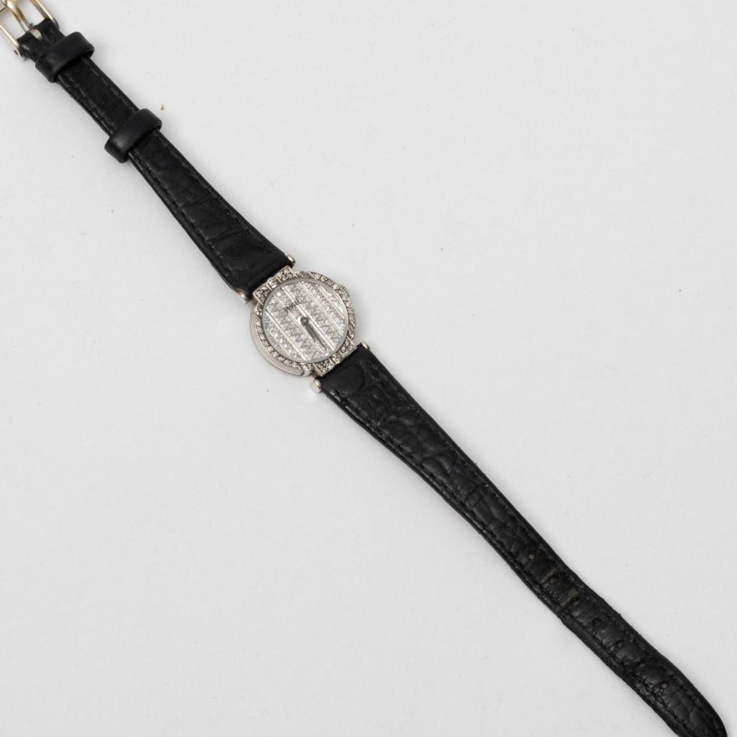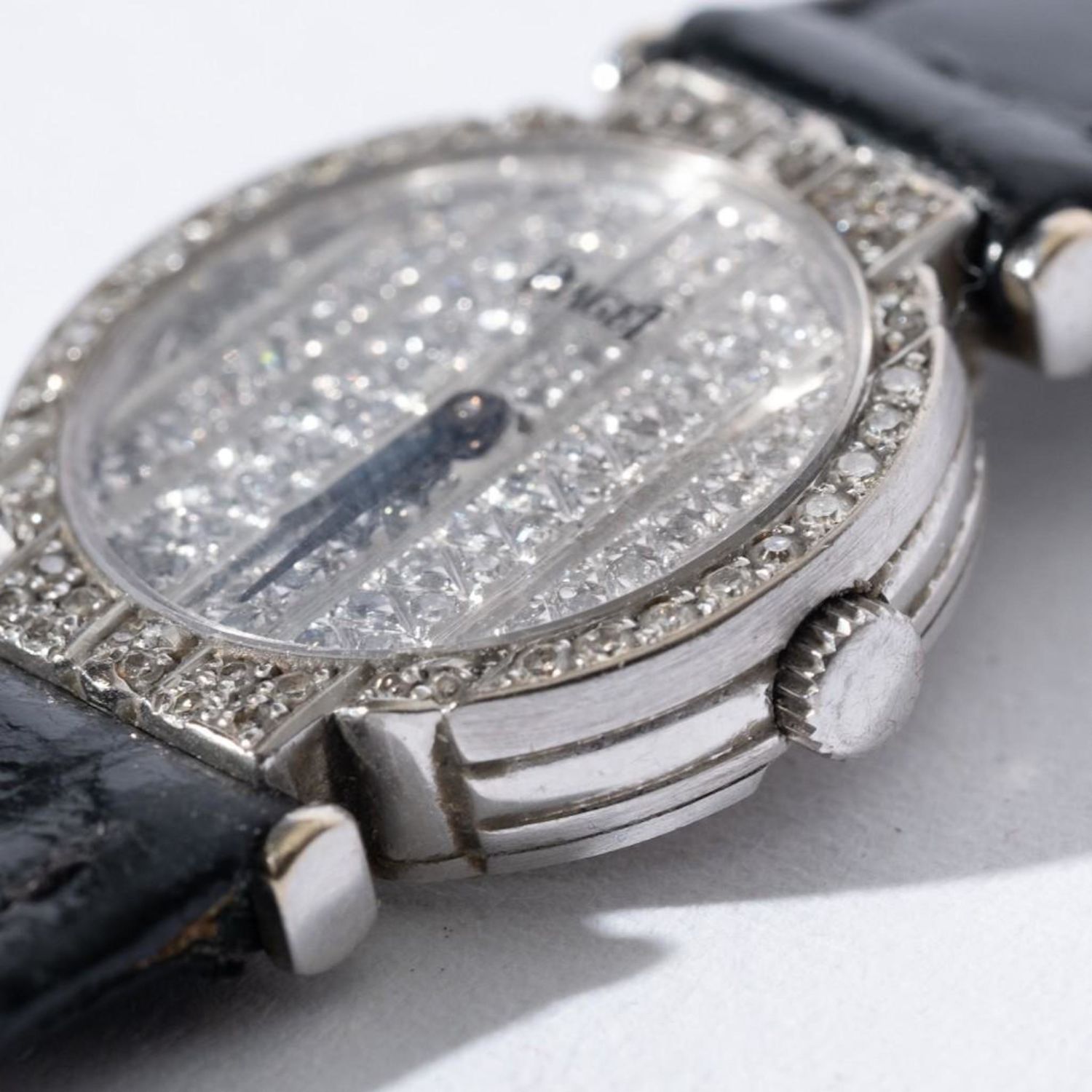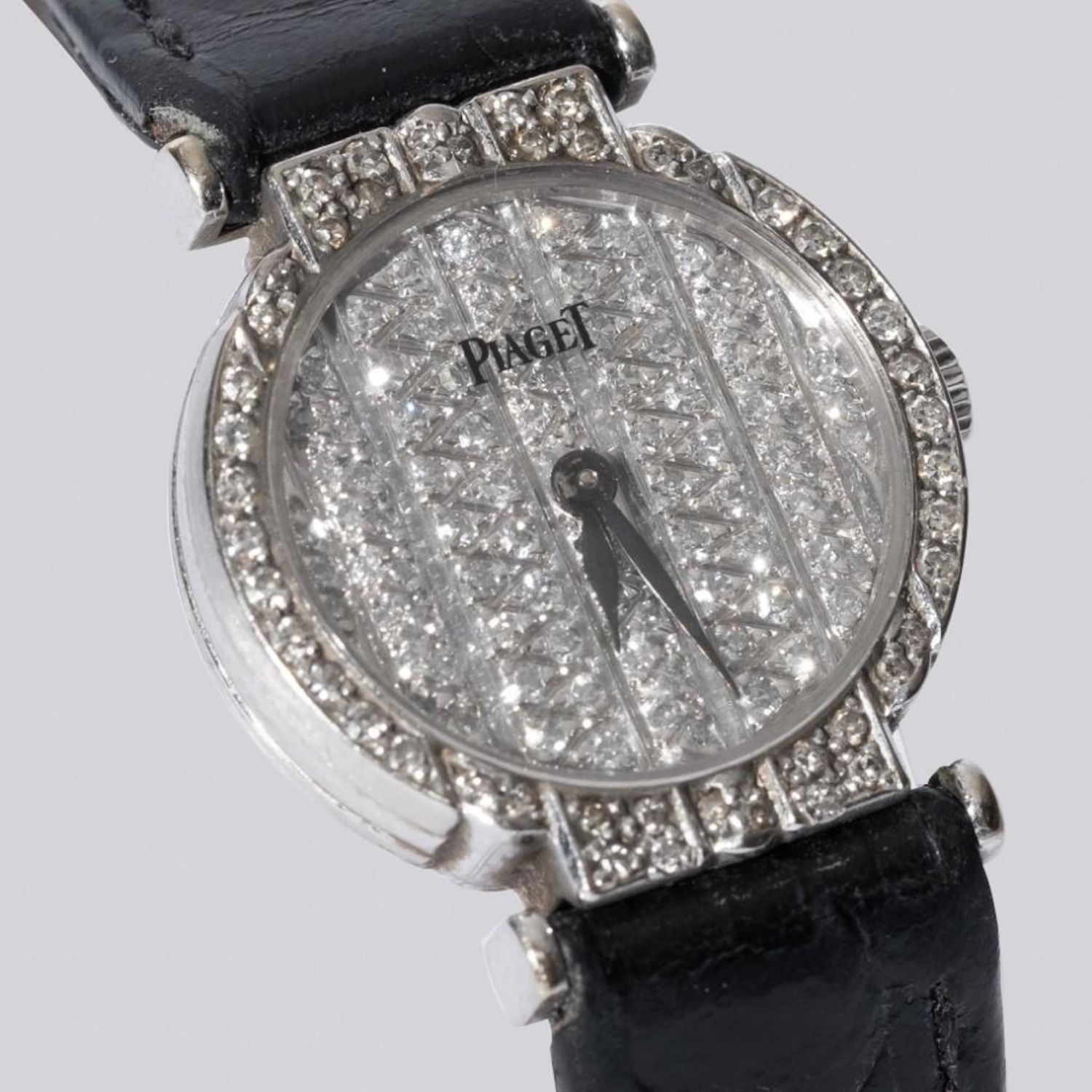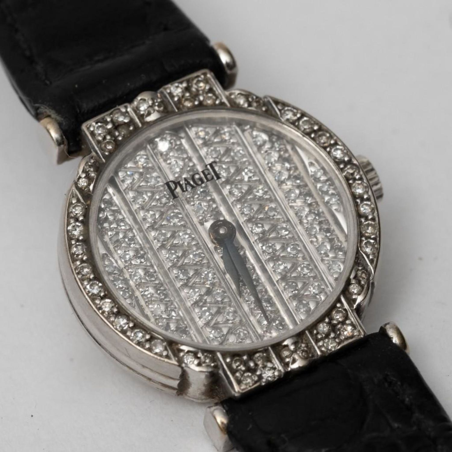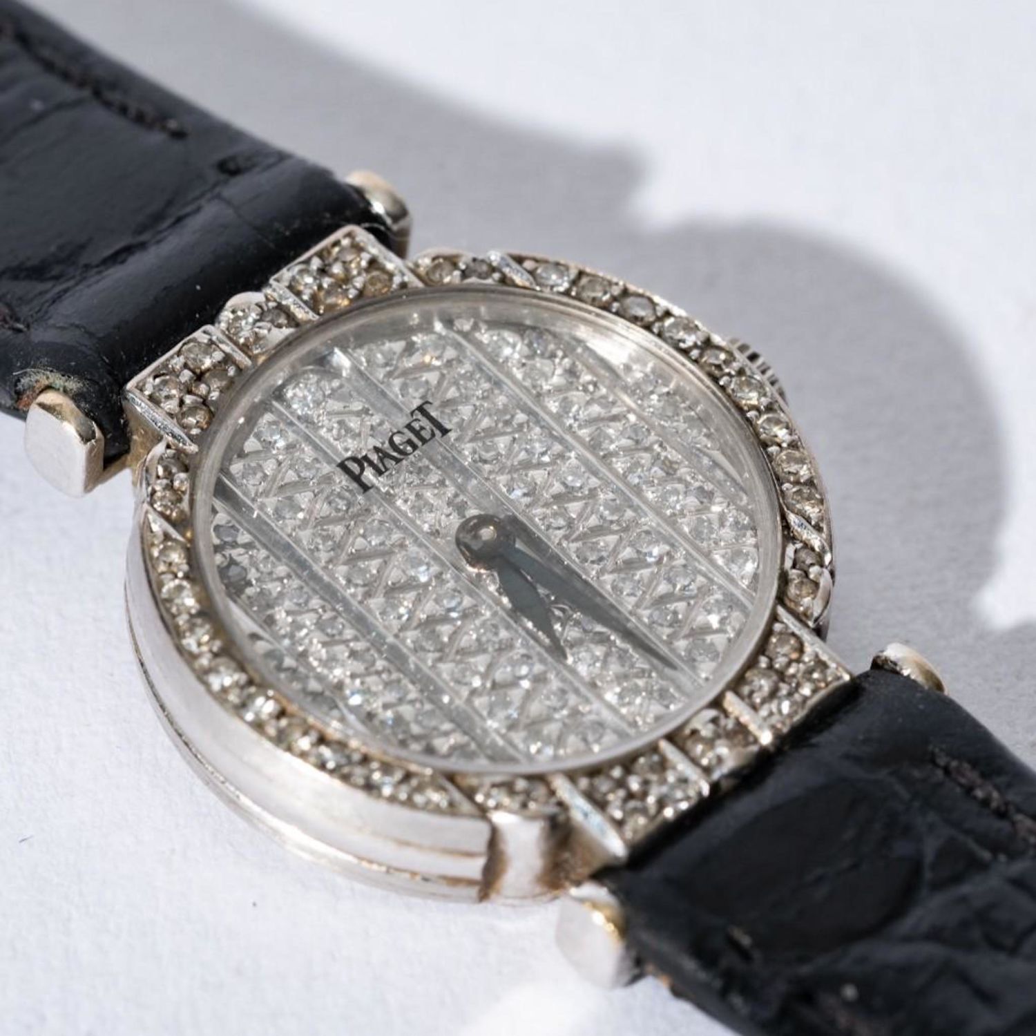 18k gold diamond encrusted Lady’s Piaget Polo watch, featuring all pave diamond dial and diamond case. With 18k gold Piaget buckle Band is 7 1/4" long. Case approx 20mm in diameter. Quartz movement. Please note the gallery does not warranty the running condition of watches. working when examined