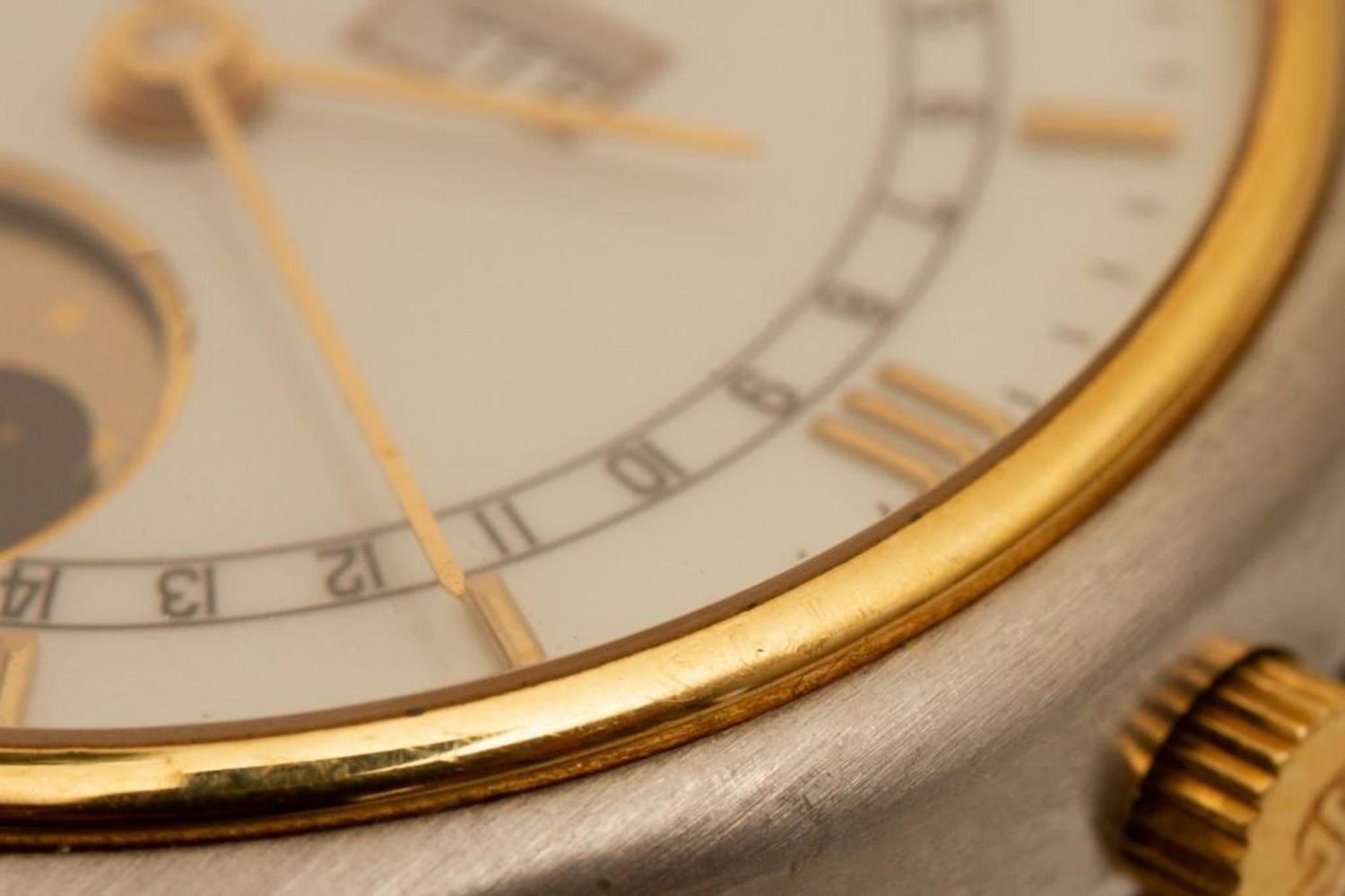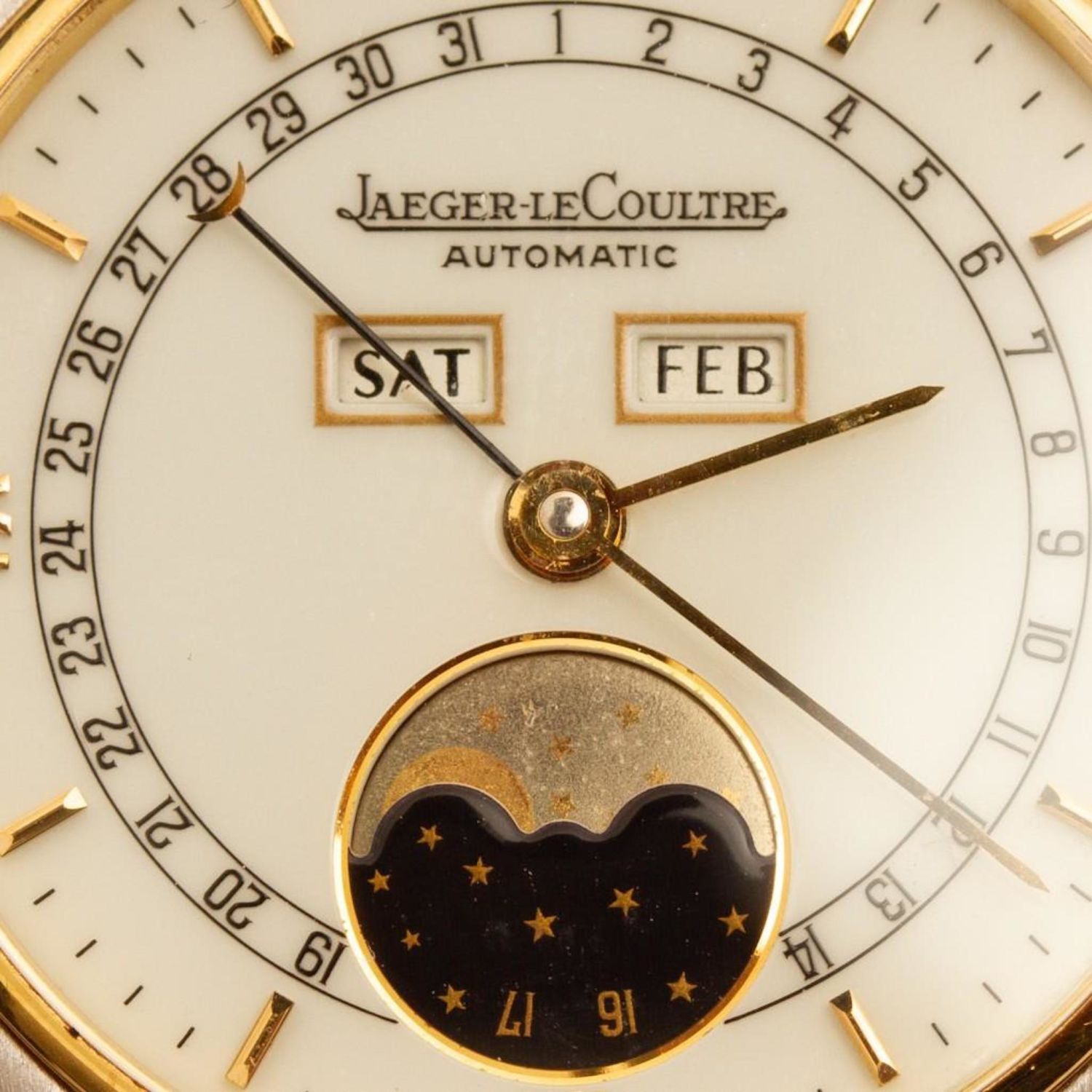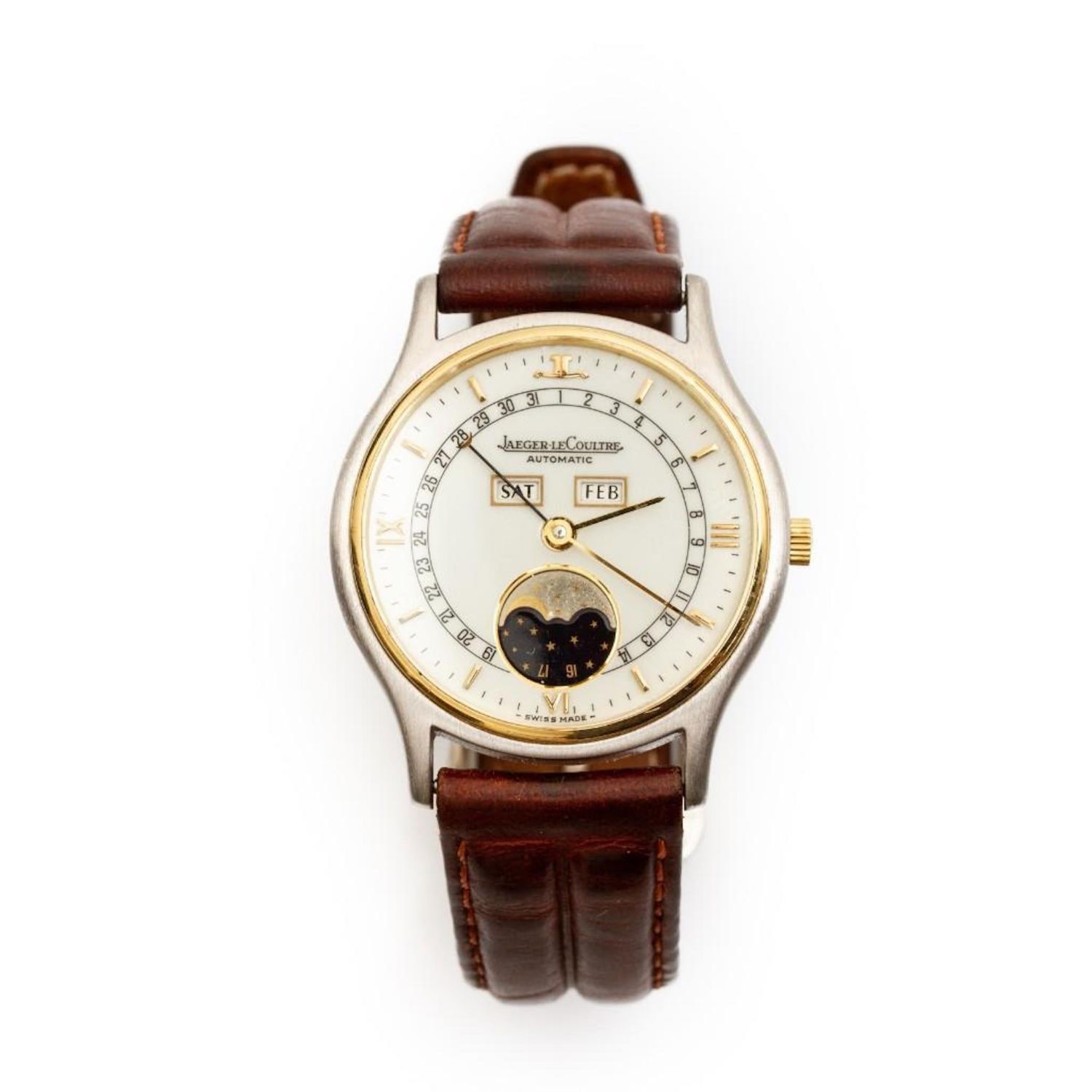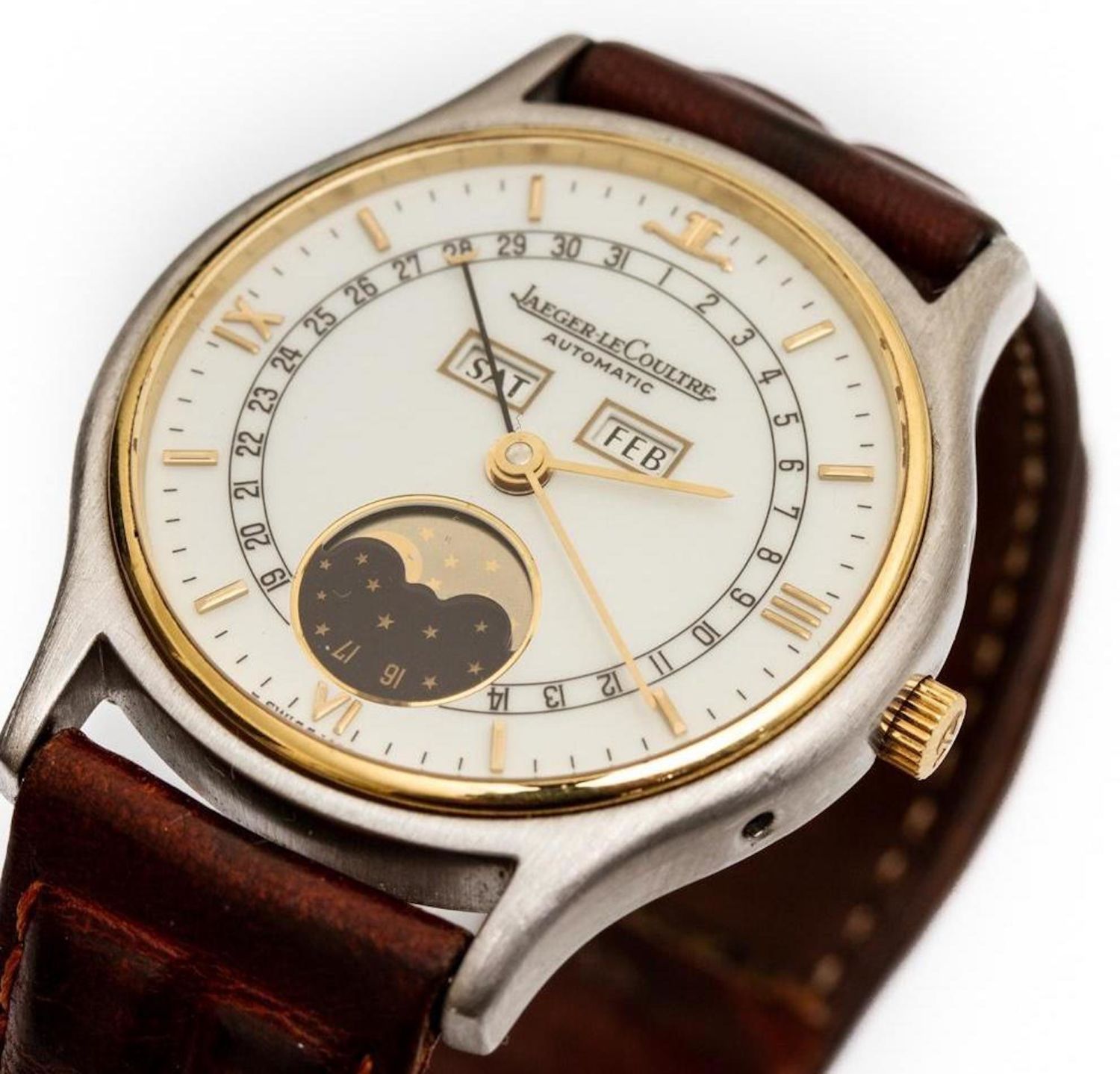 Jaeger LeCoultre 18K yellow gold and stainless steel automatic watch with day, date and moon phase, serial number: "141.119.5 / 1607487." 34mm diameter. Please note the gallery does not warranty the running condition of watches, This is a nice watch, in good condition and running when evaluated.