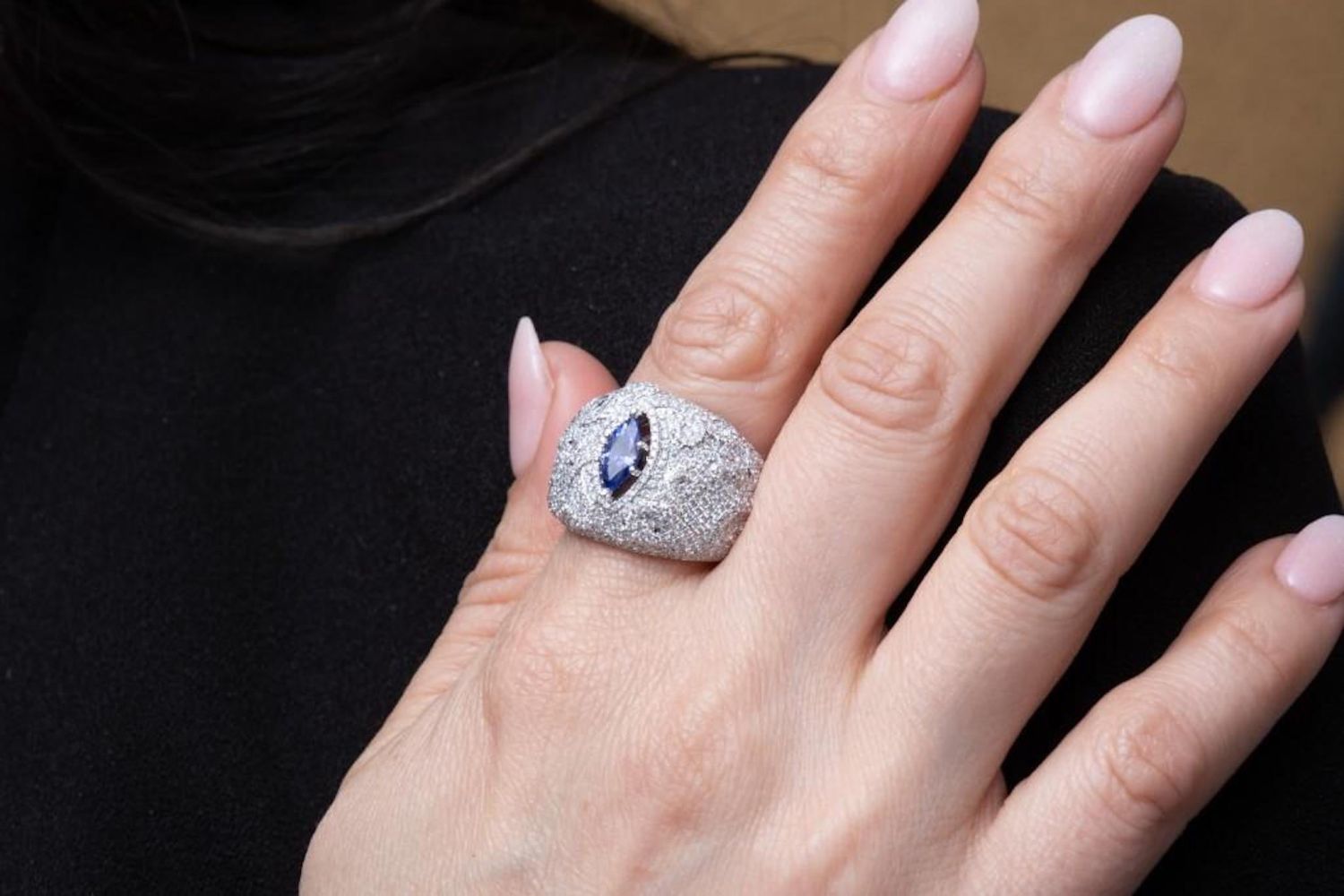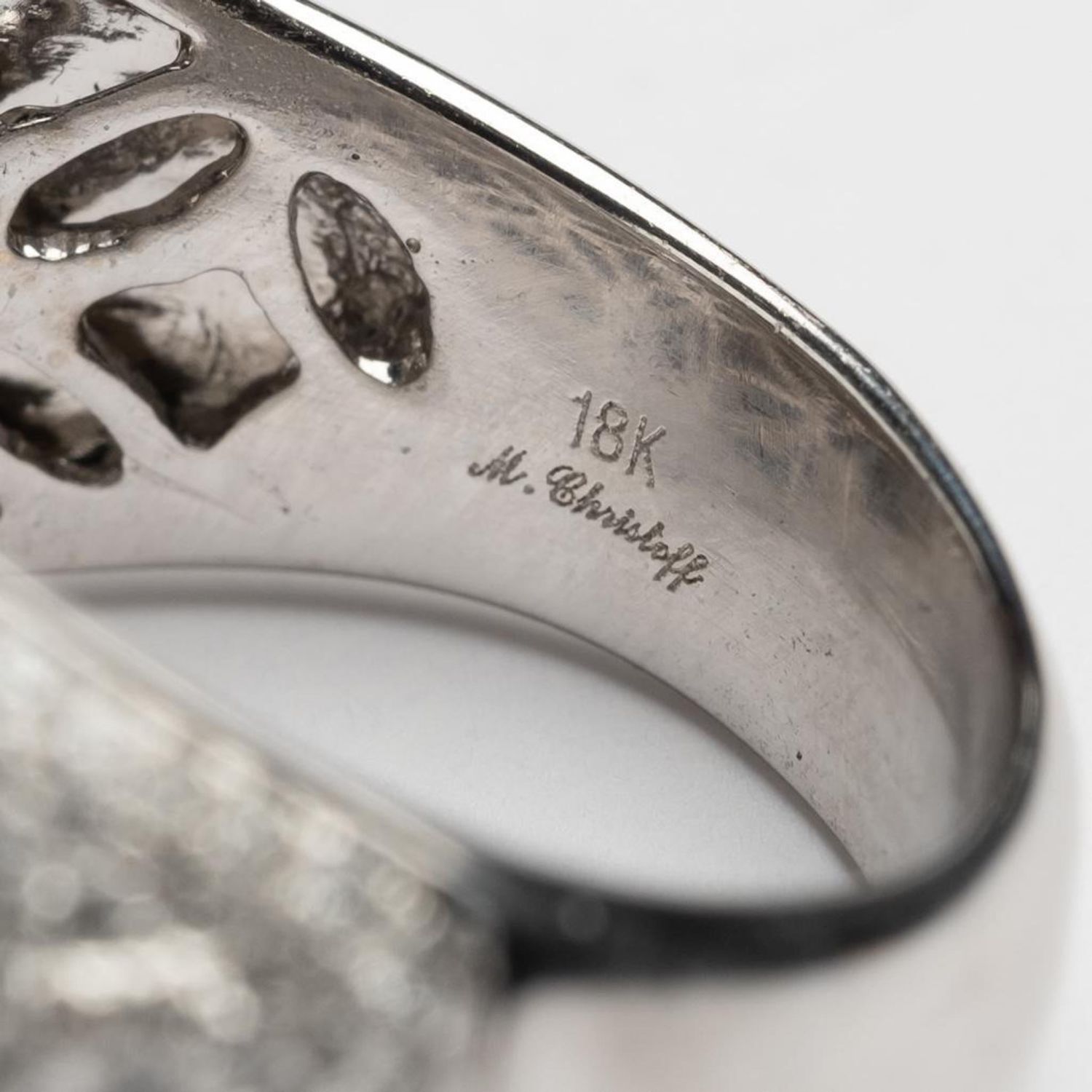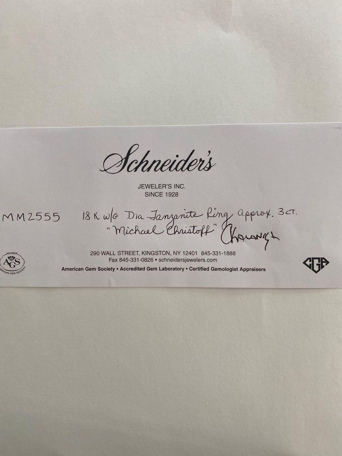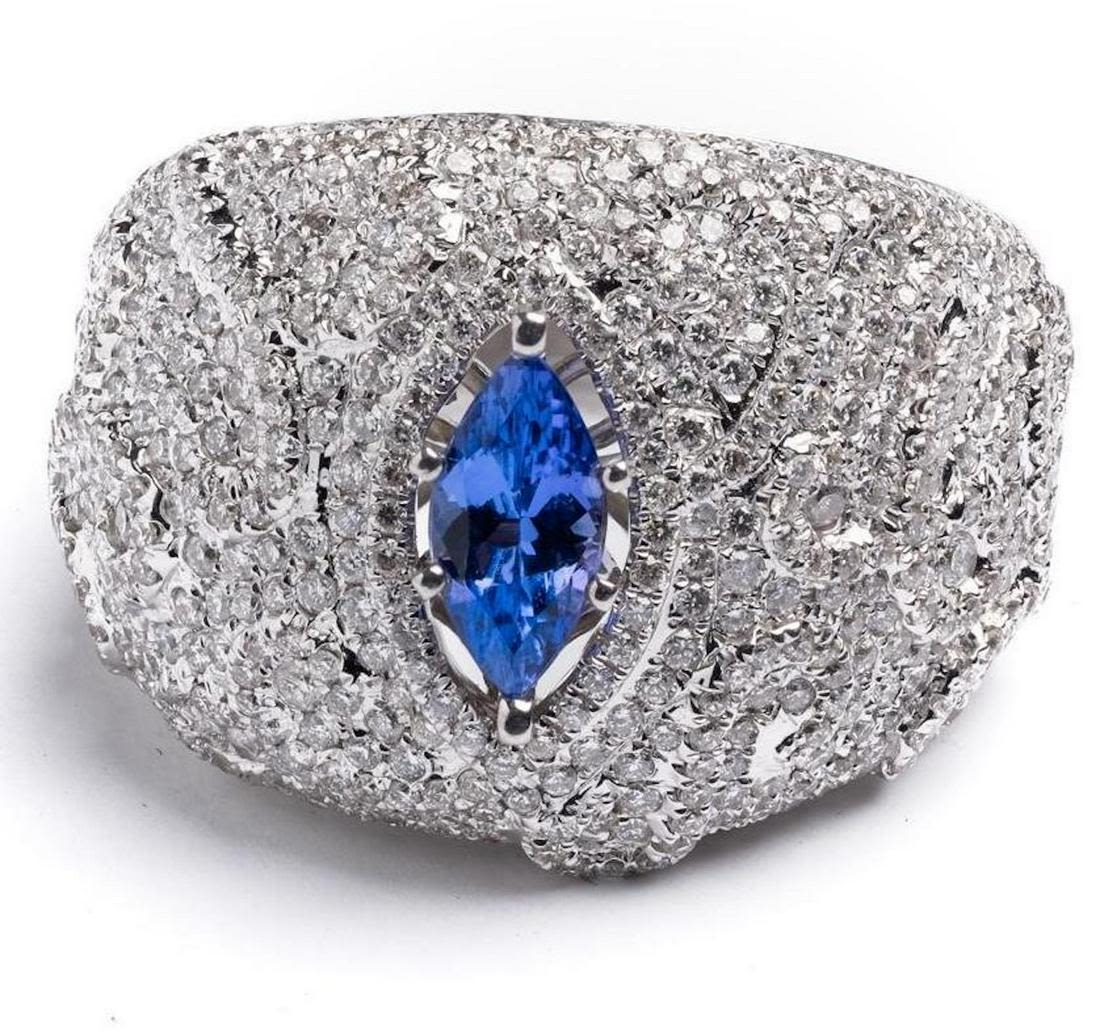 michael Christoff signed 18k white gold diamond and tanzanite dome shaped ring set with approx 3.00 ctw of diamonds and a good color natural tanzanite that is a little less than 1 carat. . Ring size – 9.5, ring top is 20mm wide. Marked: M. Christoff, D0.54, D2.42. Weight – 17.3 grams. in good condition.Note: there are several hundred brilliant cut diamonds surrounding the central stone which are actually set in a raised vine motif that trails down each side of the ring, it is hard to see because of the diamonds reflections and sparkle…very cool ring that retailed for almost $30,000