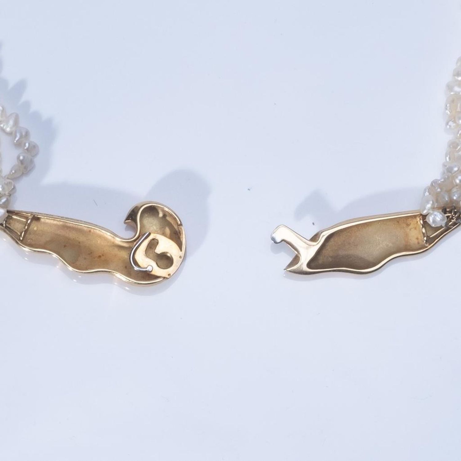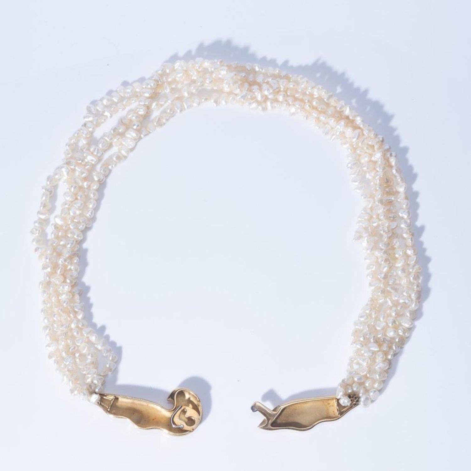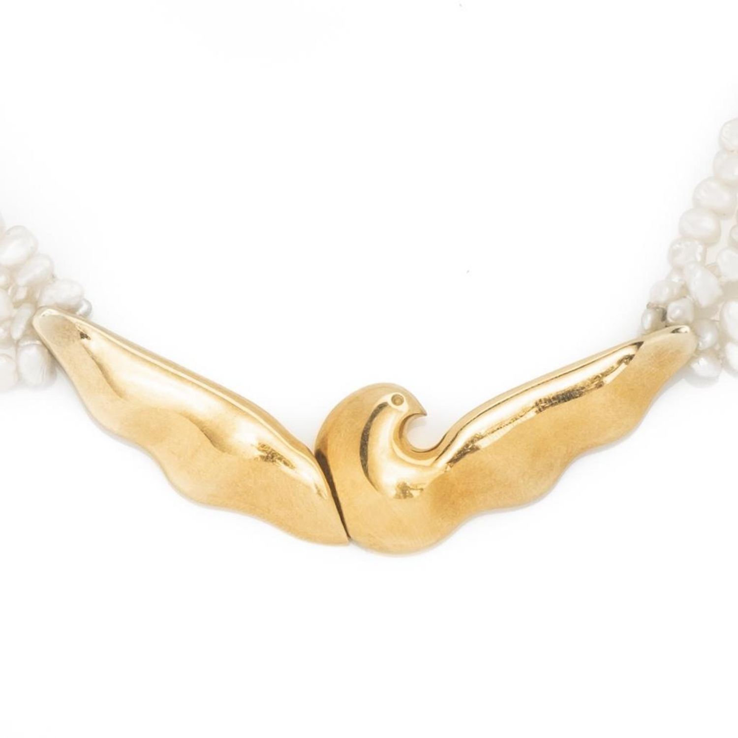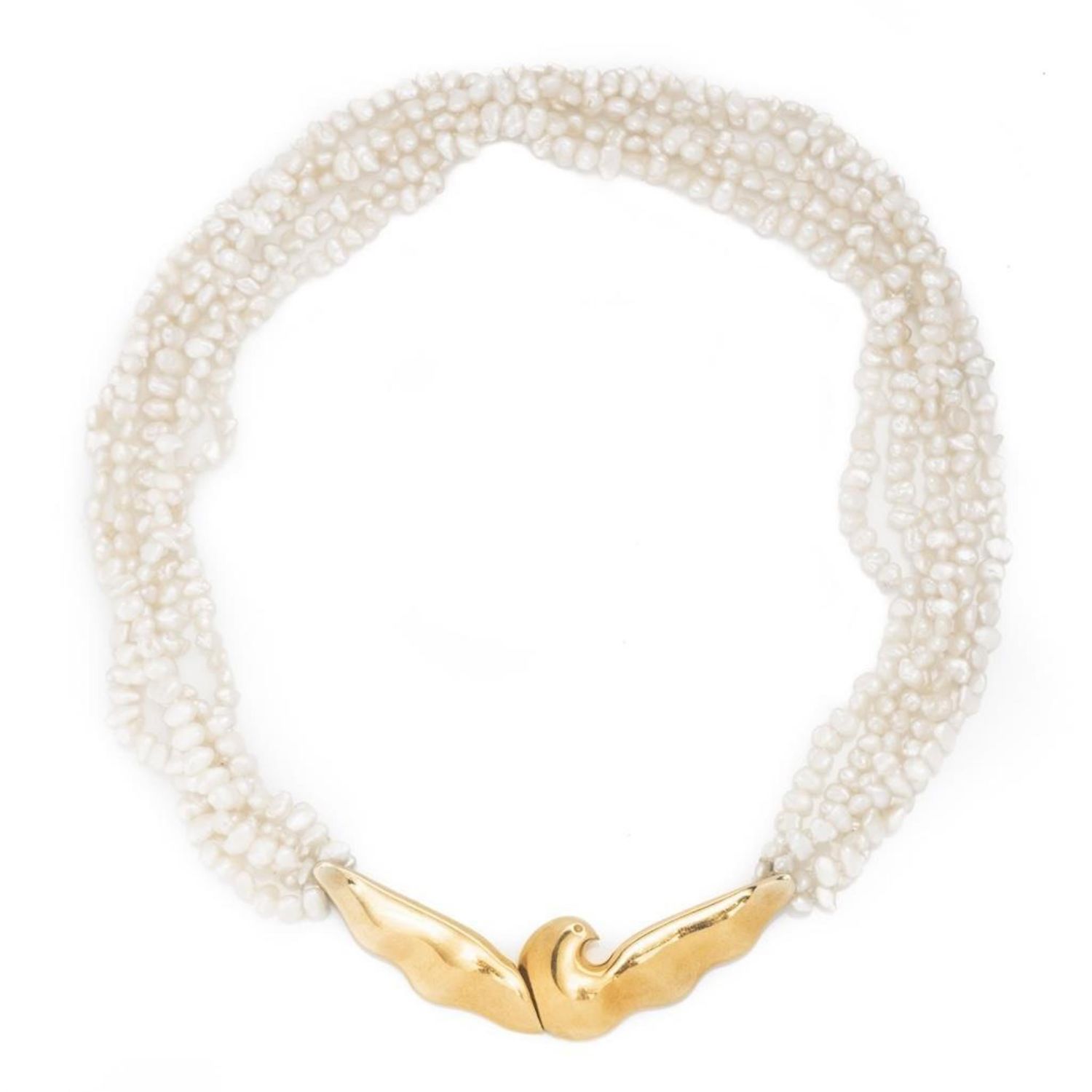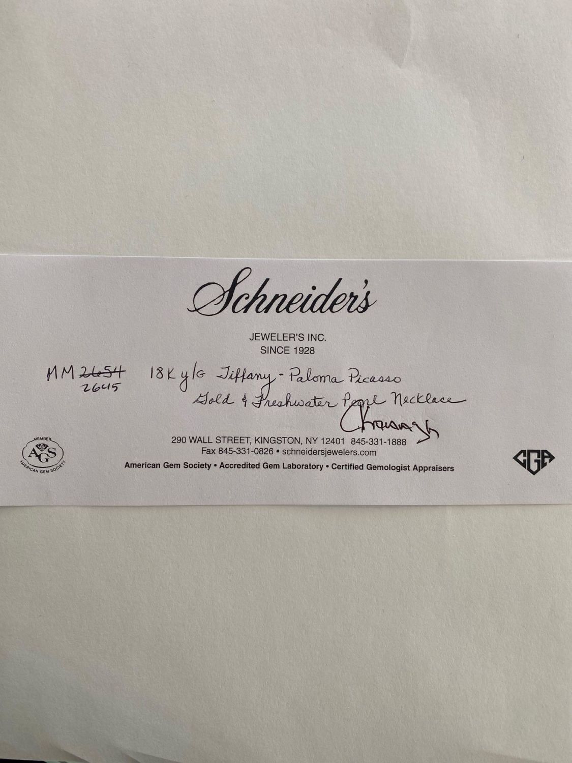 TIFFANY & CO. PALOMA PICASSO CULTURED PEARL NECKLACE. 18K Yellow Gold, Cultured Pearls. Signed Tiffany & Co. Paloma Picasso. Marked 1981 18K. 16" approx. 49.9 Grams Approx