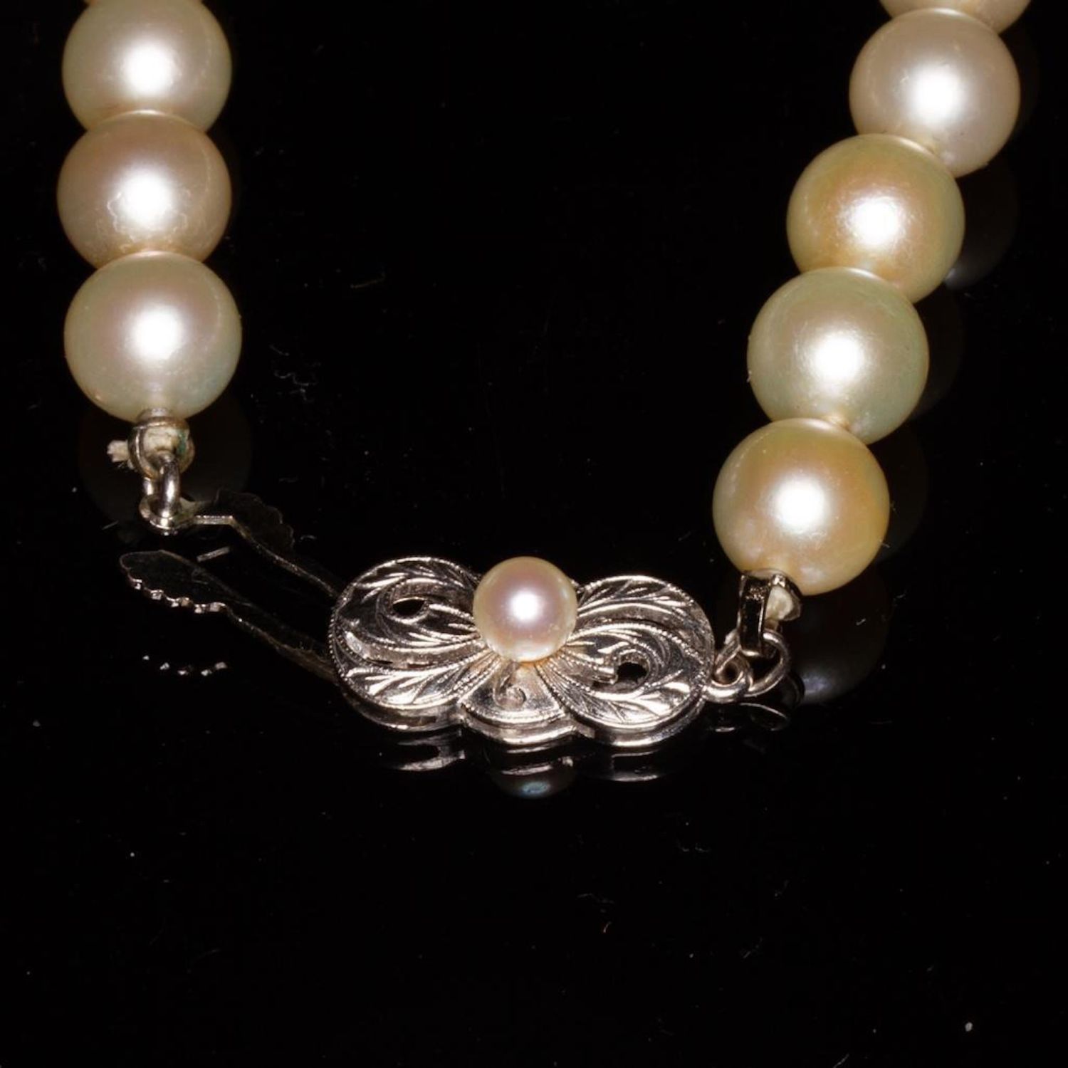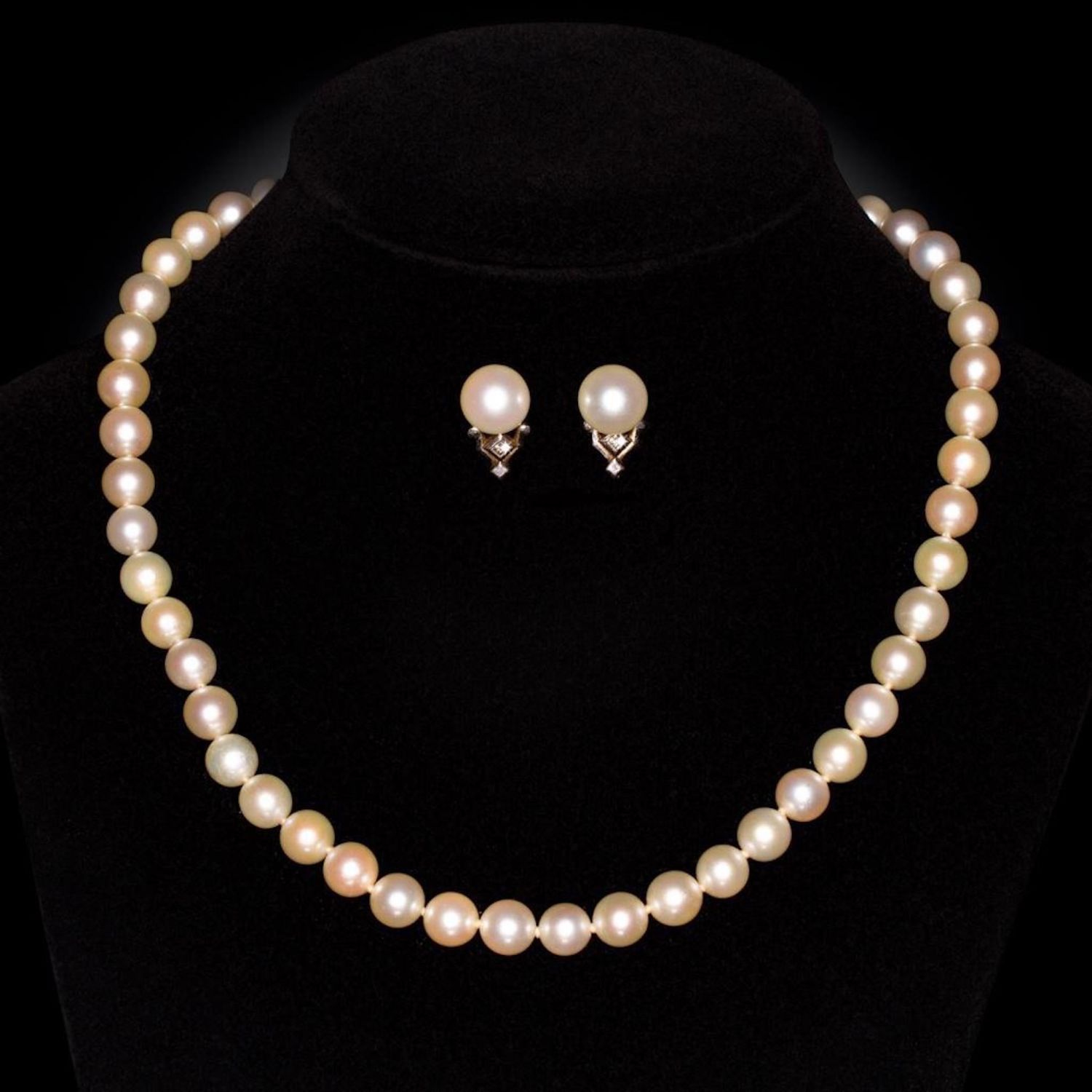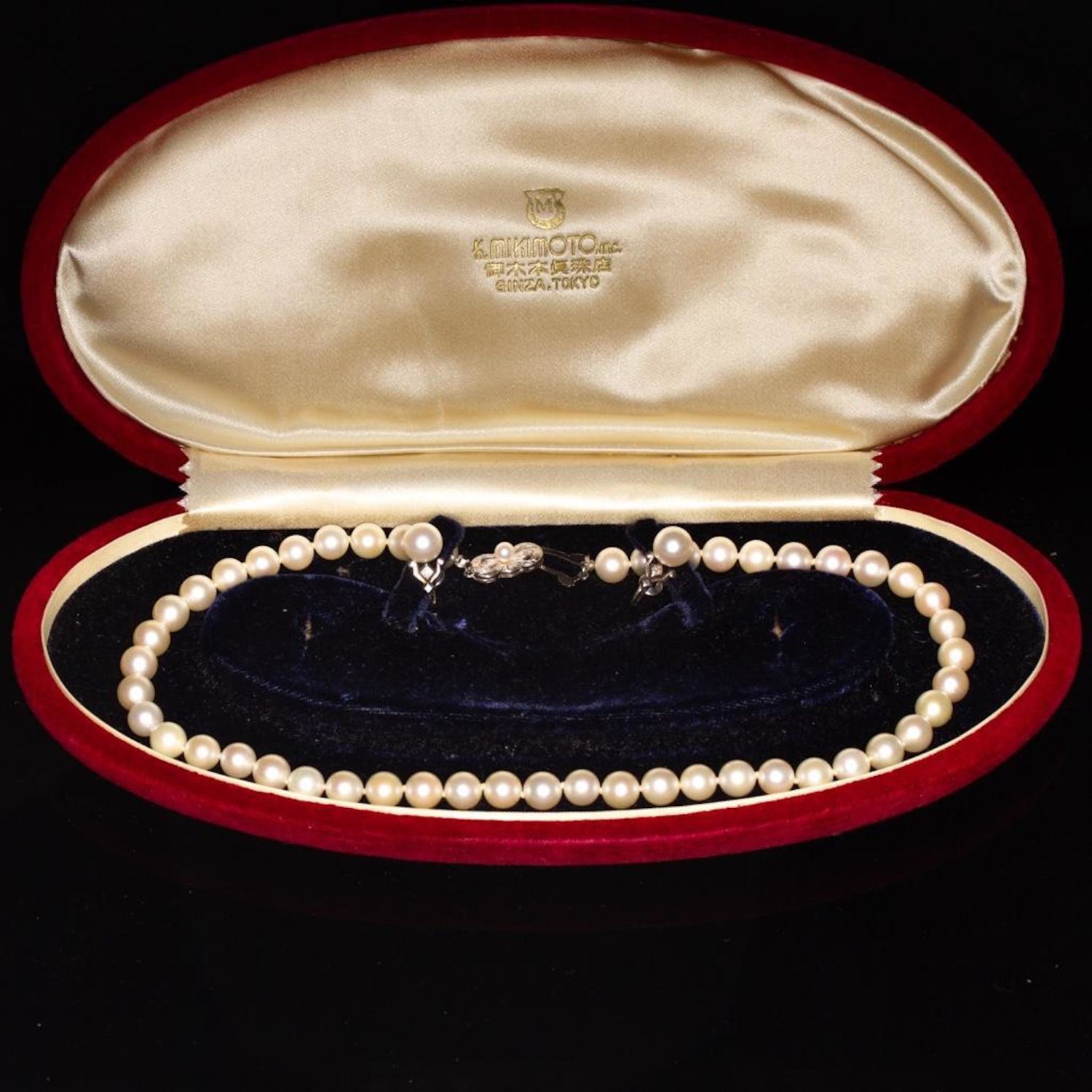Mikimoto necklace and earring set a fine strand of pearls, with mikimoto pearl screw back earrings, necklace with 14 karat white gold clasp signed M and mounted with pearls, earrings set also marked M. Strand length 15 1/2 inches, in Mikimoto oval box. The pearls measure approx 7.4 millimeters…good condition overall