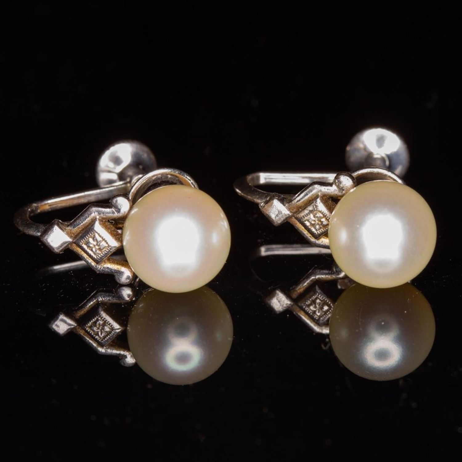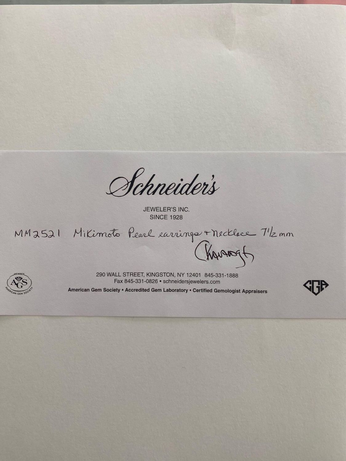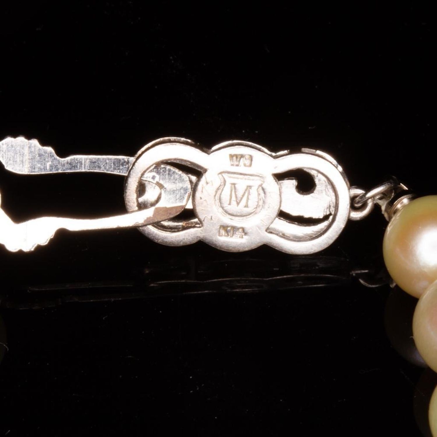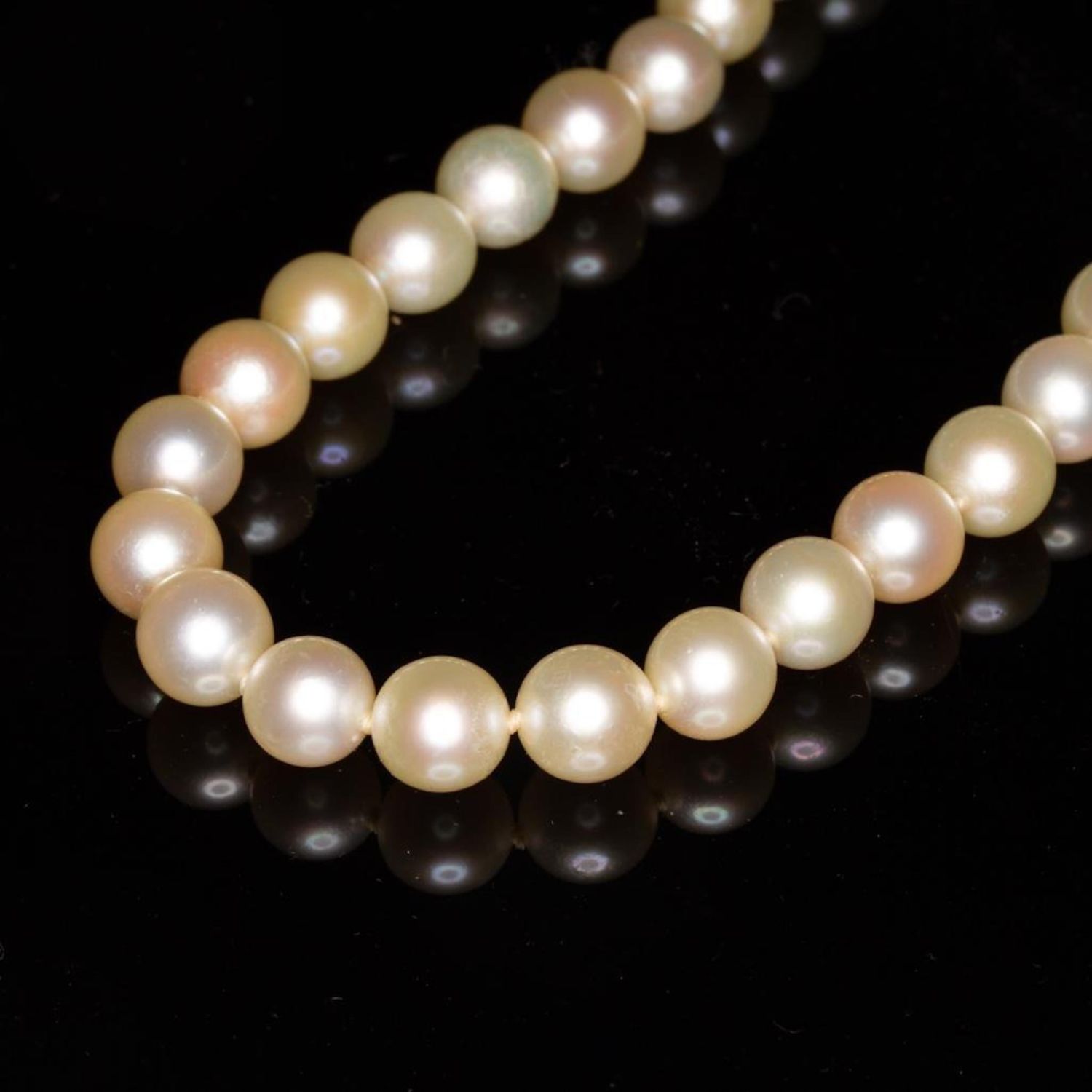 Mikimoto necklace and earring set a fine strand of pearls, with mikimoto pearl screw back earrings, necklace with 14 karat white gold clasp signed M and mounted with pearls, earrings set also marked M. Strand length 15 1/2 inches, in Mikimoto oval box. The pearls measure approx 7.4 millimeters…good condition overall