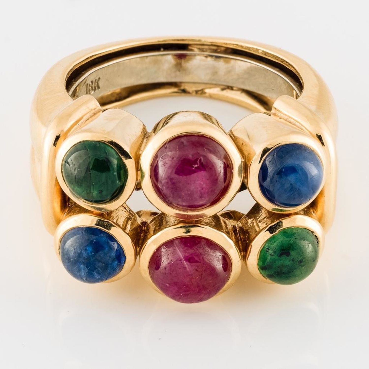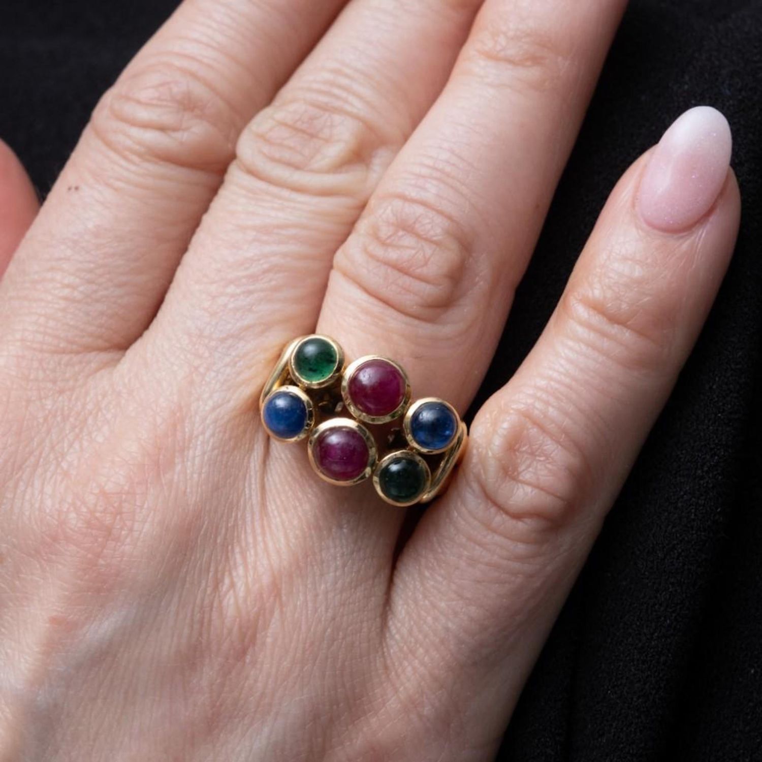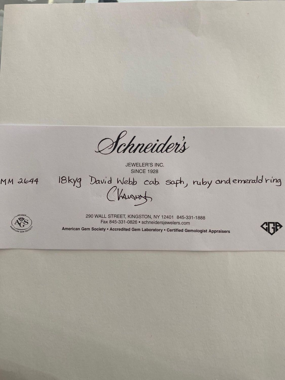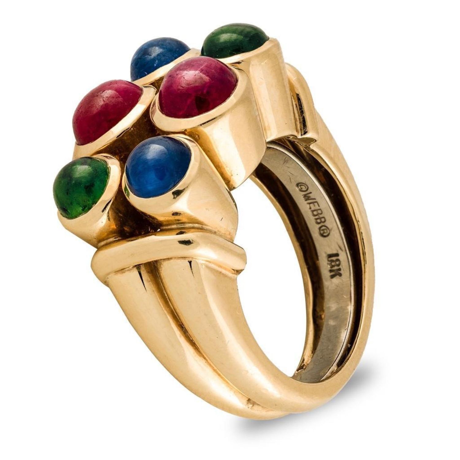 David Webb Ruby, Sapphire and Emerald Ring. 2 Cabochon Rubies, 2 Cabochon Sapphires and 2 Cabochon Emeralds. Signed Web and Marks 18K. Ring Size 7. 15.7grams The ring is authentic, in good condition purchased at Christies