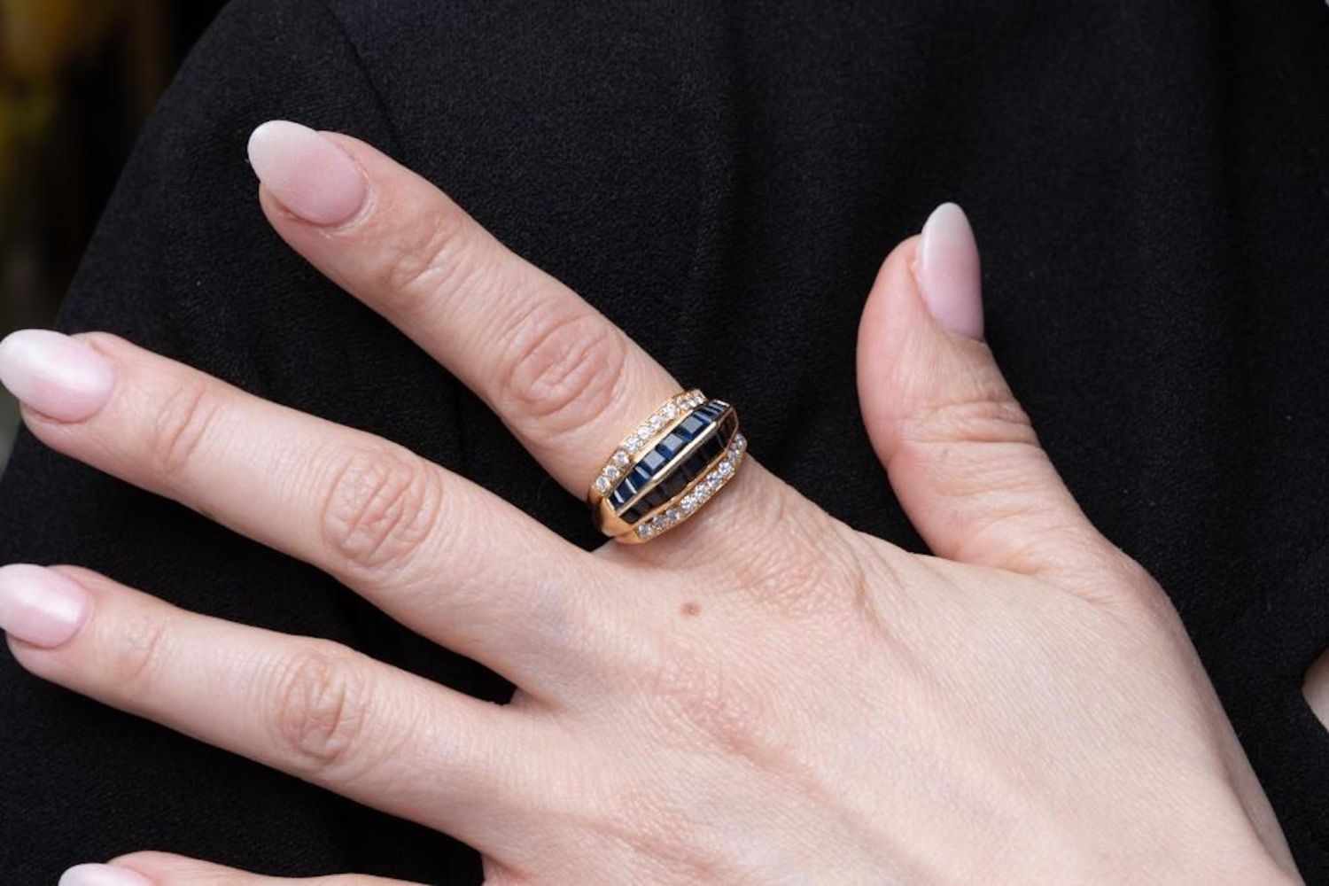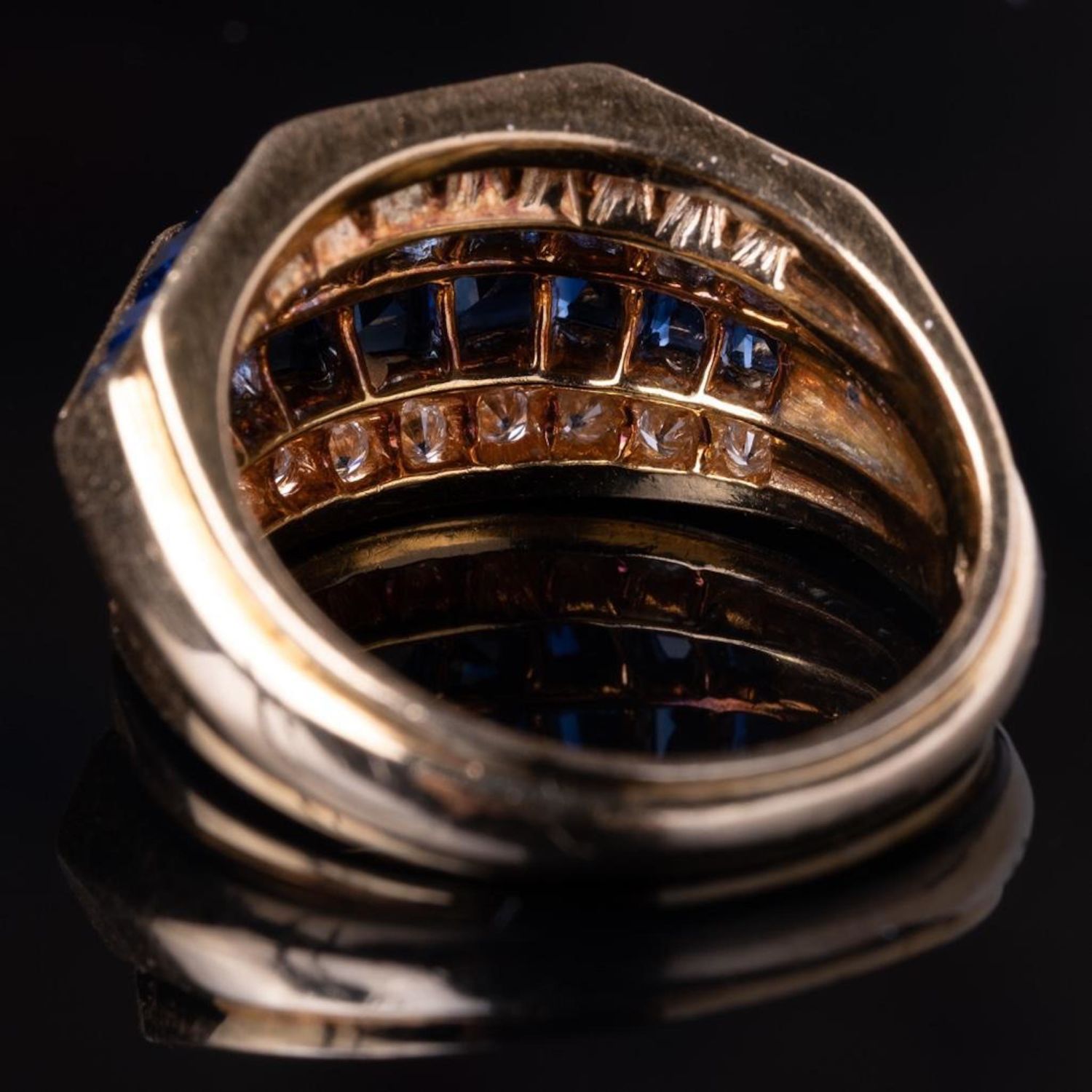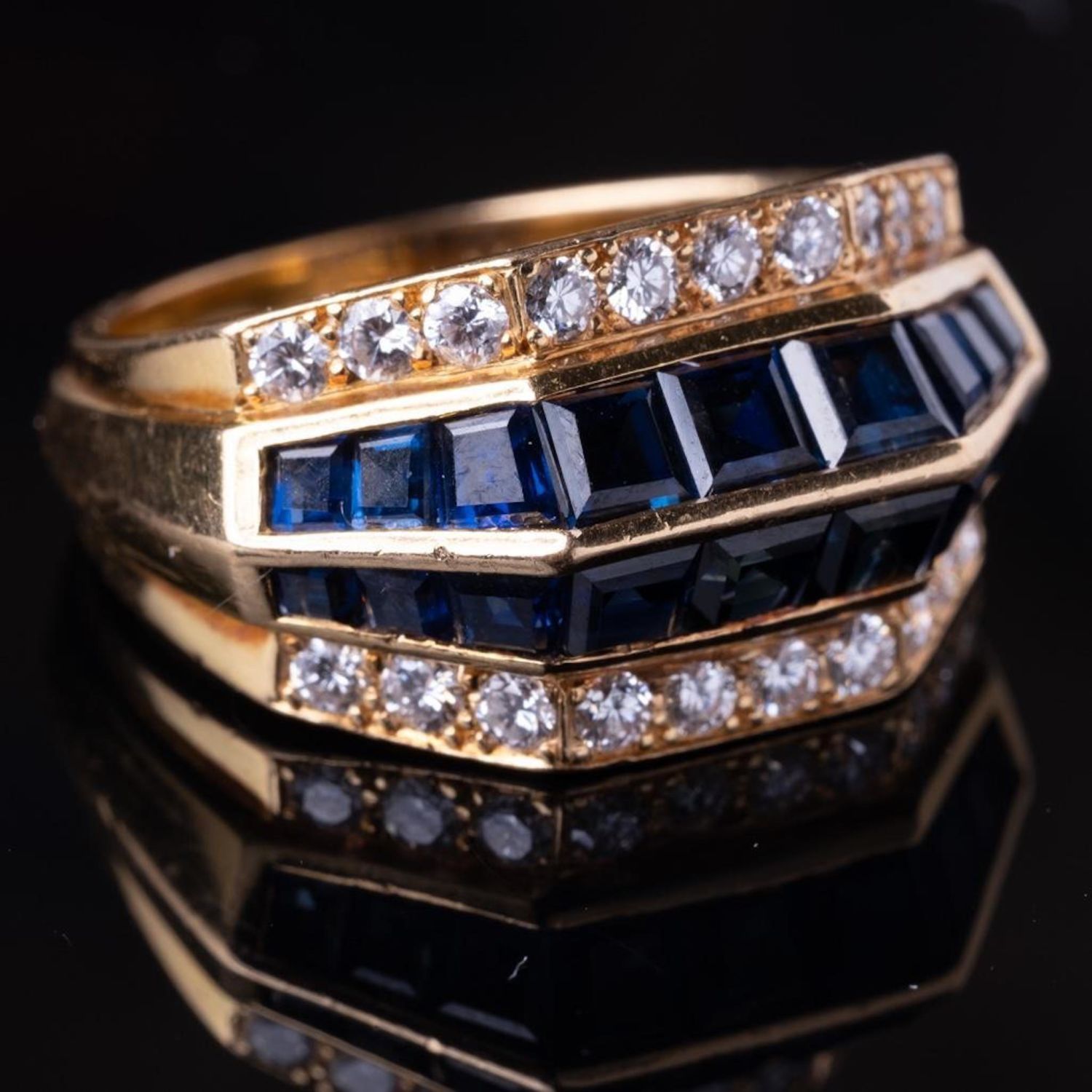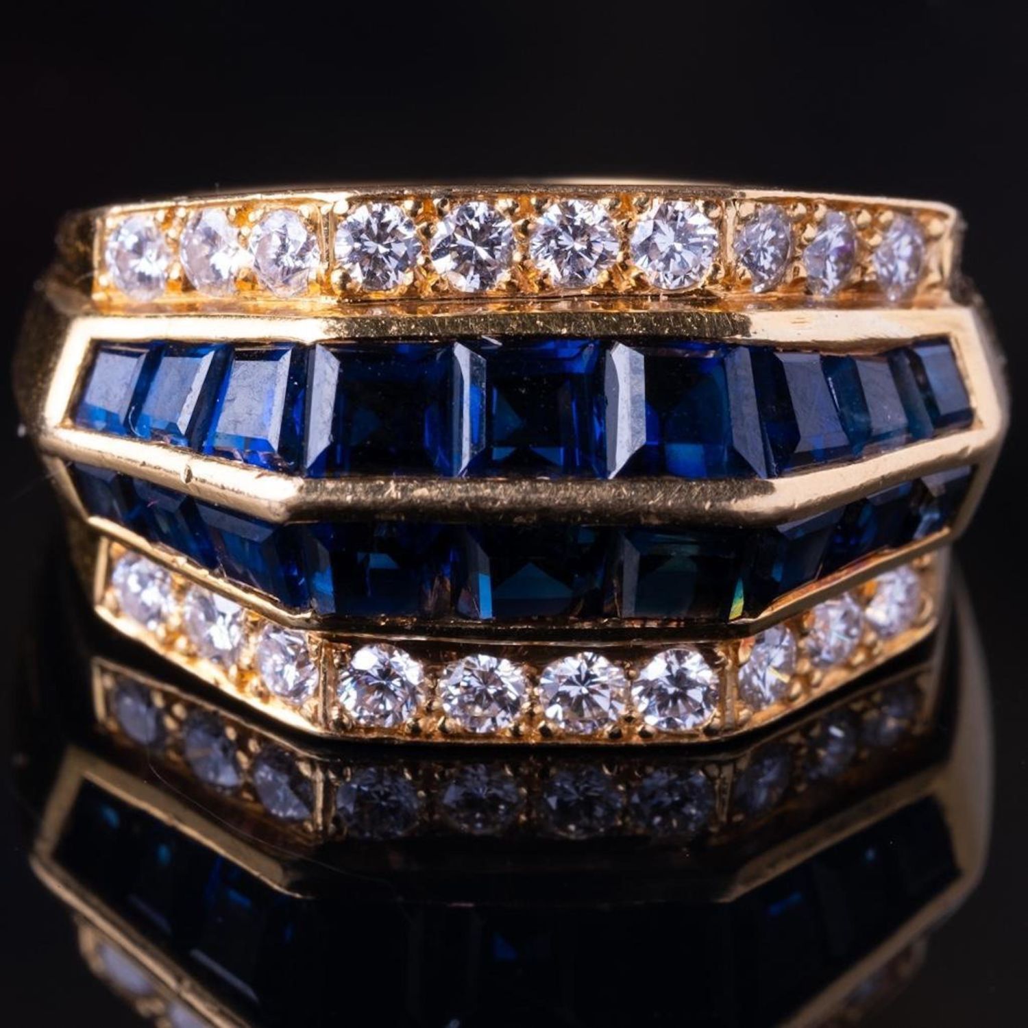Oscar Heyman 1.80ctw Blue Sapphire, 0.75ctw VS1-VS2/F-G Diamond Solid 18K Yellow Gold Ring – This captivating ring was made by Oscar Heyman, and was finely crafted of solid 18k yellow gold. Since the inception of the brand in 1912, the jewelry house has manufactured pieces for names such as Tiffany & Co., Van Cleef & Arpels and Cartier, eventually becoming known in the jewelry industry as "The jewelers’ jeweler". While working for Cartier in 1969, the Heyman brothers designed and crafted the pear shape diamond necklace for the 68 carat Taylor-Burton Diamond. The ring has an aesthetically pleasing, clean and modern design and is embellished with approximately 1.80ctw genuine blue sapphires channel set into two center rows. The ring is then finished with two outer rows adorned with approximately 0.75ctw genuine VS1-VS2/F-G brilliant round cut fiery white diamond accents. The ring is signed with the Oscar Heyman Bros. hallmark along with the unique serial number. Ring size: 7.75 (WEIGHT: 10.4 grams)