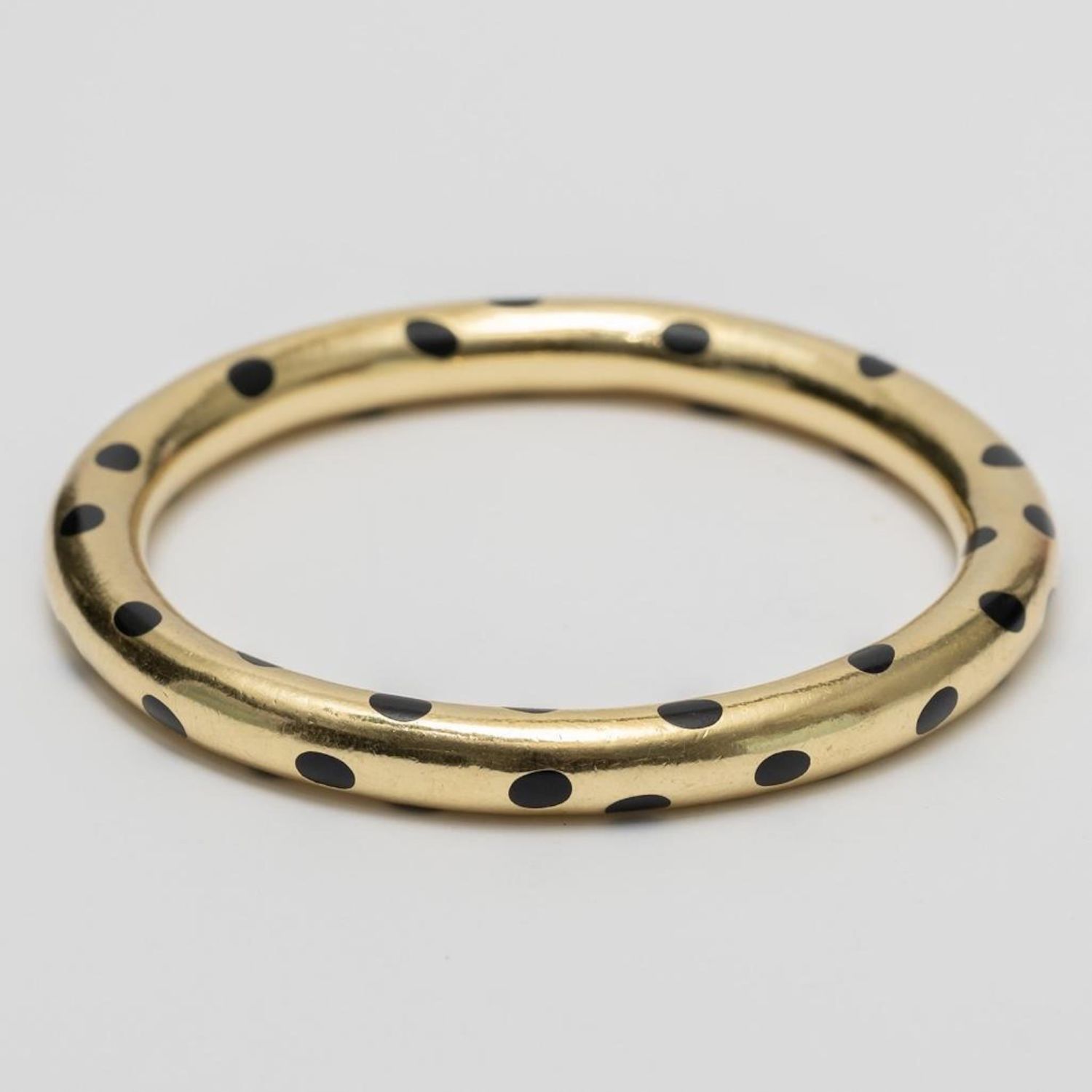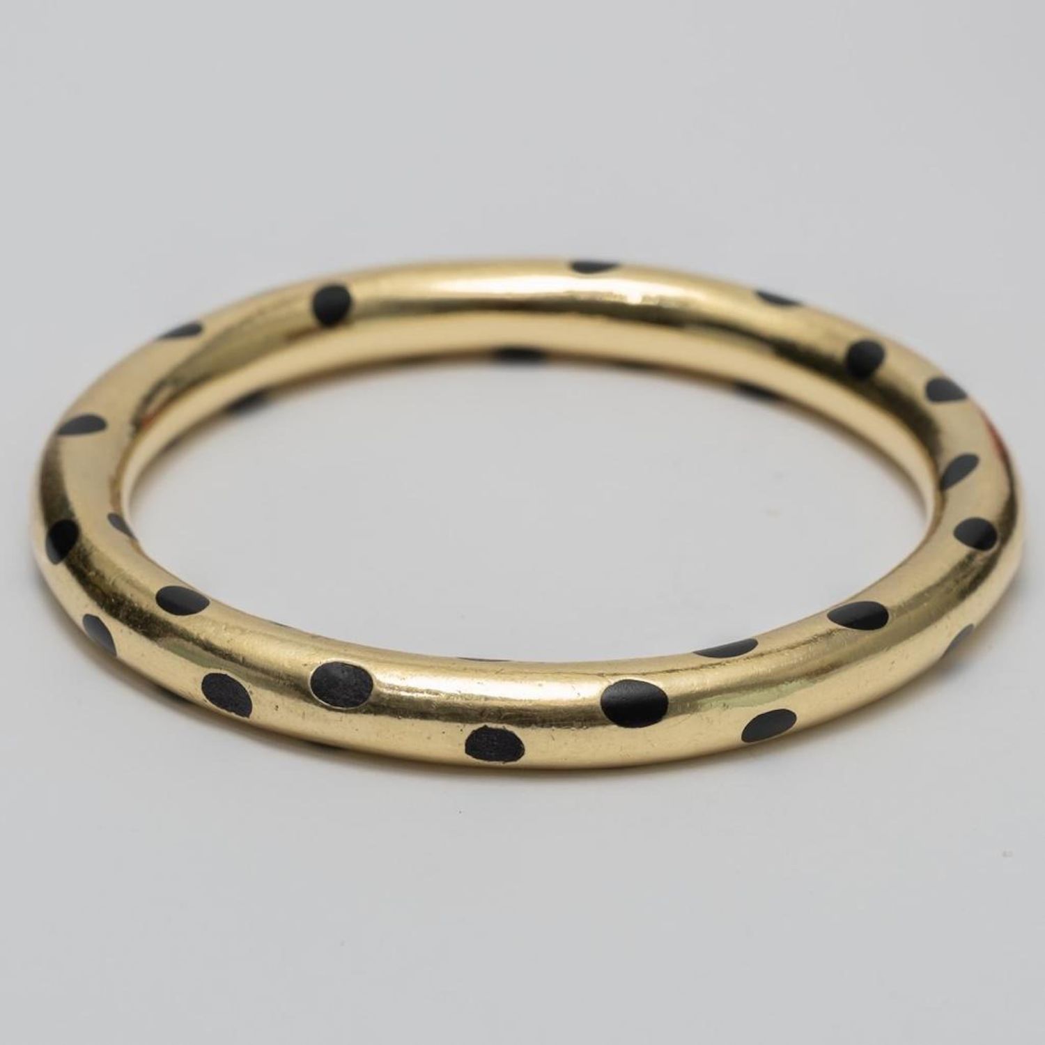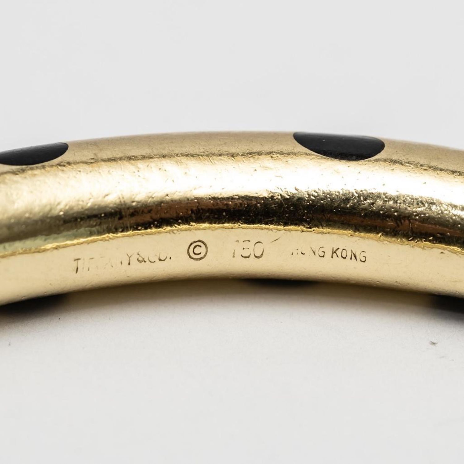 An eye-catching Tiffany & Co Angela Cummings 18k gold and black jade bangle. This bracelet weighs 37.5g. 3" diameter classic vintage Cummings authentic, marked and in good condition