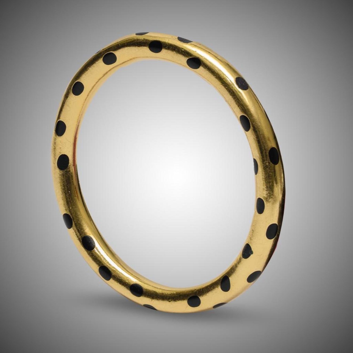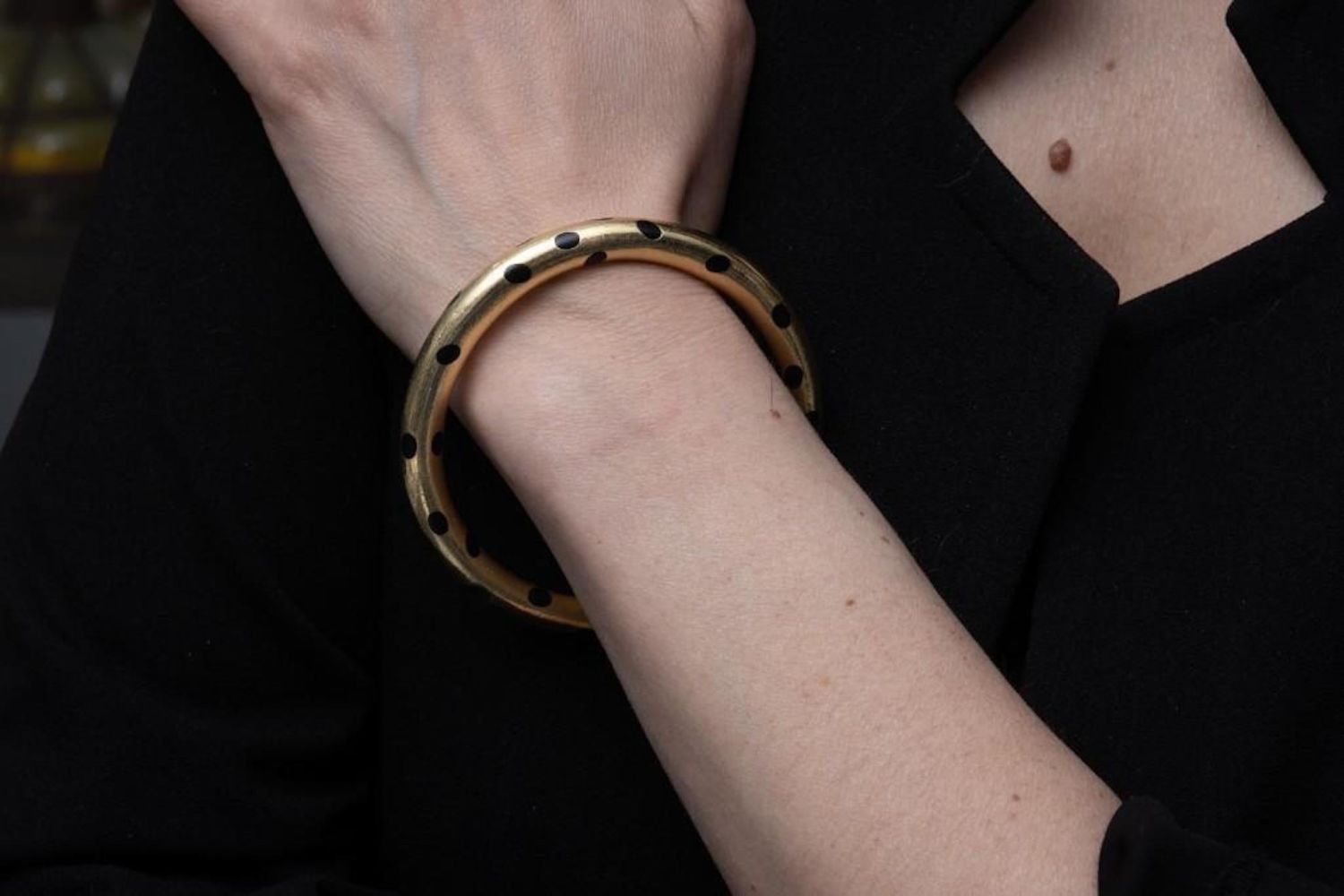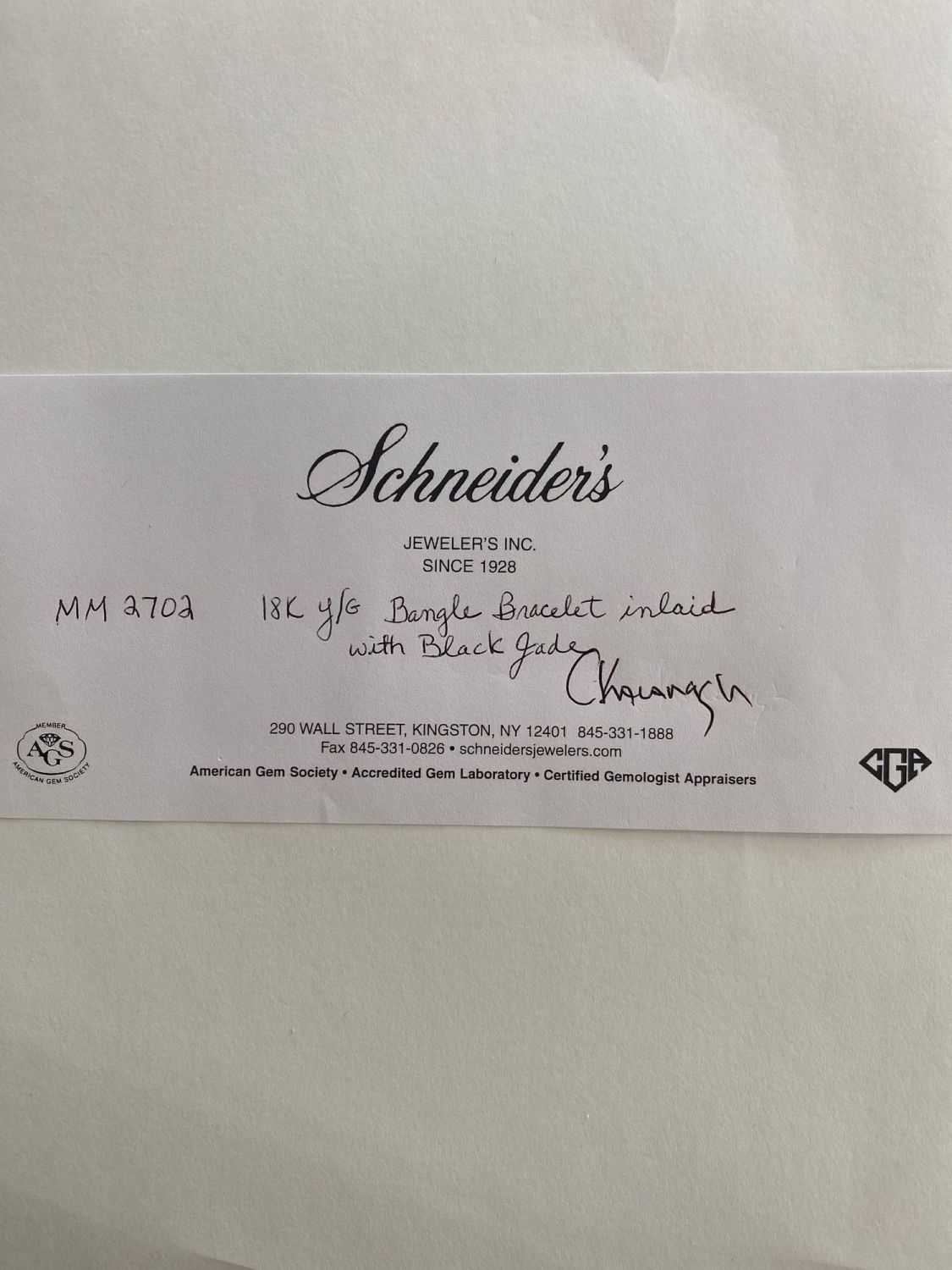An eye-catching Tiffany & Co Angela Cummings 18k gold and black jade bangle. This bracelet weighs 37.5g. 3" diameter classic vintage Cummings authentic, marked and in good condition