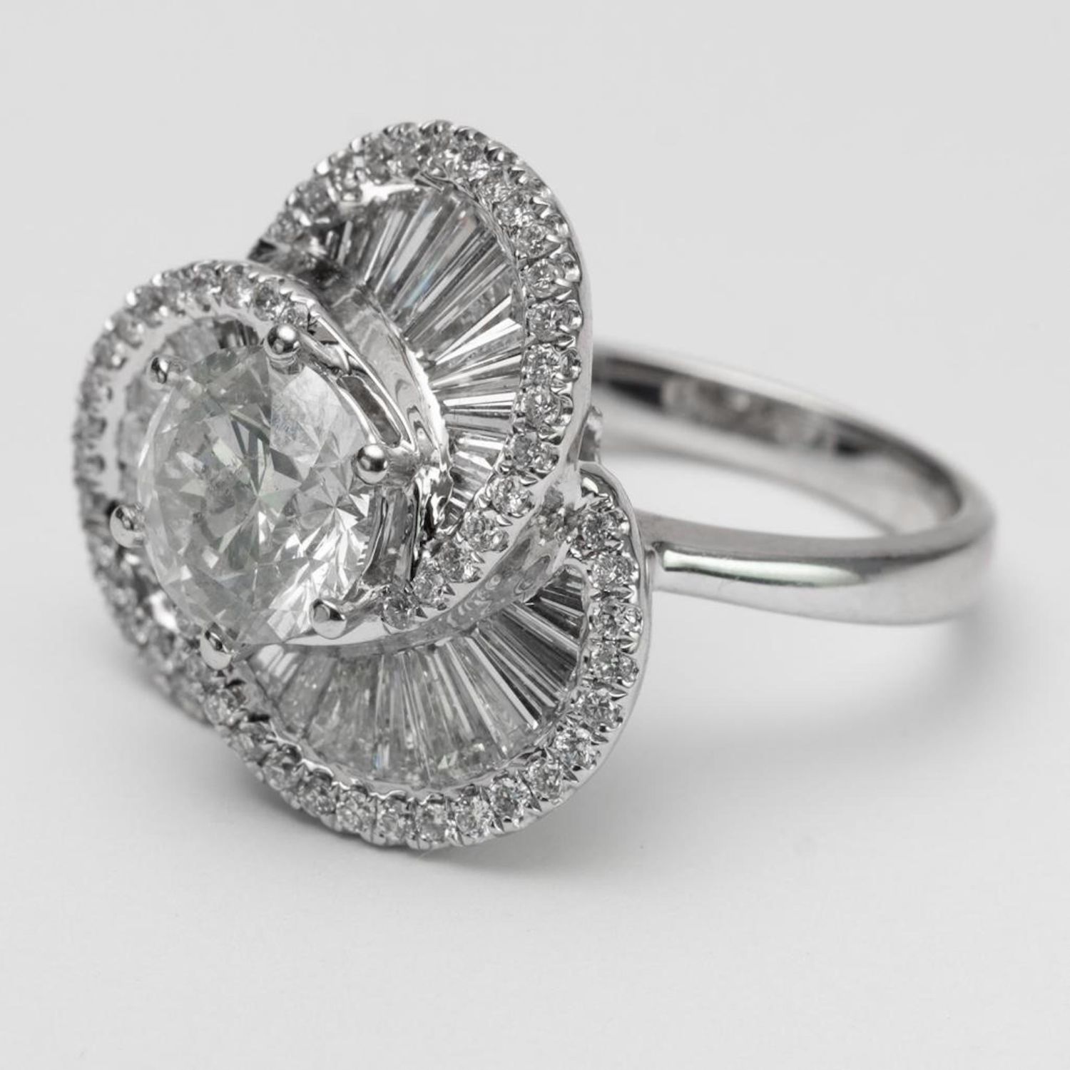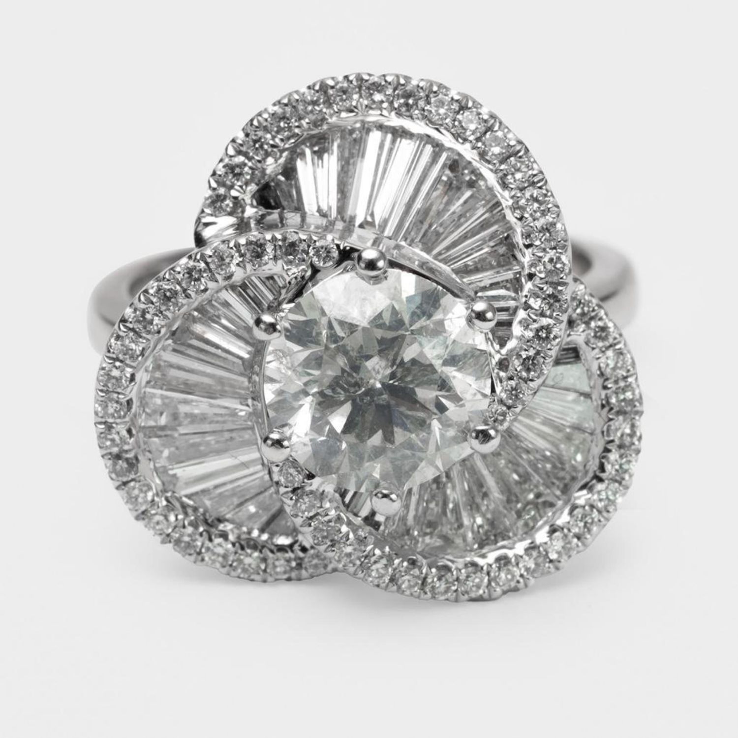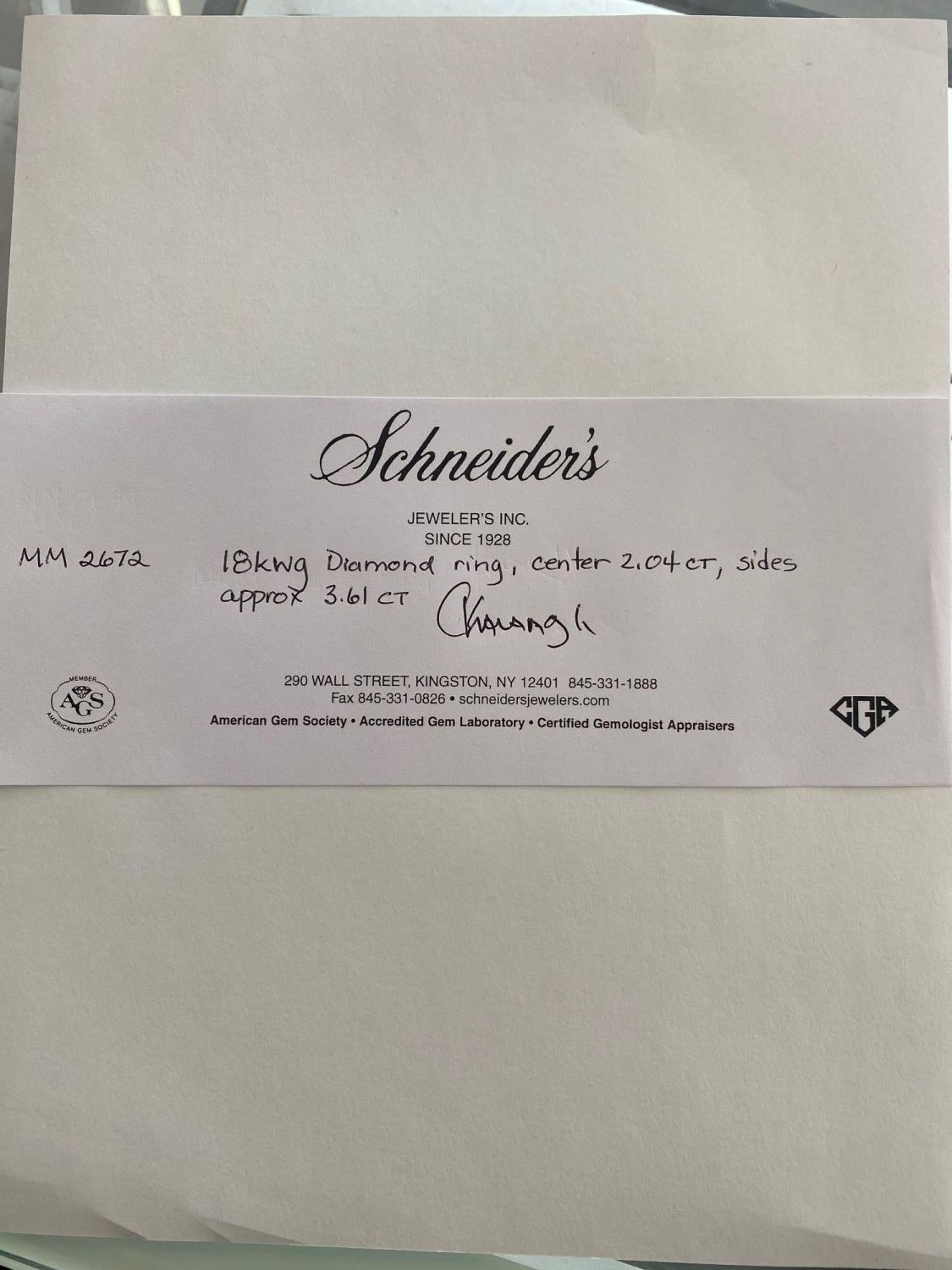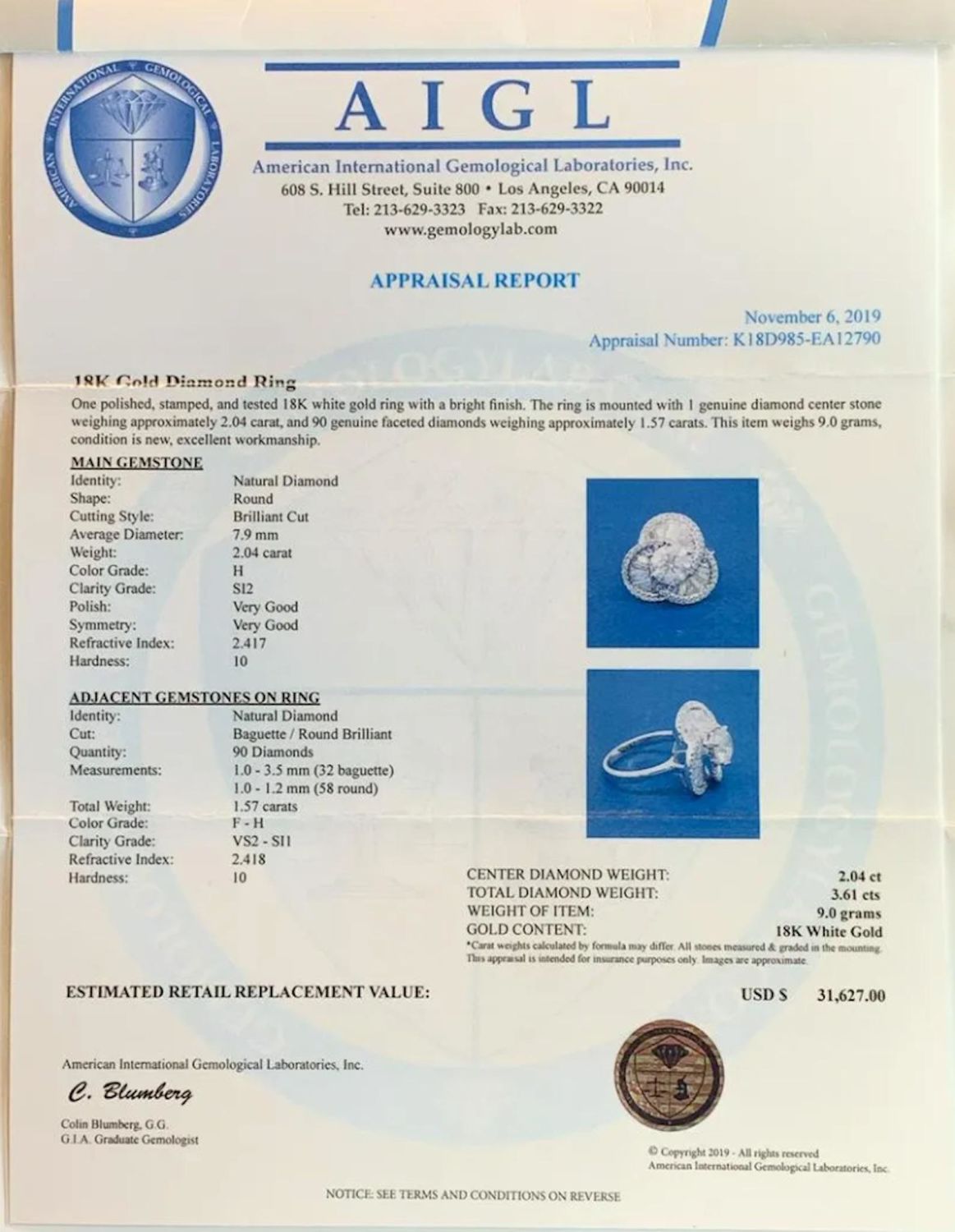 Exceptional 18K gold diamond ring.. The ring is mounted with 1 high quality center diamond stone weighing approximately 2.04 carat, color H and SI1 clarity and 90 genuine faceted diamonds weighing approximately 1.57 carats. This item weighs 9.0 grams, condition is new, excellent workmanship. Estimated Retail – $31,627.00. Size 6.5. Great Ring from a good collection in good condition…See appraisal letter