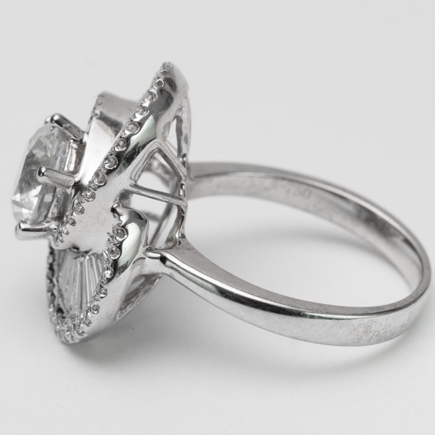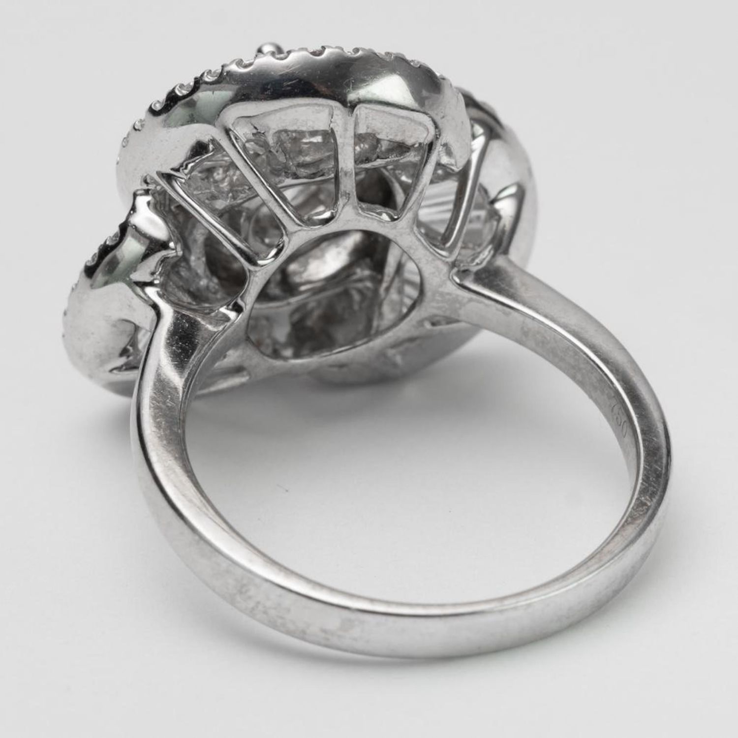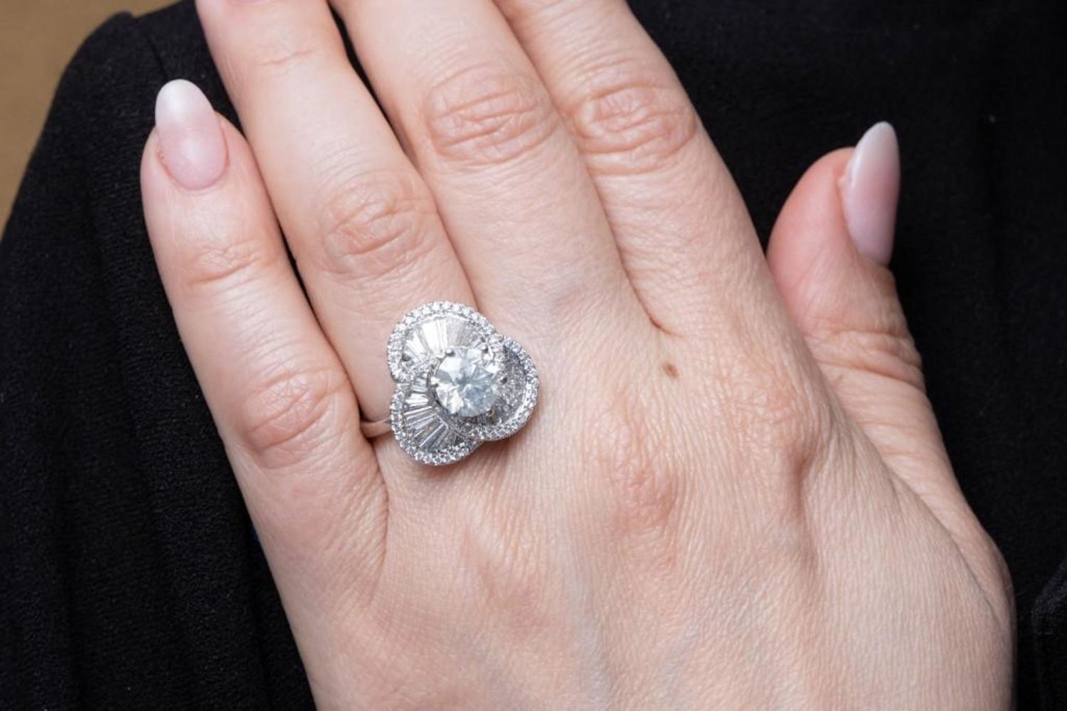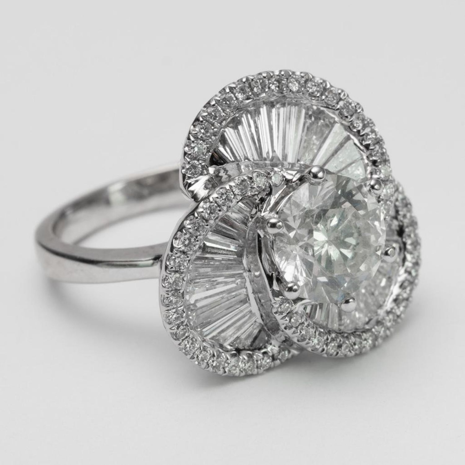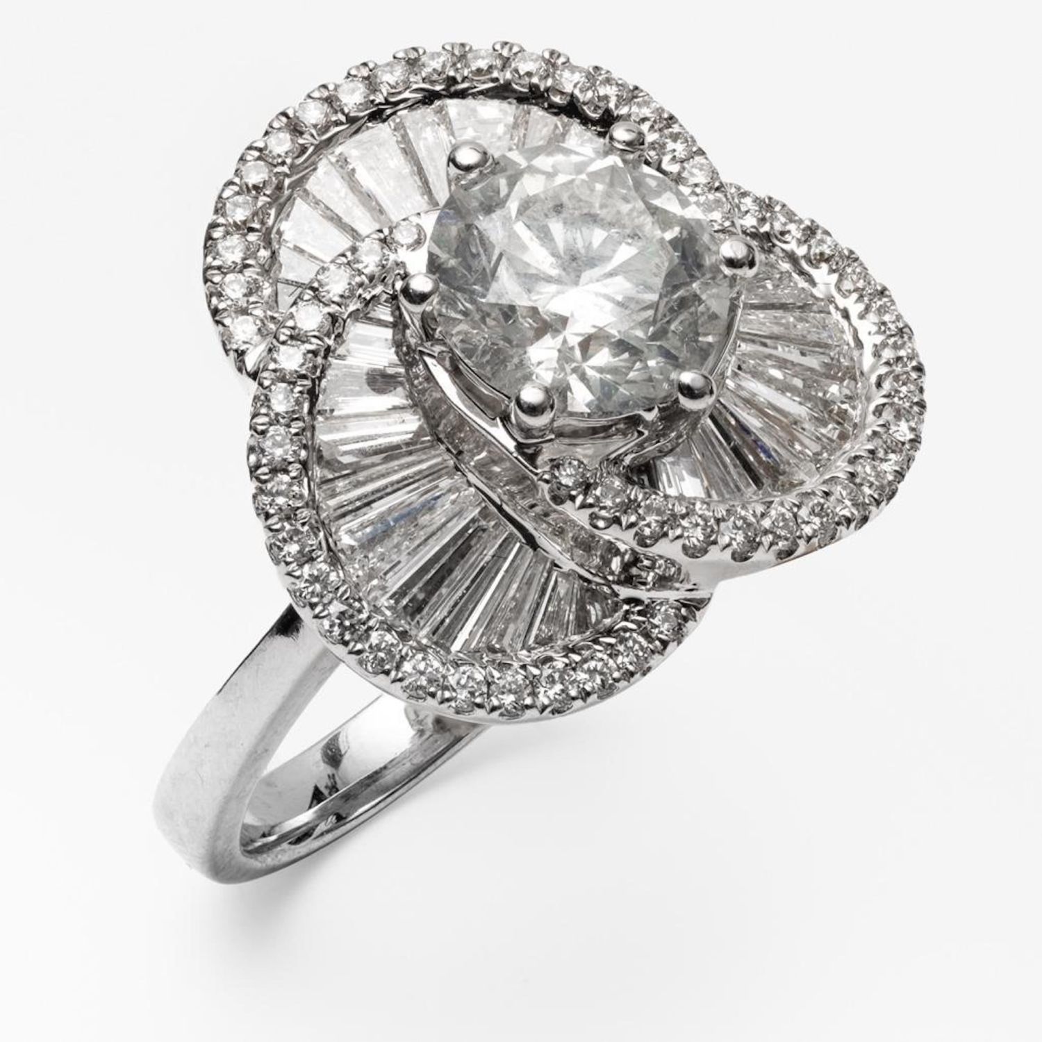 Exceptional 18K gold diamond ring.. The ring is mounted with 1 high quality center diamond stone weighing approximately 2.04 carat, color H and SI1 clarity and 90 genuine faceted diamonds weighing approximately 1.57 carats. This item weighs 9.0 grams, condition is new, excellent workmanship. Estimated Retail – $31,627.00. Size 6.5. Great Ring from a good collection in good condition…See appraisal letter