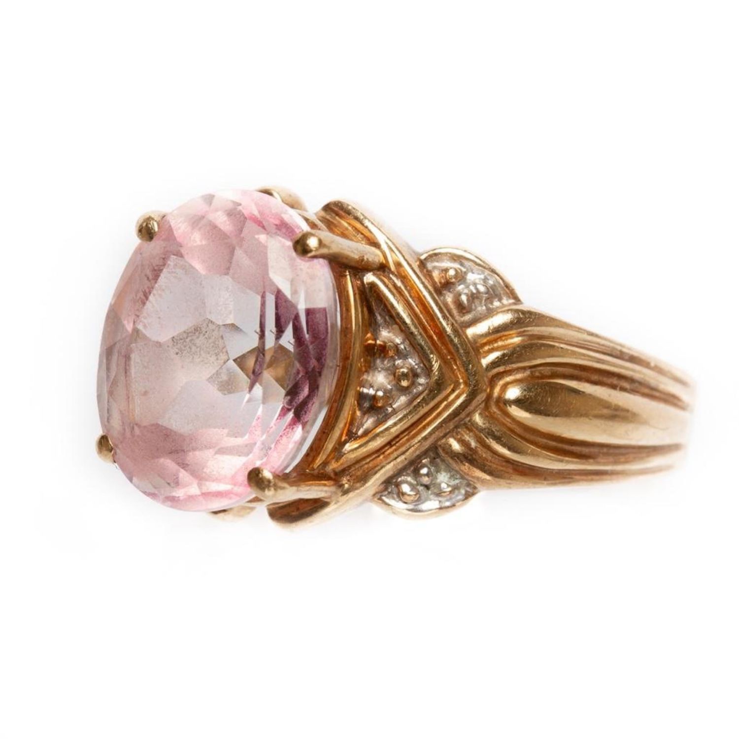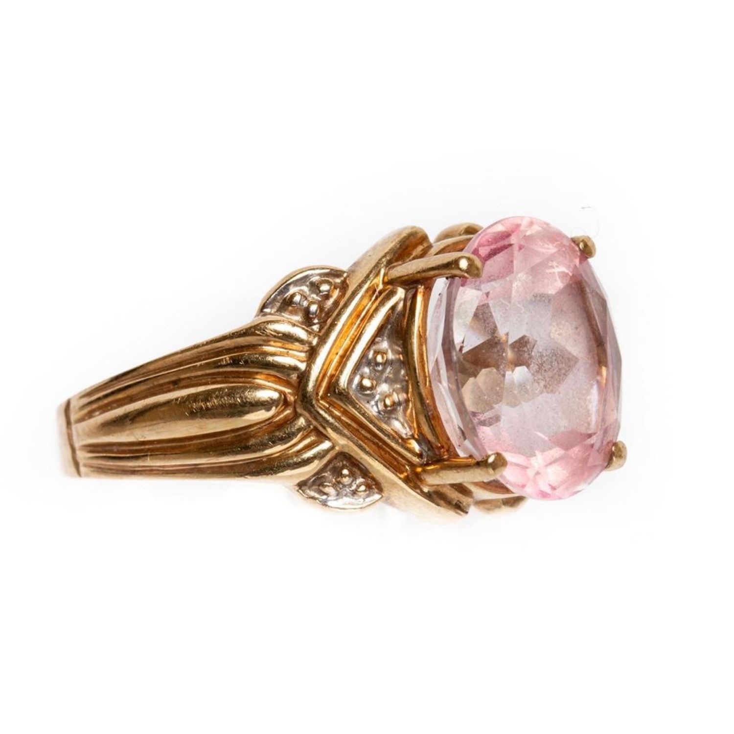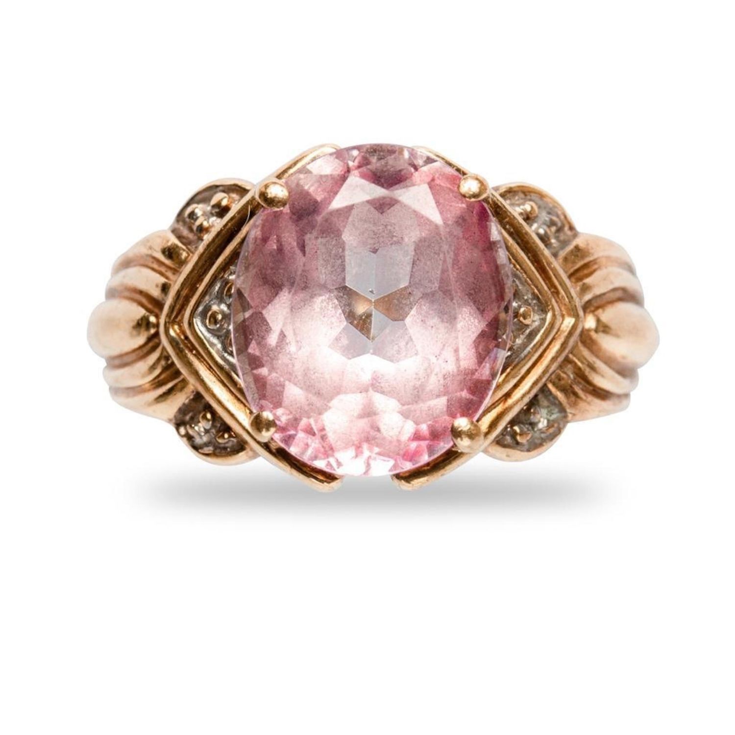 Gold old ring with faceted pink topaz. The ring has an Art Nouveau style with two-tone fluted shoulders and shank. yellow and white gold. Ring Size 8.25. Hallmarks: R 10K. Total Weigh 3.20dwt. 1 Stone, Oval faceted and measures 12.00mm x 10.00mm. Minor marking throughout. good condition