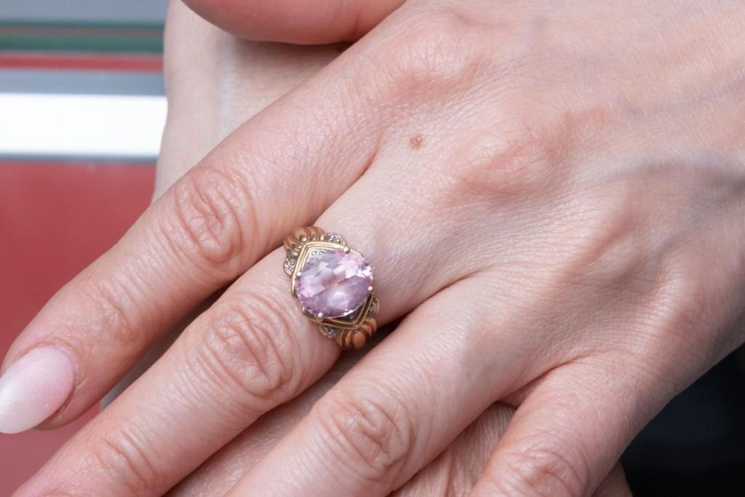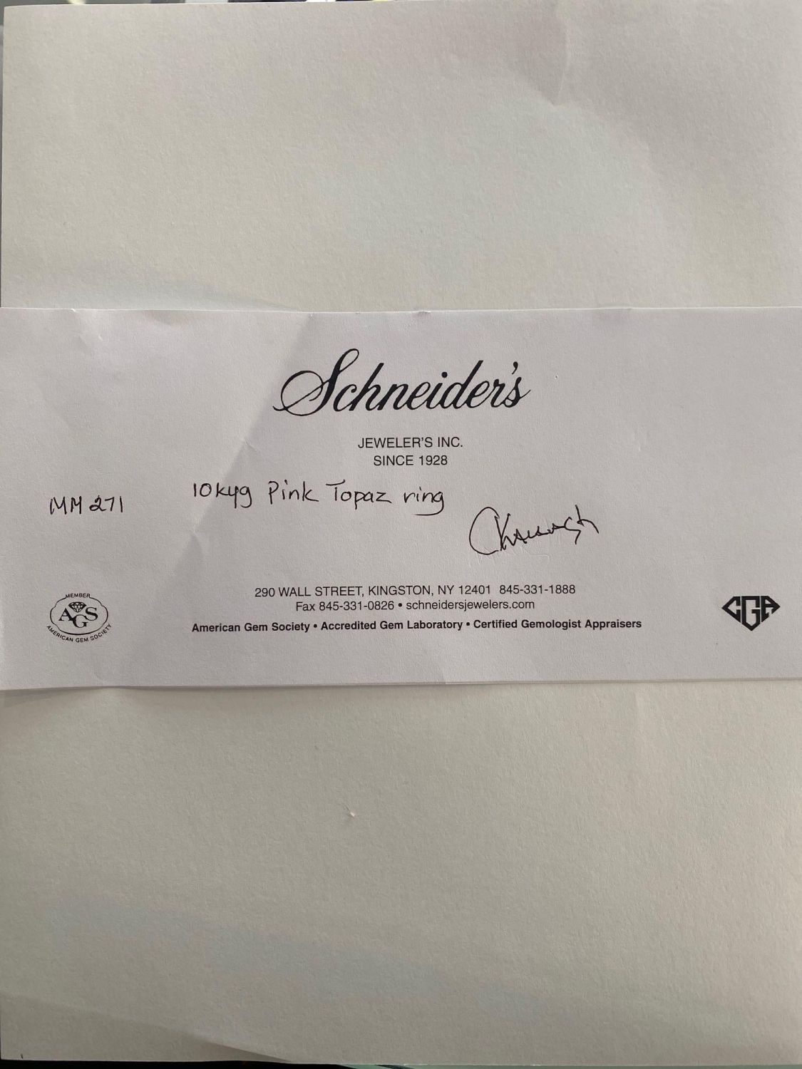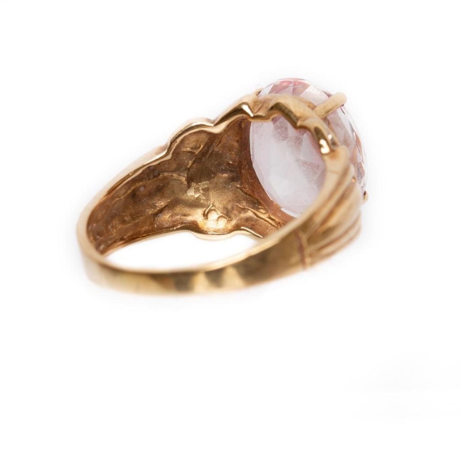 Gold old ring with faceted pink topaz. The ring has an Art Nouveau style with two-tone fluted shoulders and shank. yellow and white gold. Ring Size 8.25. Hallmarks: R 10K. Total Weigh 3.20dwt. 1 Stone, Oval faceted and measures 12.00mm x 10.00mm. Minor marking throughout. good condition