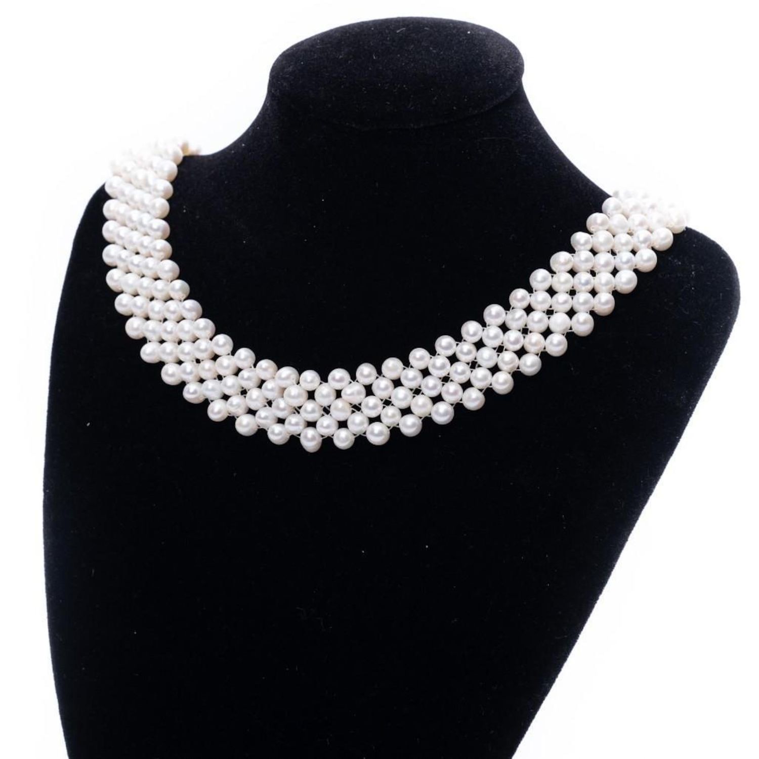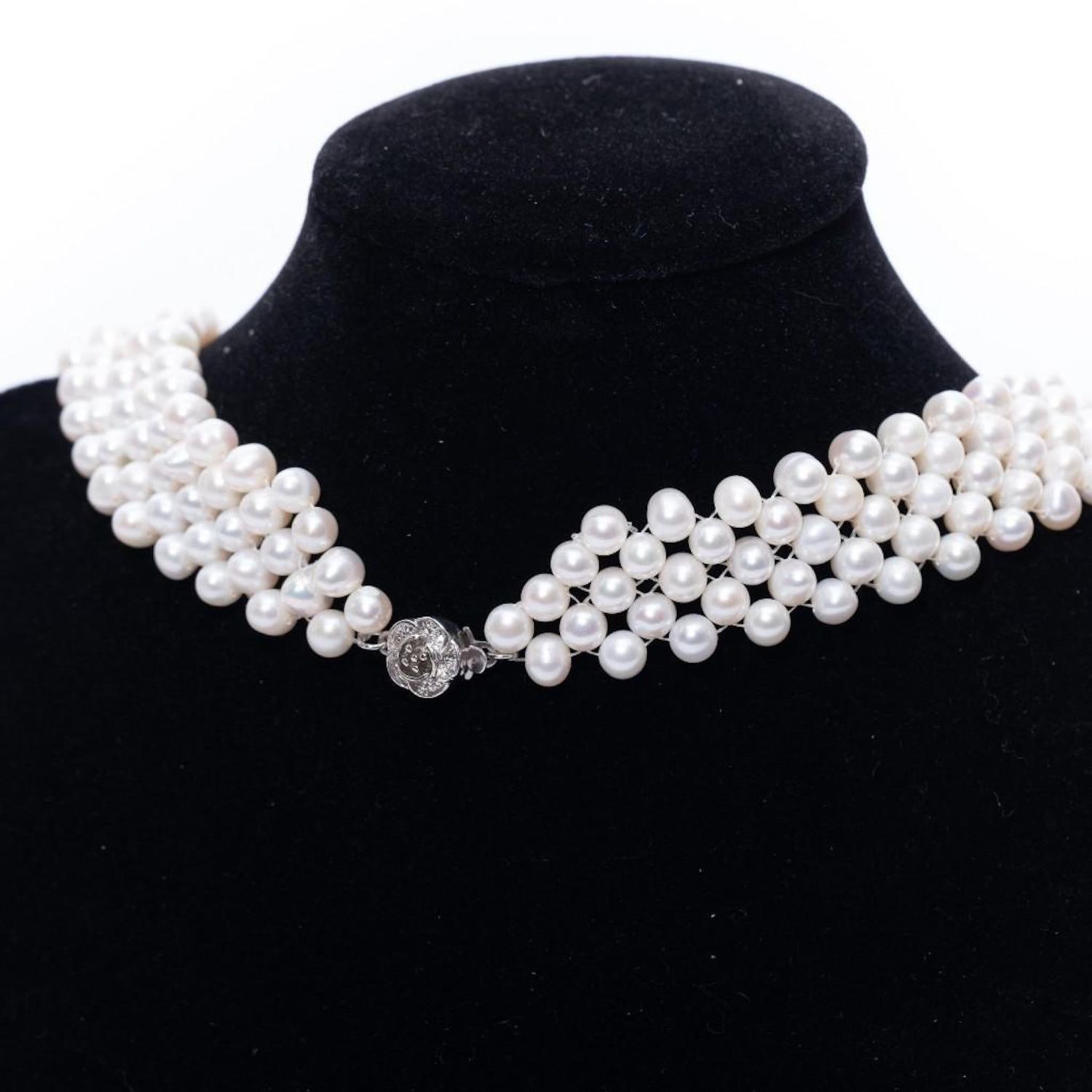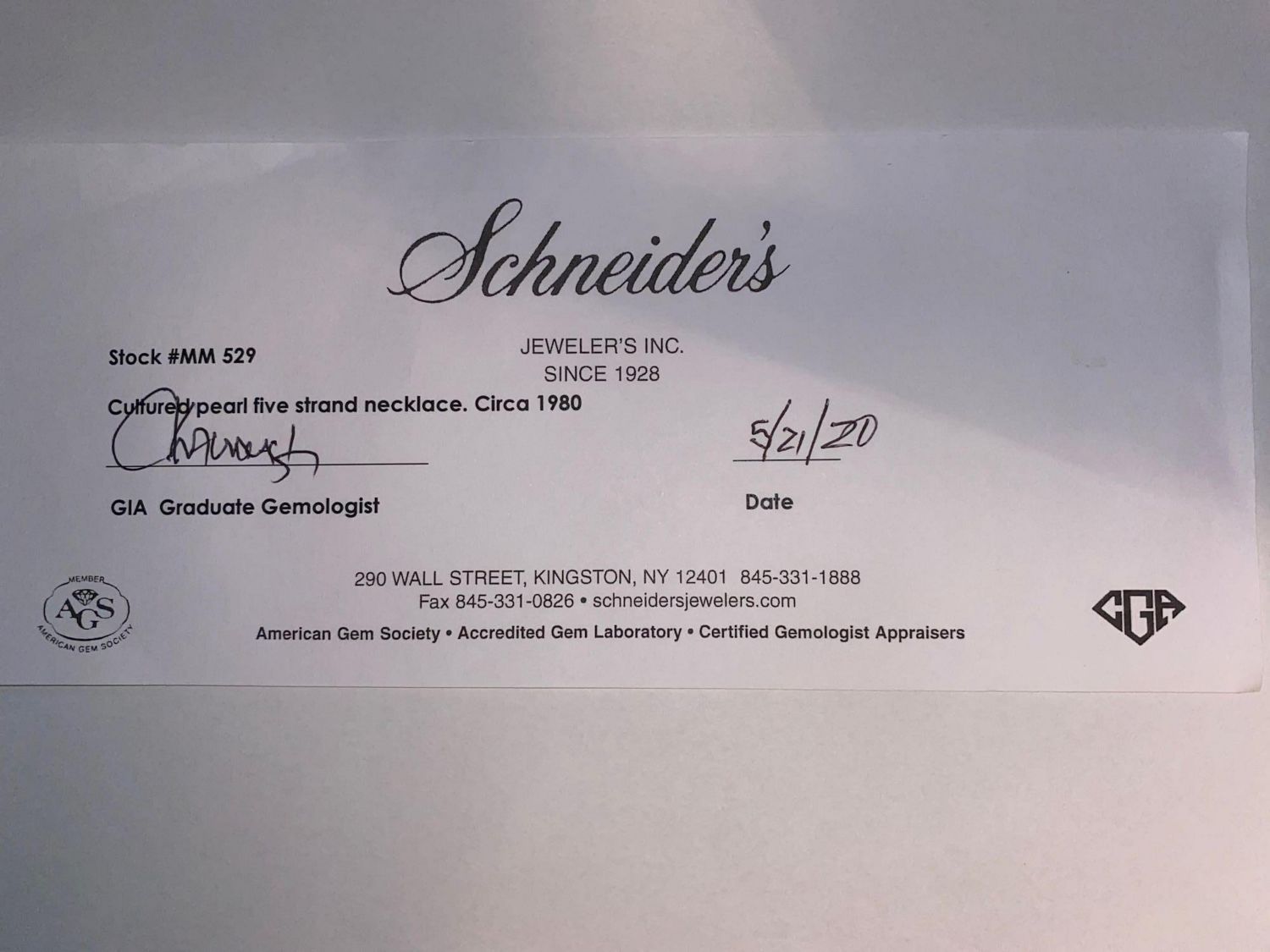 vintage mid century 5 strand pearl necklace with sterling clasp pearls 5-6.5mm approx 2oz 16" approx. This lot is accompanied by a GIA appraiser letter from an independent and well respected firm established over 75 years ago.