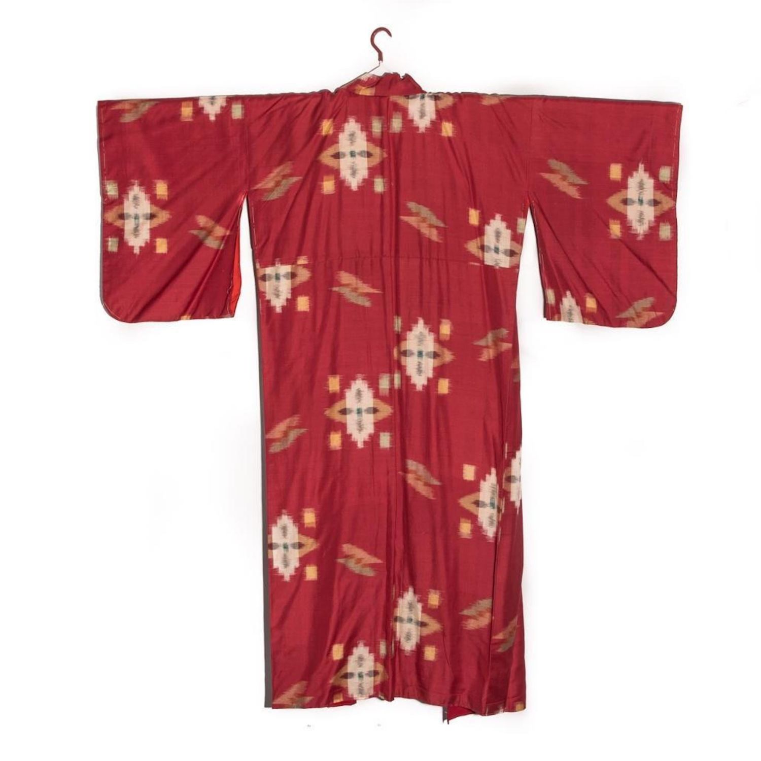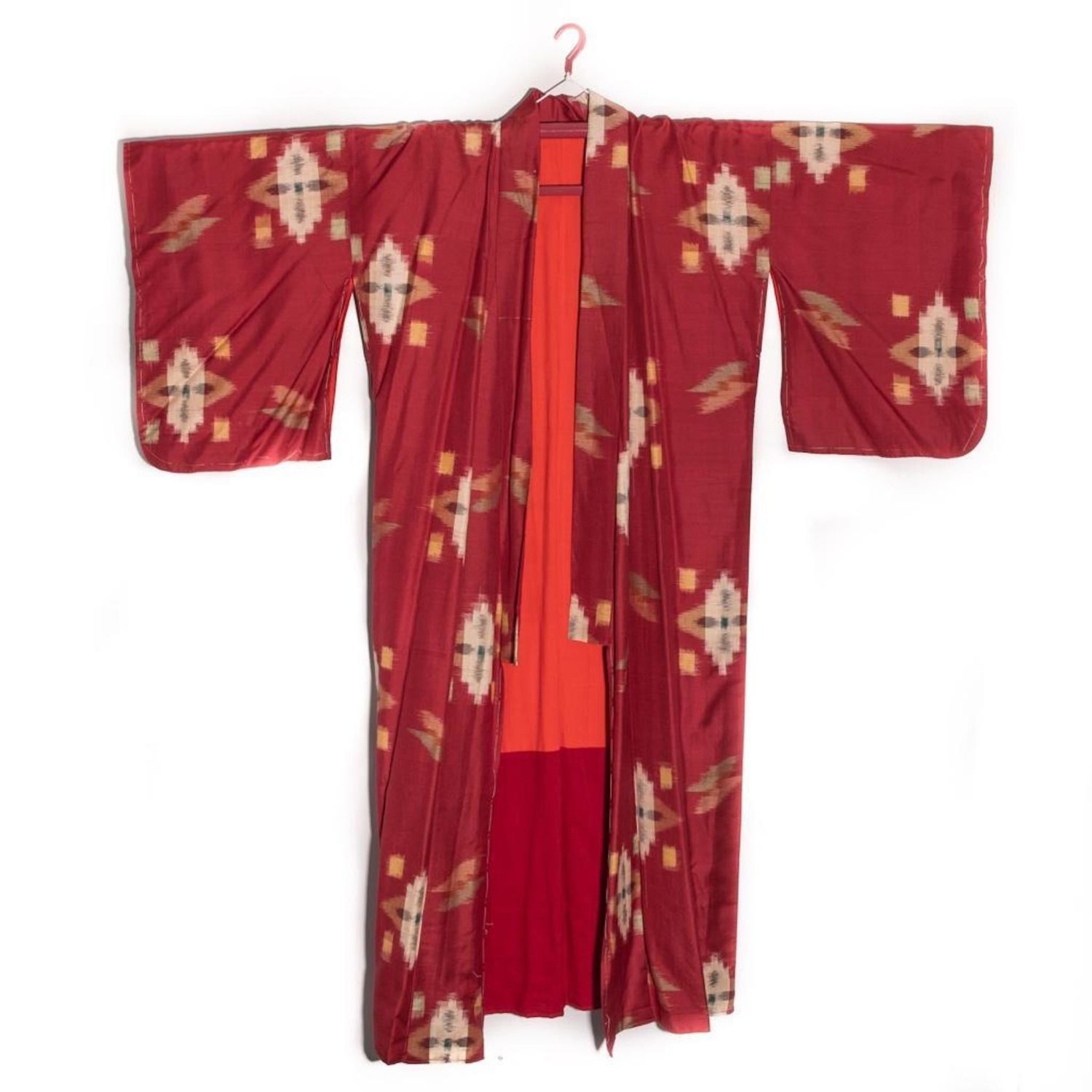 japanese meiji 1900 antique ikat handwoven silk kosode kimono. In good condition This brick read kimono features geometric and floral motifs rendered in a color palette of yellow, white, black and taupe. It is lined in tomato red and brick red silk. good condition 49" sleeve span, 58" overall length