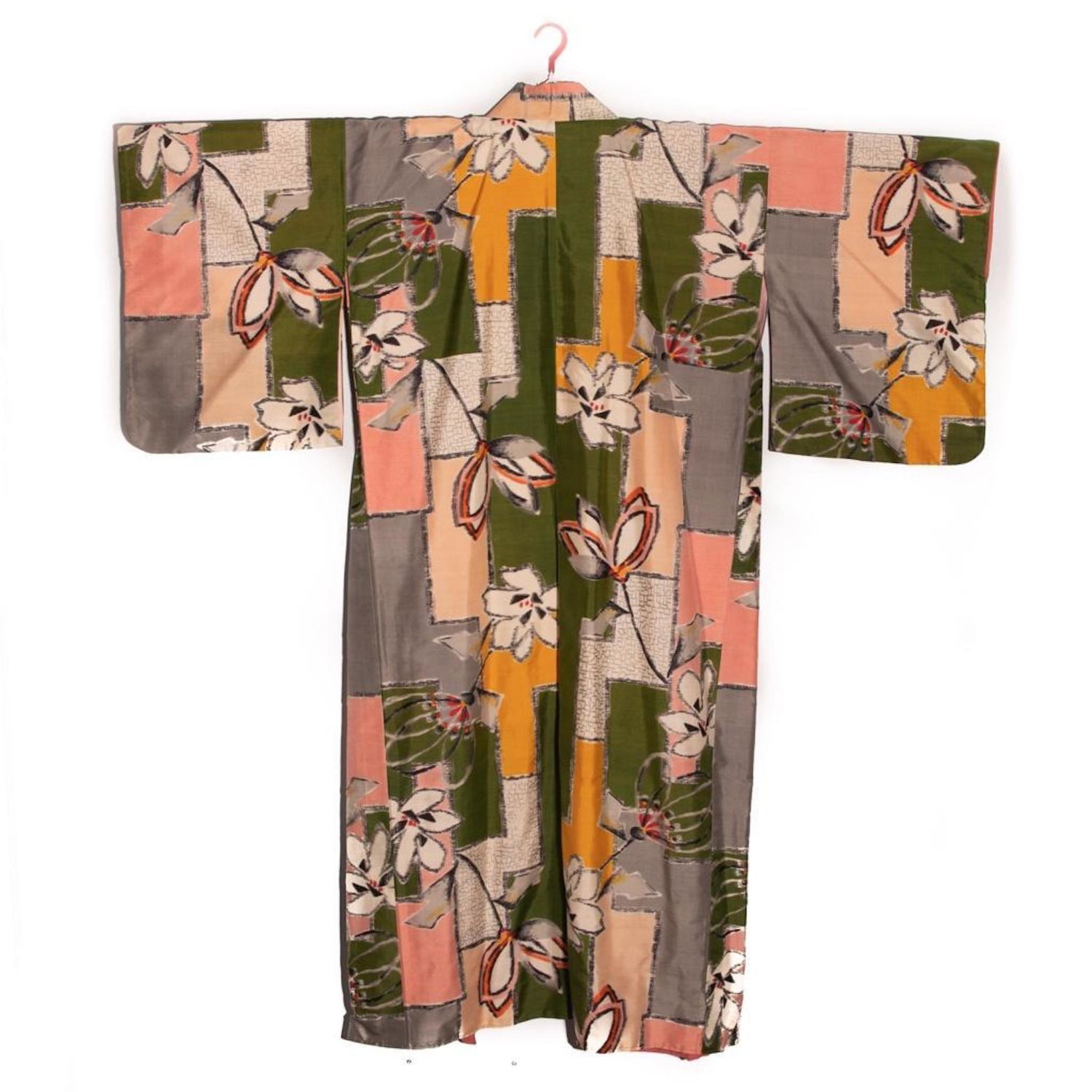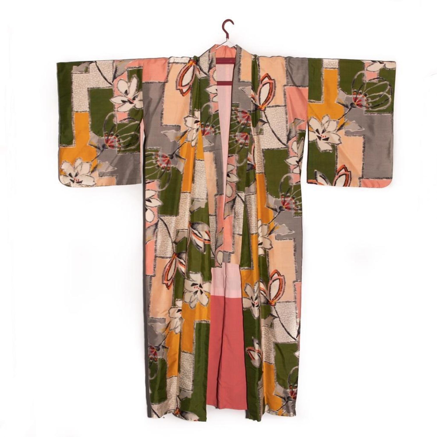 japanese 1930s vintage kasuri ikat handwoven silk kimono in good condition. This kimono features an abstract geometric design in green, golden yellow, pink, peach, off-white and gray; accented with a floral motif. It is lined in pink and coral silk. Some discoloration to lining otherwise good condition 50" sleeve span.., 61" overall length