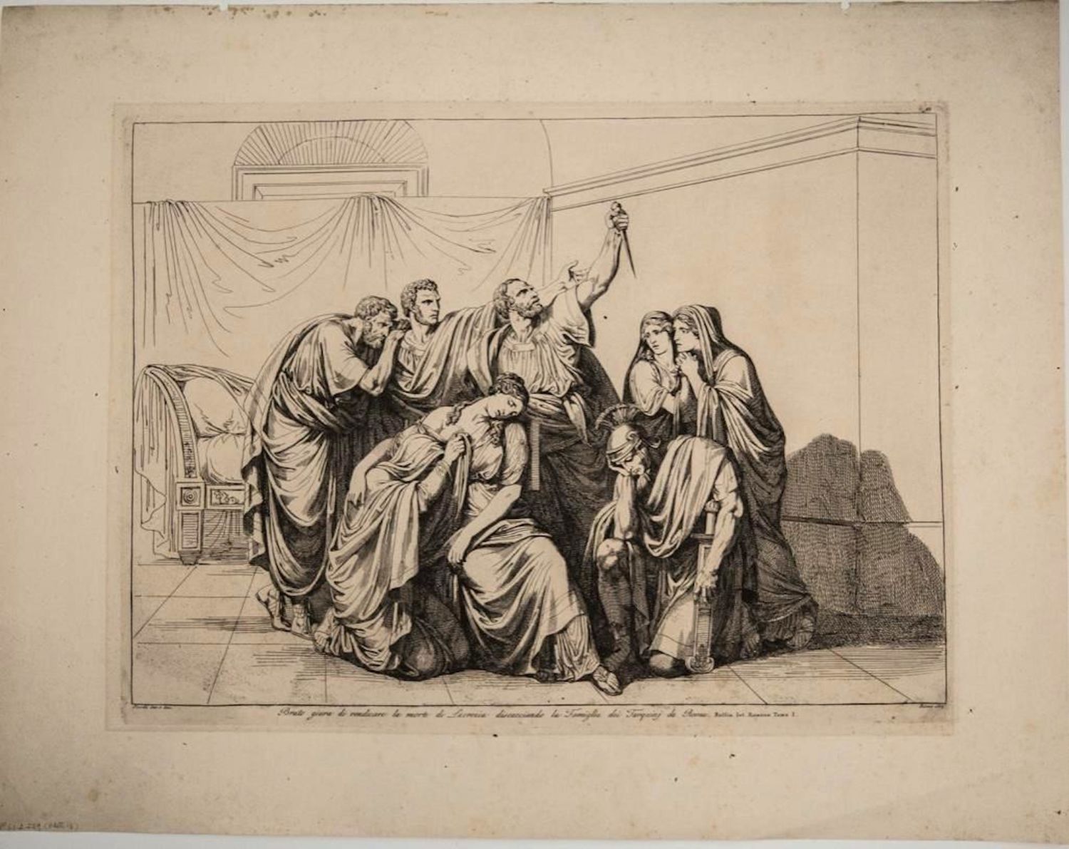 Bartolomeo Pinelli History of Rome Etching on woven paper 1816. Measures Approx 17" x 22". The bottom inscription reads as follows: Bruto giura di vendicare la morte di Lucrezia discacciando la Famiglia di Tarquinj da Roma (Brutus swears to revenge the death of Lucretia and condemns the Tarquini family from Rome). Pinelli was born and died in the Trastevere neighborhood of Rome, the son of an artisan who modeled religious statues.[1] Pinelli was educated first in Bologna and then at the Accademia di San Luca in Rome. He return to live in Trastevere, then a poor quarter of Rome. His initial studio was on Piazza Sciarra on the Corso. His son, Achille Pinelli, was a famous watercolorist in his own right. An extremely prolific engraver, his illustrations depicted the costumes of the Italian people, the great epic poems and numerous other subjects, including popular customs. In general, the most recurring subject is Rome, the ancient city as well as the modern one: its inhabitants and its monuments. Please see photos for condition. some staining but overall good condition