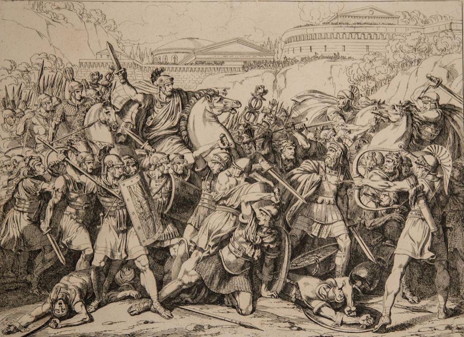 Barolomeo Pinelli History of Rome Etchings on woven paper by Bartolomeo Pinelli 1816. Measures Approx 17" x 22". The bottom inscription reads as follows: "Furio Camillo libera Roma, dai Galli"(Furio Camillo frees Rome from the Gauls). Pinelli was born and died in the Trastevere neighborhood of Rome, the son of an artisan who modeled religious statues.[1] Pinelli was educated first in Bologna and then at the Accademia di San Luca in Rome. He return to live in Trastevere, then a poor quarter of Rome. His initial studio was on Piazza Sciarra on the Corso. His son, Achille Pinelli, was a famous watercolorist in his own right. An extremely prolific engraver, his illustrations depicted the costumes of the Italian people, the great epic poems and numerous other subjects, including popular customs. In general, the most recurring subject is Rome, the ancient city as well as the modern one: its inhabitants and its monuments. Please see photos for condition. Obvious staining.overall good condition