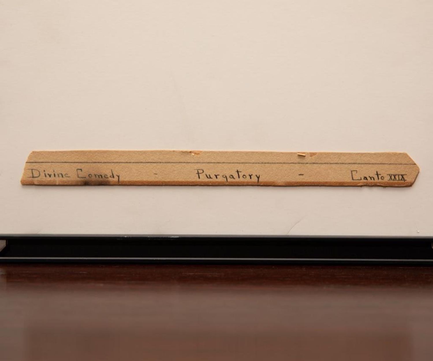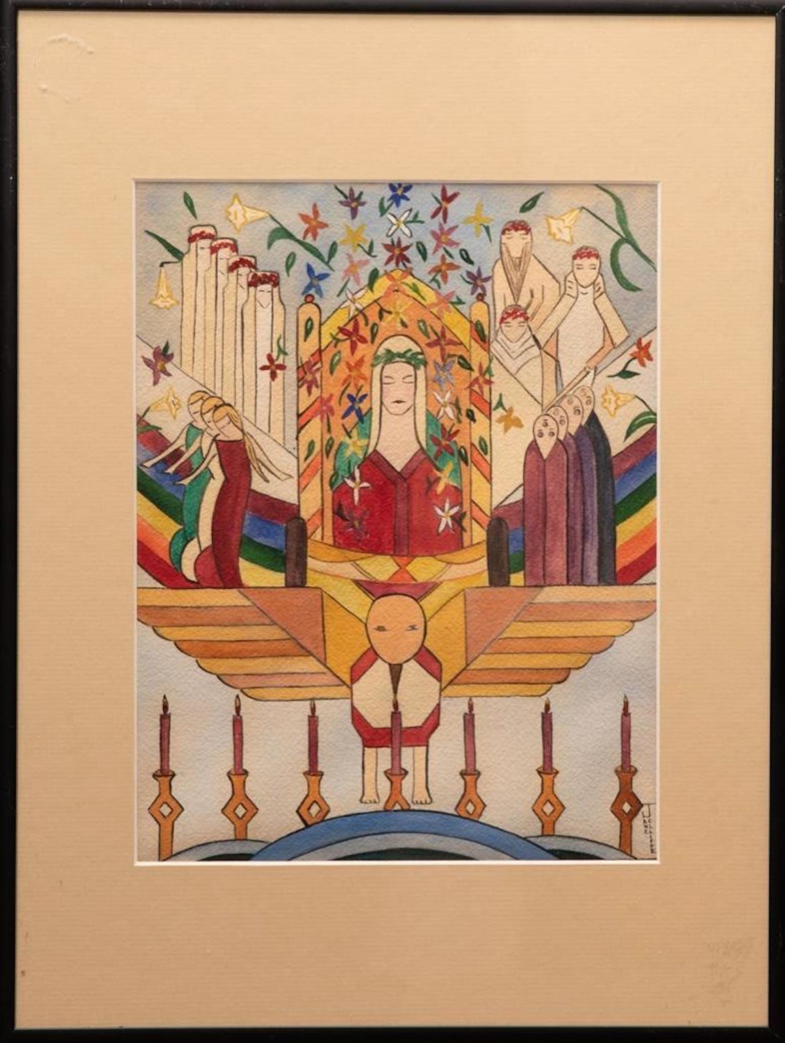 Art Deco watercolor scene from Dante’s Divine Comedy. signed. 12" x 16" framed 8" x 10.5" Framed approx. overall good condition